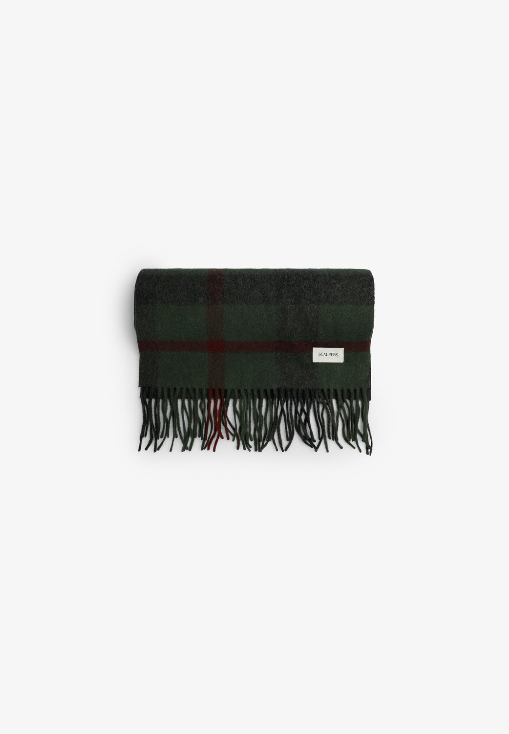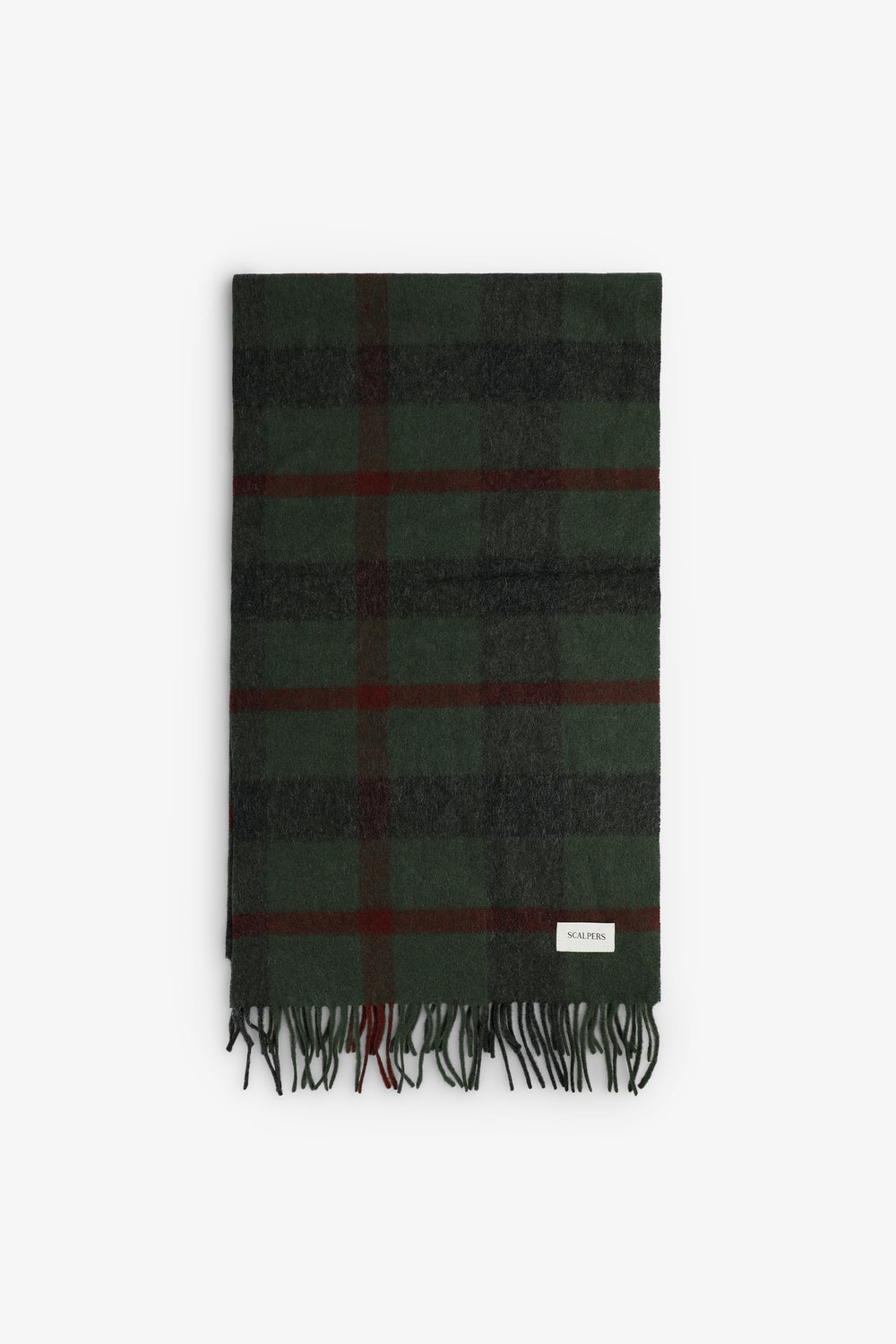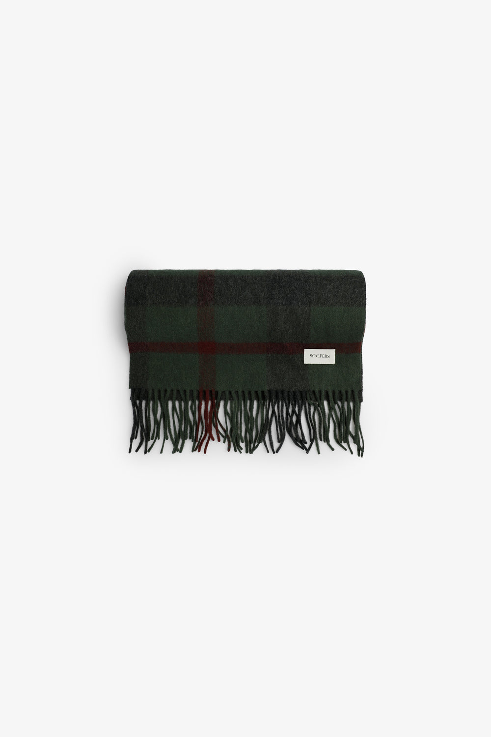 Bufanda confeccionada en mezcla de lana y cashmere. Estampado tartán. Flecos. Logotipo bordado. Detalle de etiqueta.