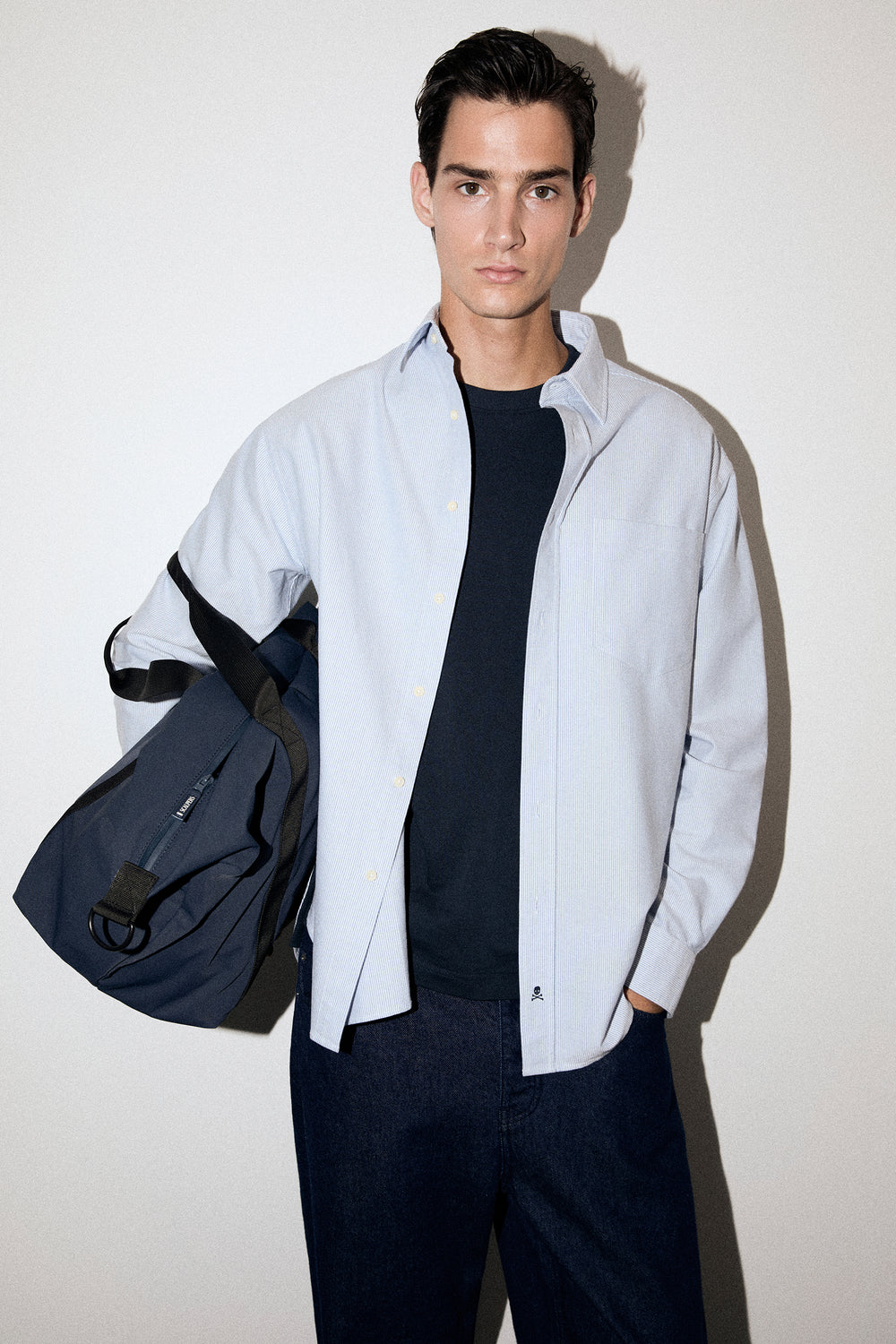 Camisa confeccionada en 100% algodón BCI. Estampado de rayas. Detalle de bolsillo en pecho. Manga larga. Cierre frontal y en puños mediante abotonadura. Detalle de calavera bordada a contraste en la parte inferior frontal.