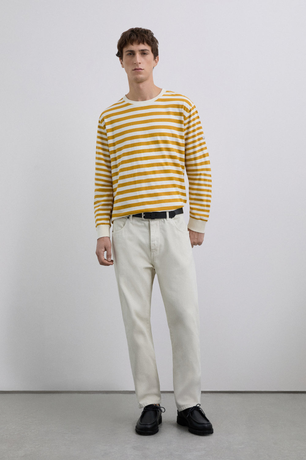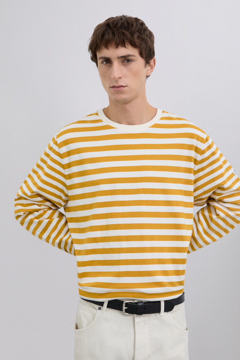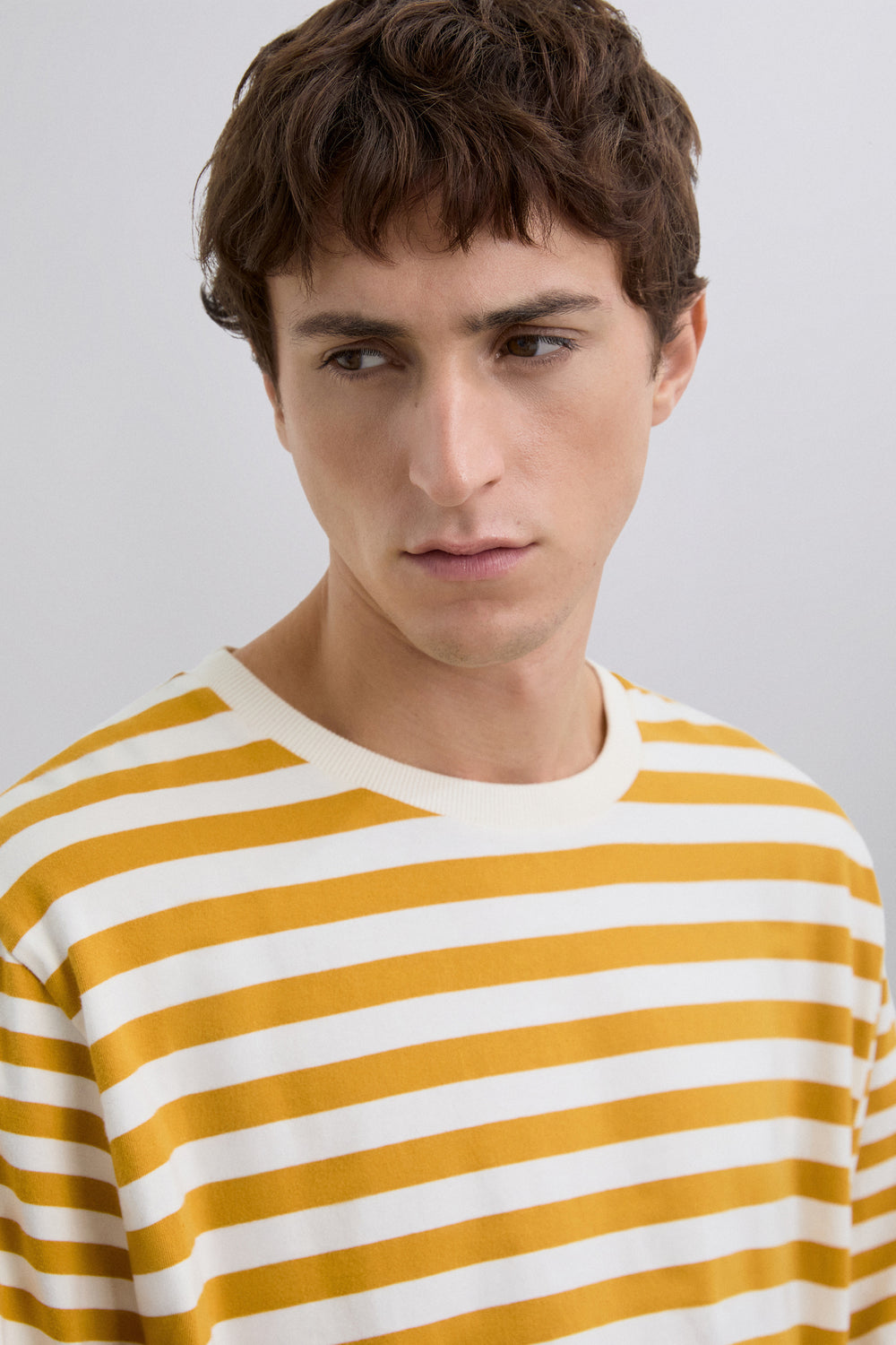 Camiseta con estampado de rayas. Confeccionada en 100% algodón BCI. Corte Regular Fit. Cuello redondo. Contraste en cuello y puños. Manga larga.