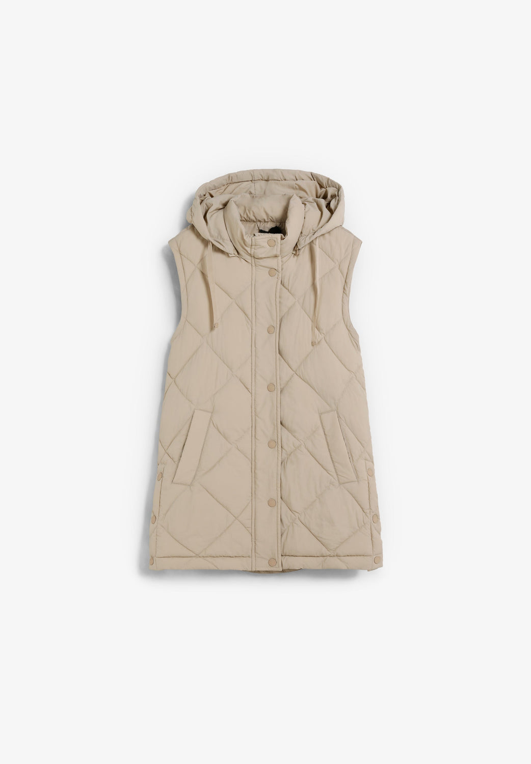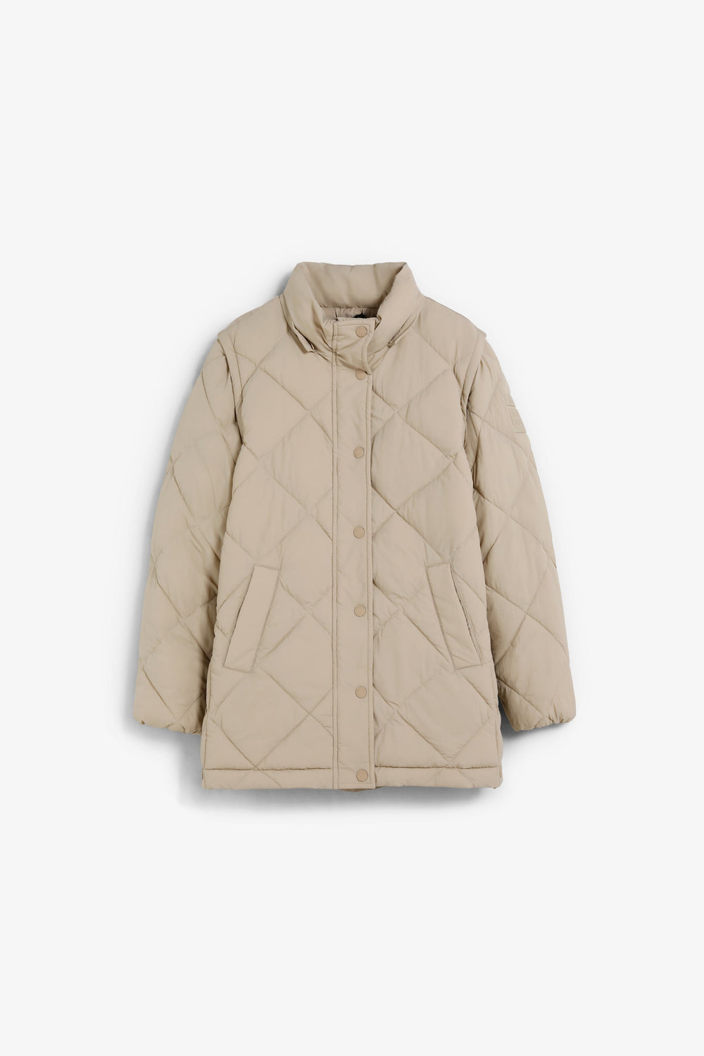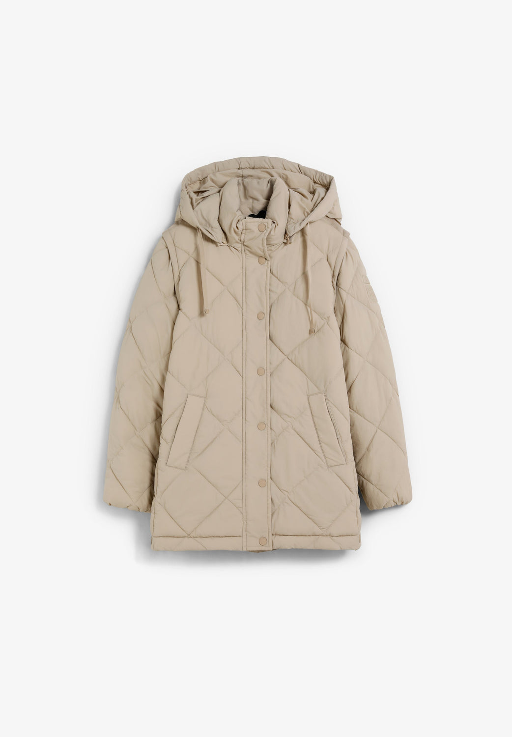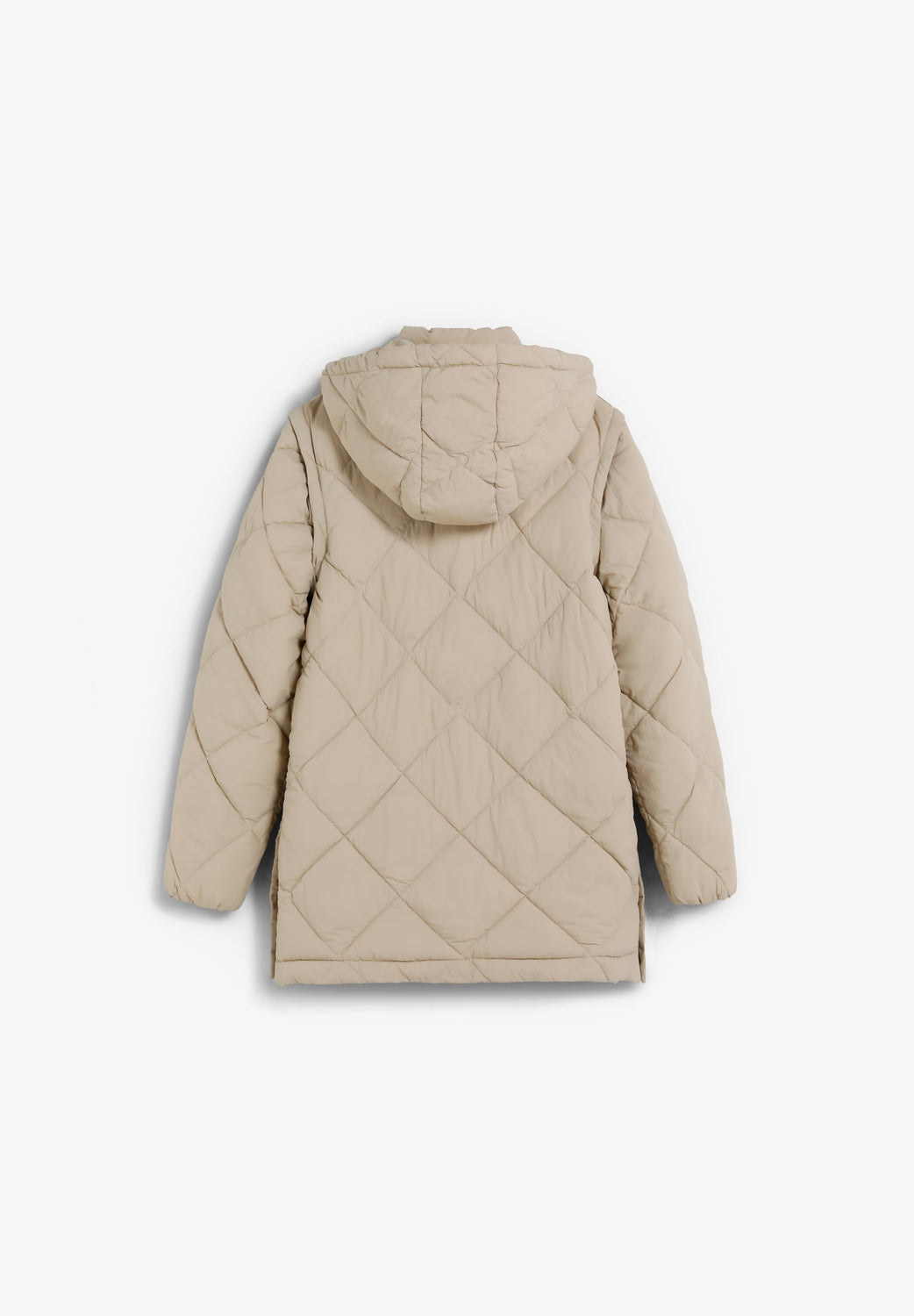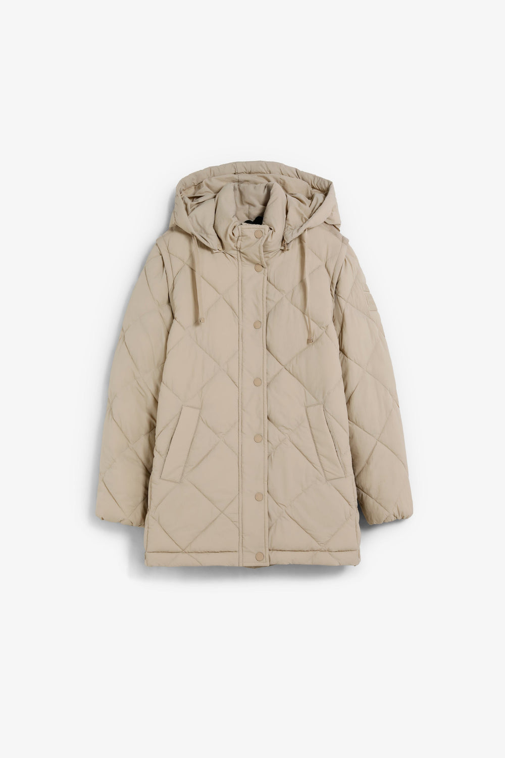 Abrigo acolchado. Capucha y Mangas desmontables. Cierre cremallera frontal oculta por solapa con cierre botones tipo presión. Bolsillos laterales. Forro interior reciclado. Detalle de logo en espalda.