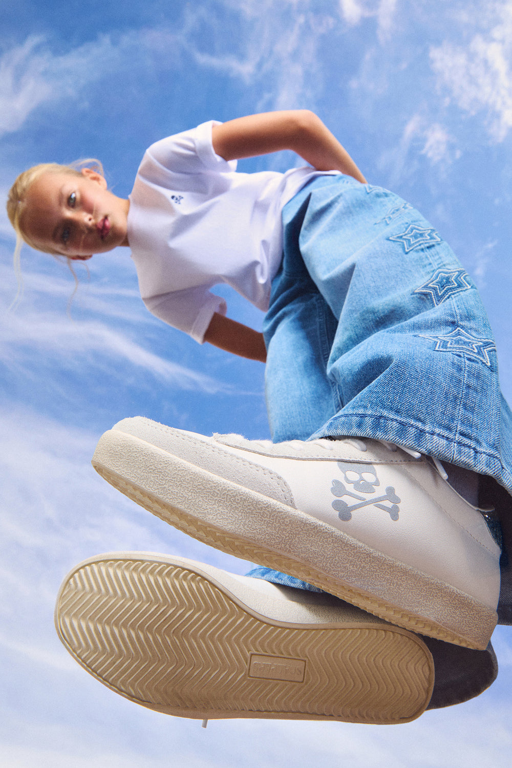 Sneakers bajas con calavera lateral a contraste. Suela de goma. Cierre con cordones. Talón con glitter a contraste.