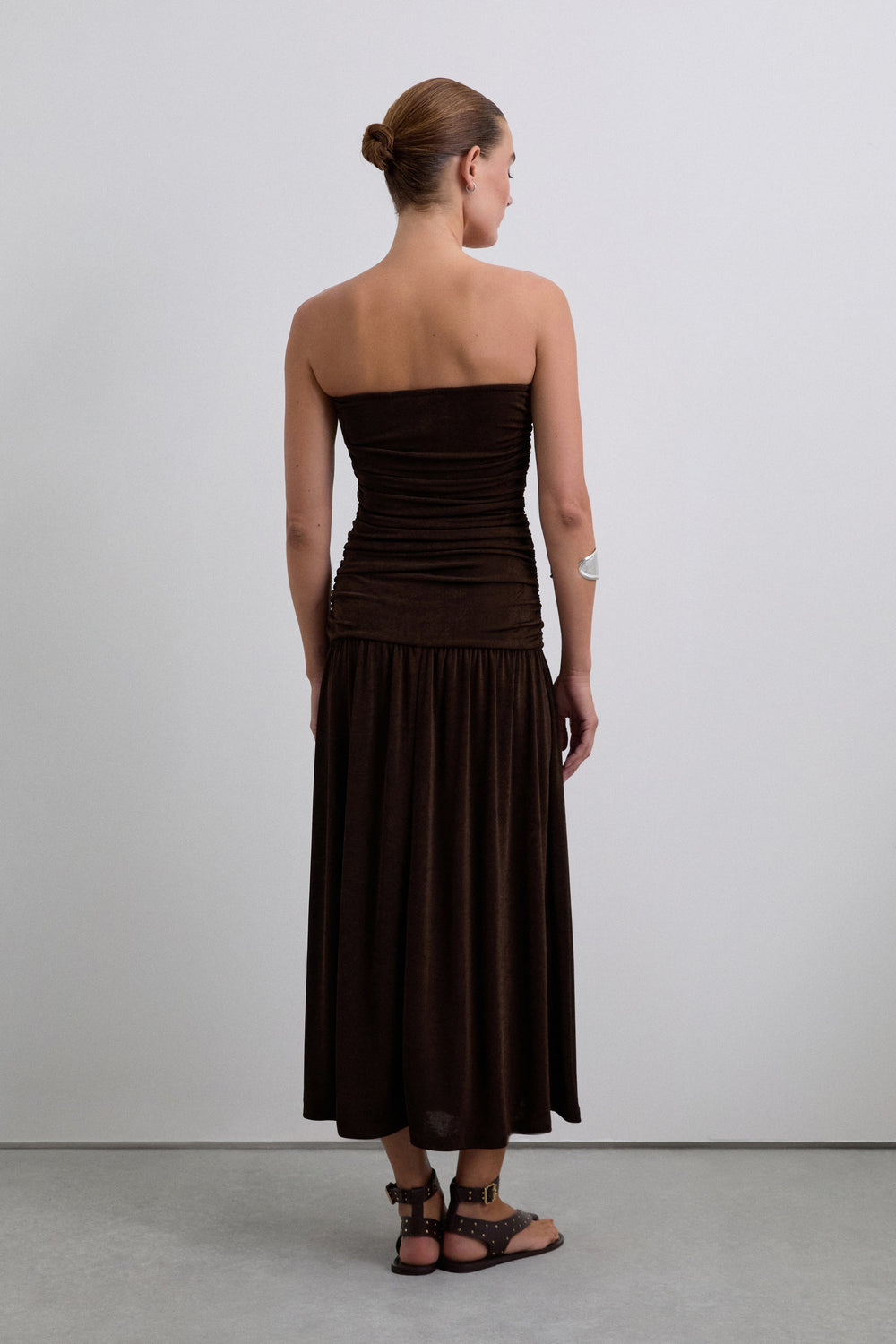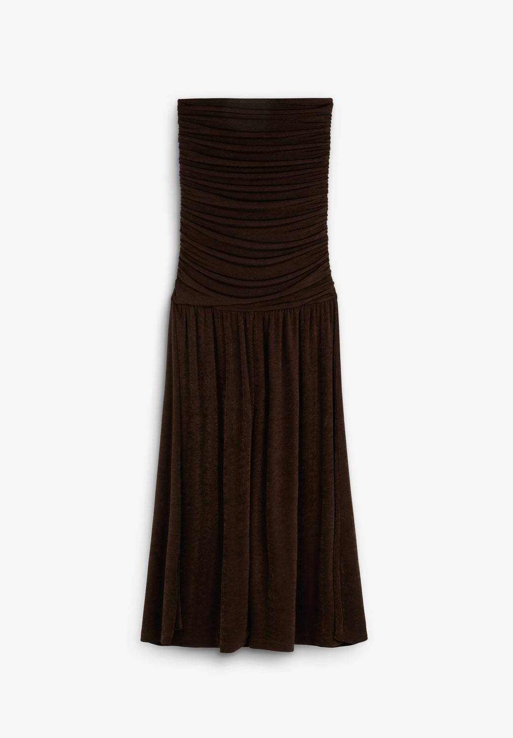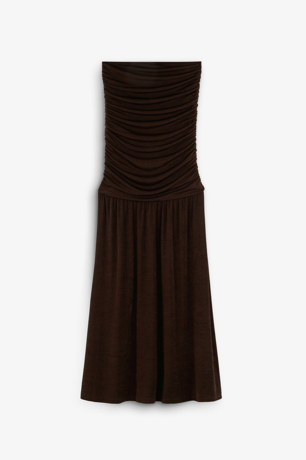Vestido confeccionado en punto fino ligeramente elástico. Corte slim fit, strapless, cuerpo con detalle de frunces. Corte midi.