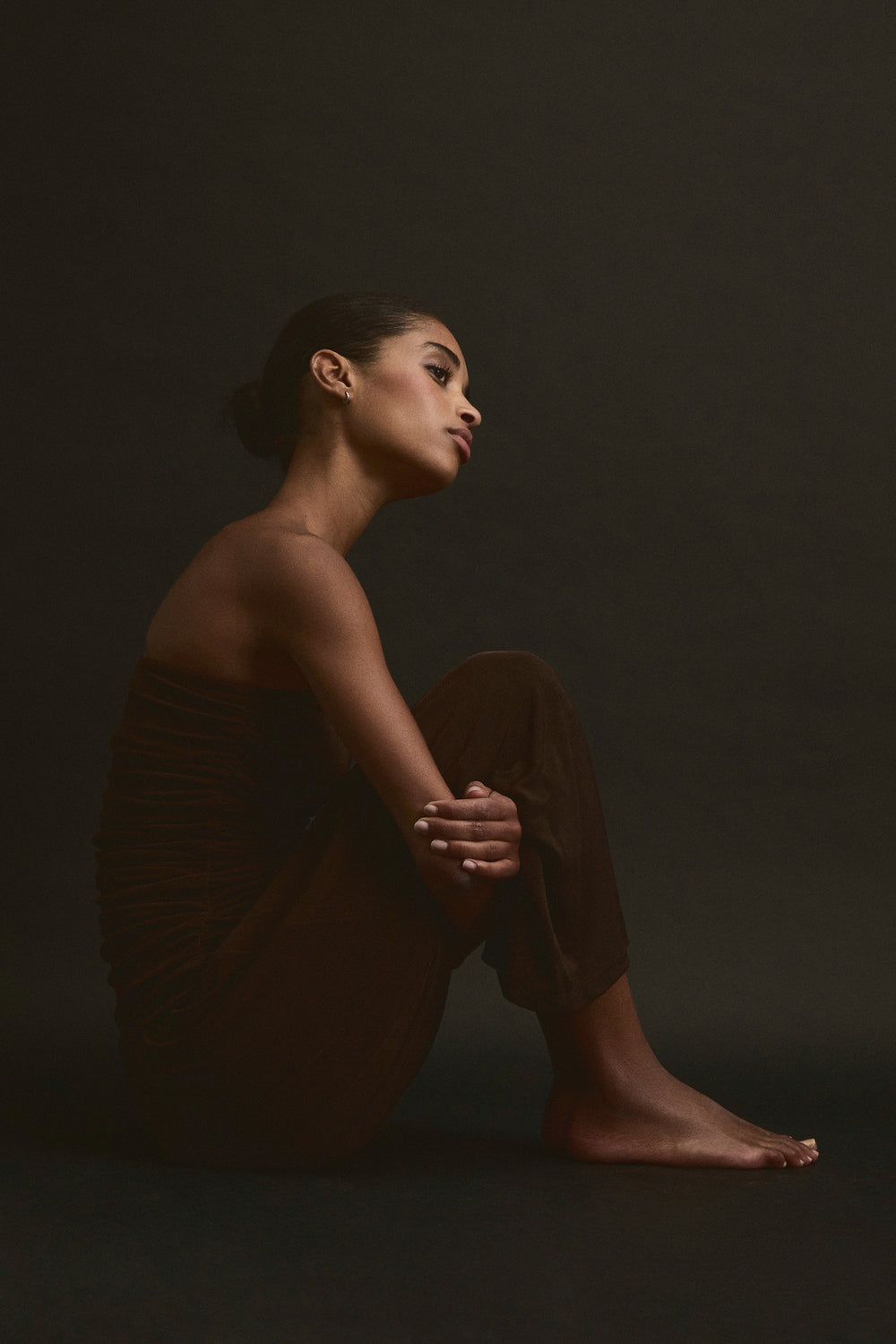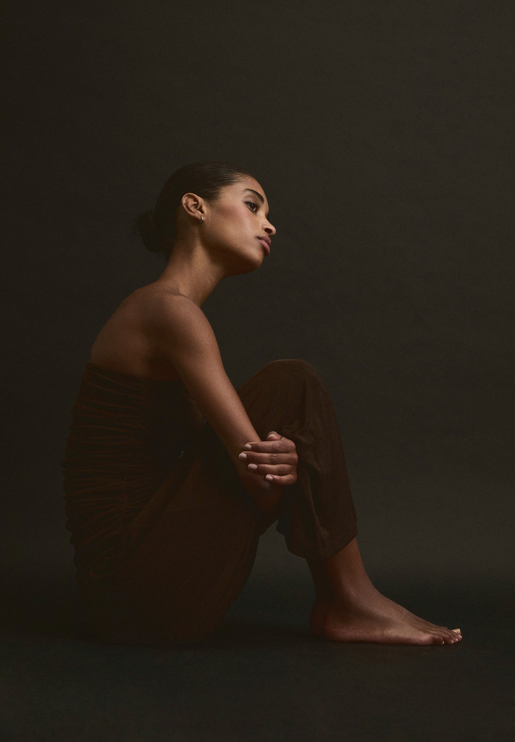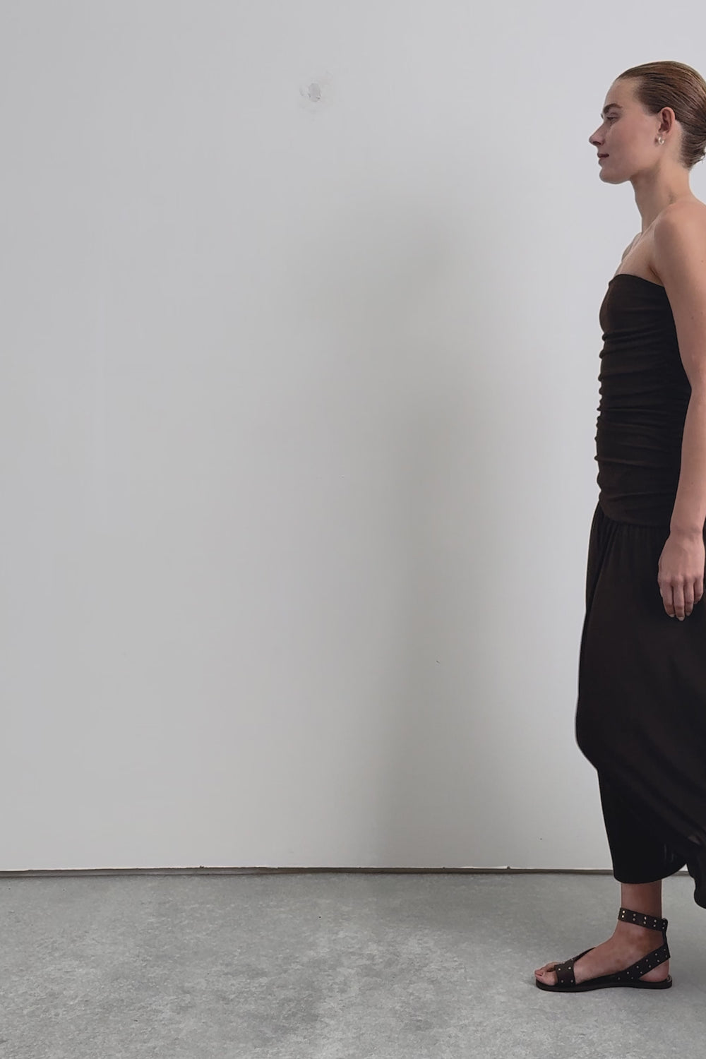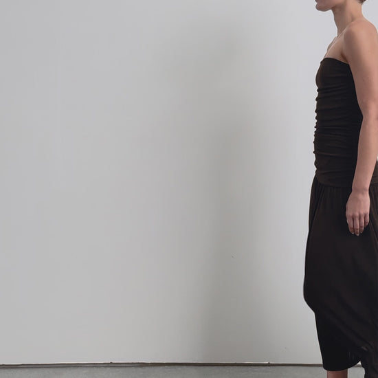 Vestido confeccionado en punto fino ligeramente elástico. Corte slim fit, strapless, cuerpo con detalle de frunces. Corte midi.