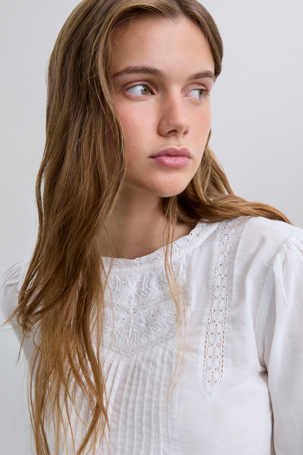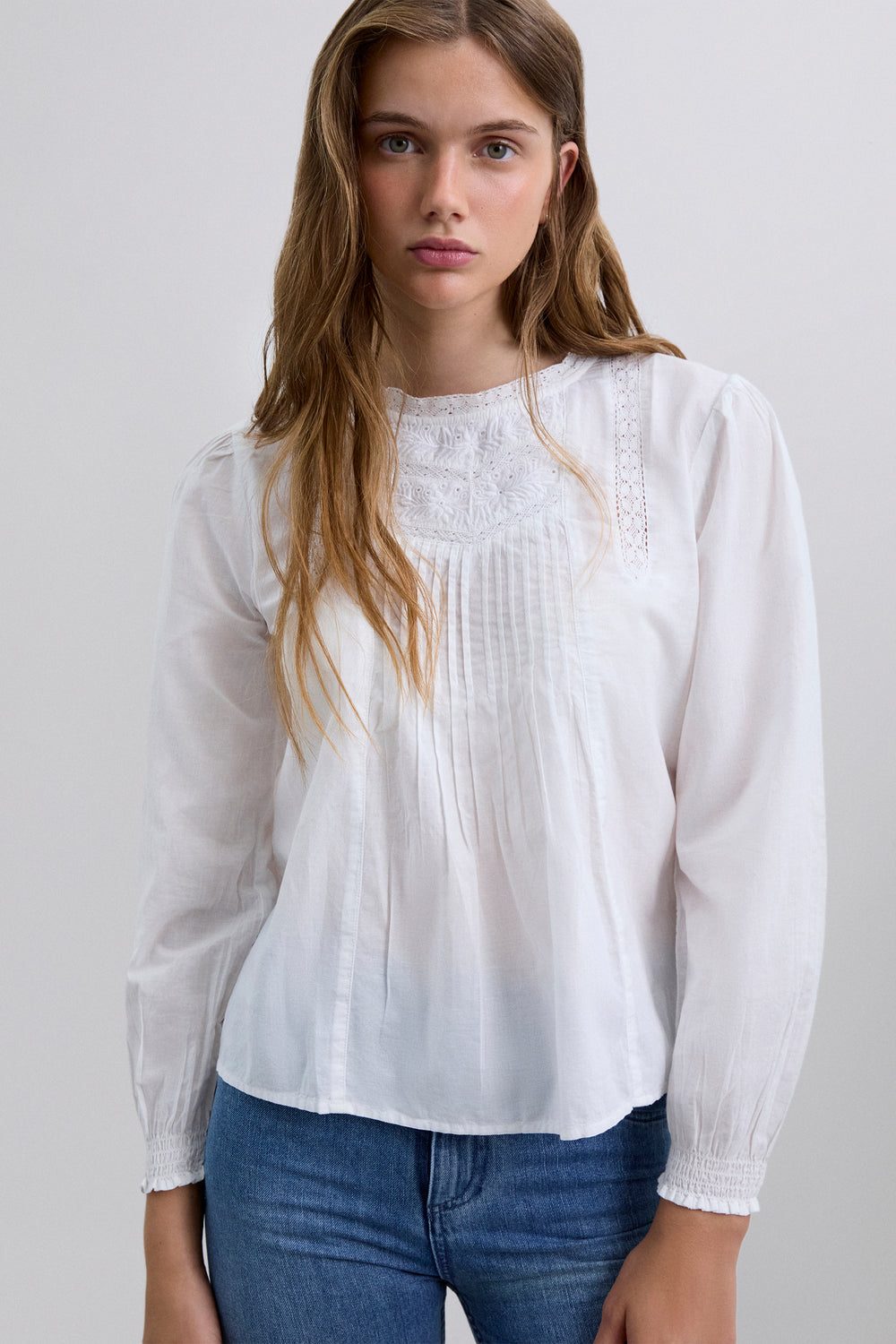 Blusa confeccionada en 100% algodón BCI. Regular fit. Cuello redondo. Manga larga abullonada terminada en elástico. Detalle metálico de calavera en cintura. Detalles bordados en cuello y frontal. Cierre trasero con botón.