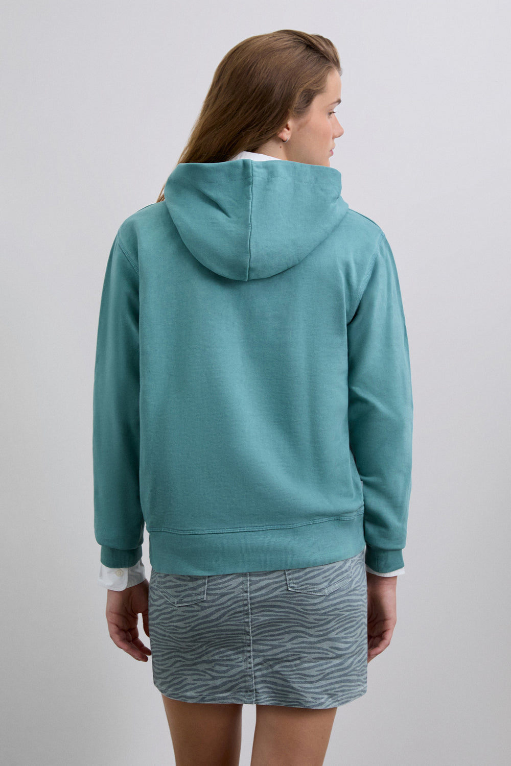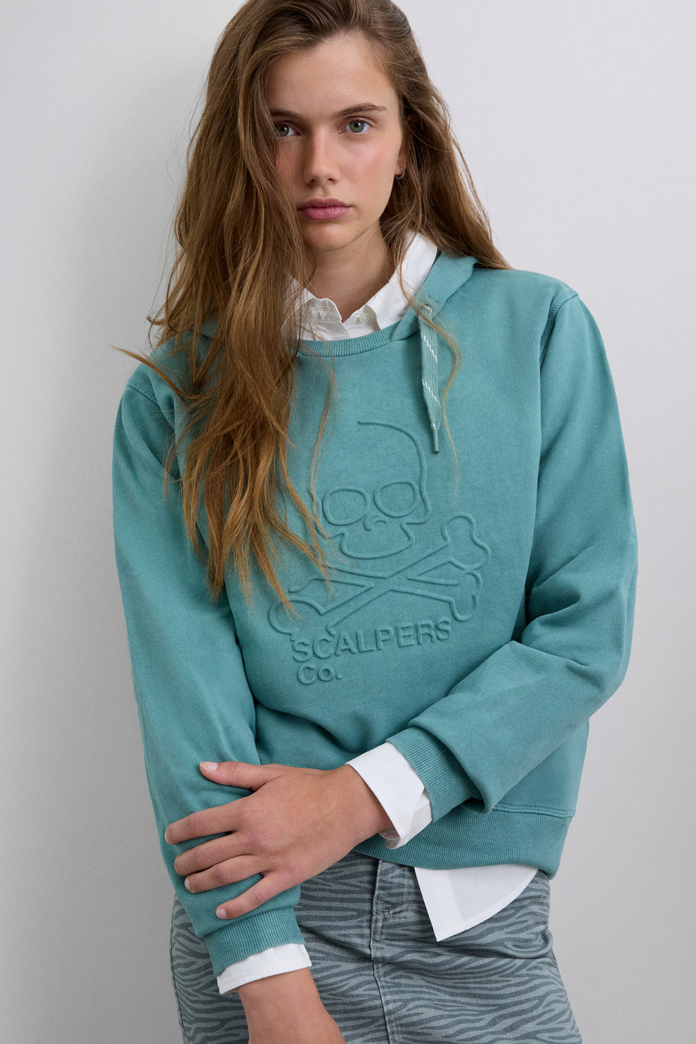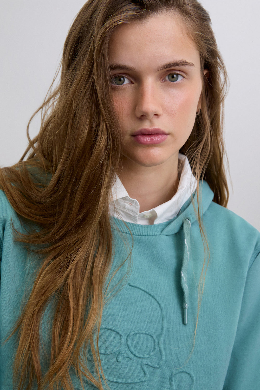 Sudadera con capucha ajustable confeccionada en 100% algodón BCI. Corte regular fit. Manga larga y cuello redondo. Print calavera frontal a tono. Acabados en rib.