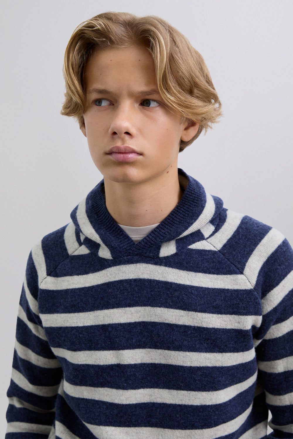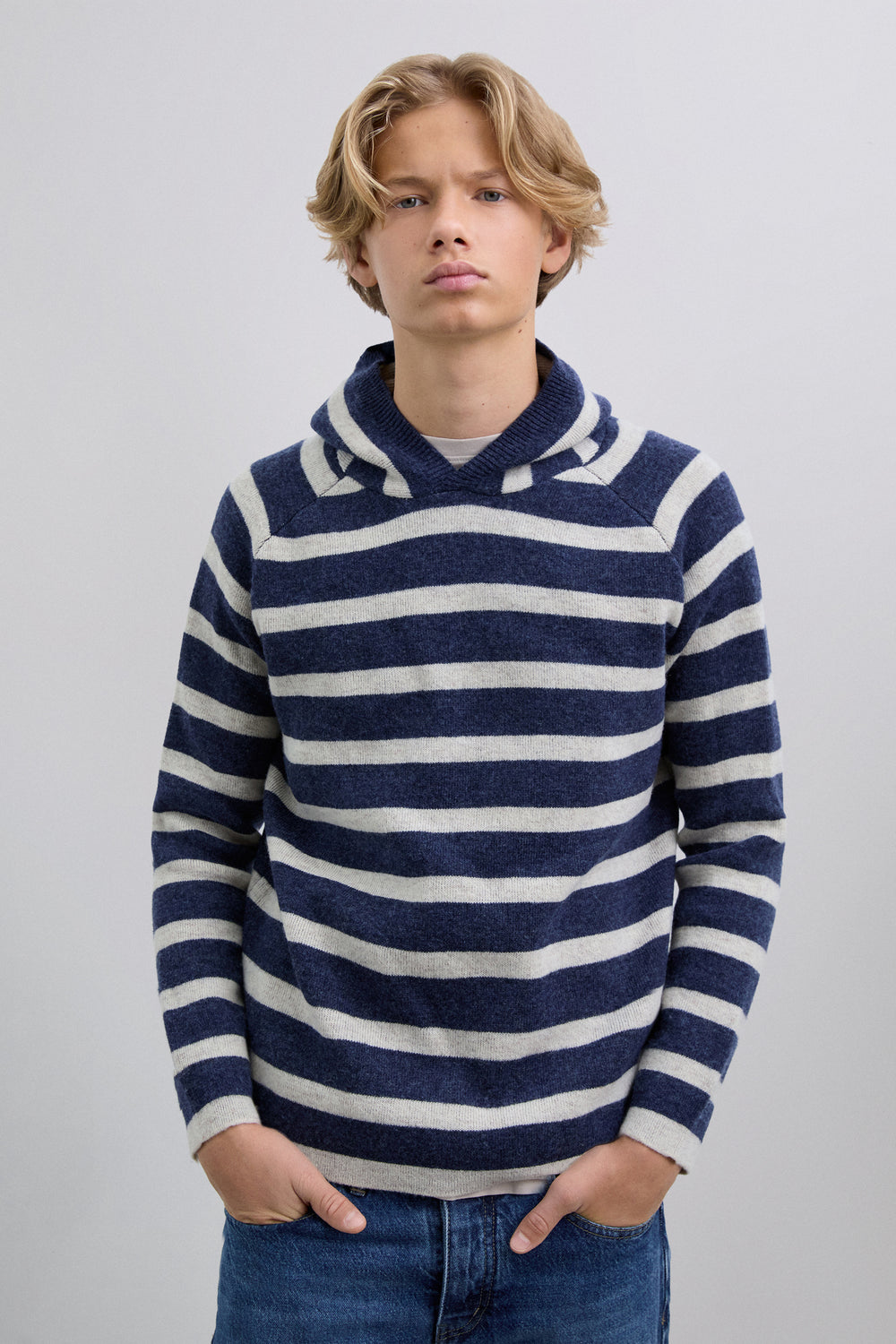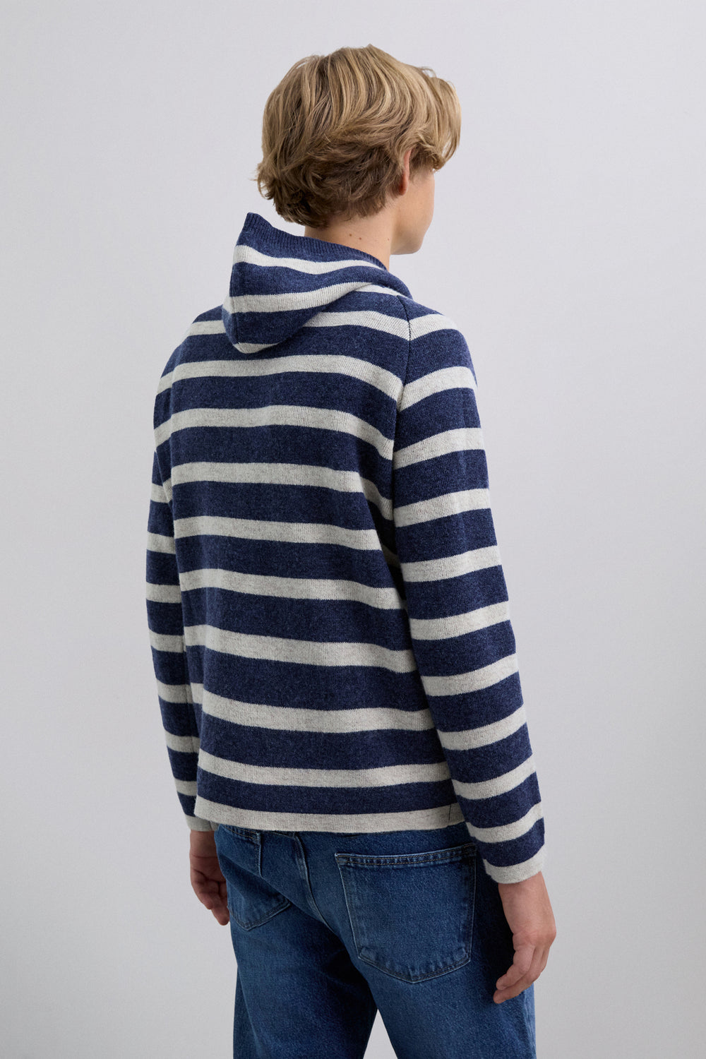 Jersey de punto confeccionado en mezcla de lana con capucha. Estampado de rayas. Manga larga. Calavera bordada a contraste en el bajo.