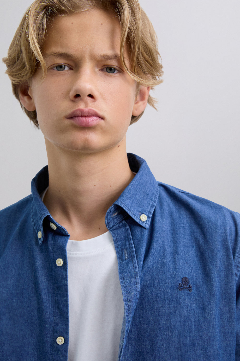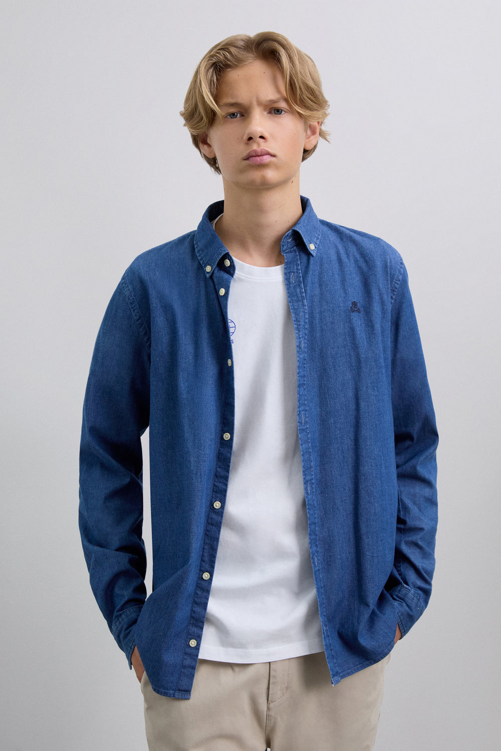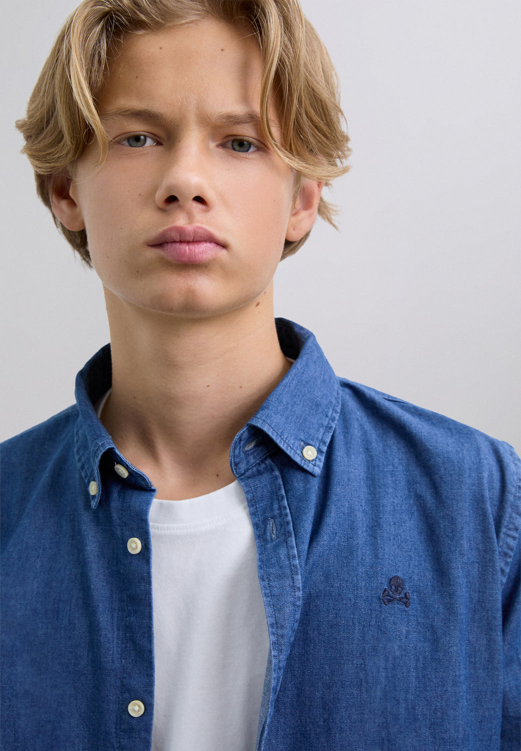 Camisa Oxford confeccionada en algodón BCI. Denim. Regular Fit. Cuello clásico y cierre con botones. Manga larga con puños terminados mediante botón. Calavera bordada en pecho a contraste.