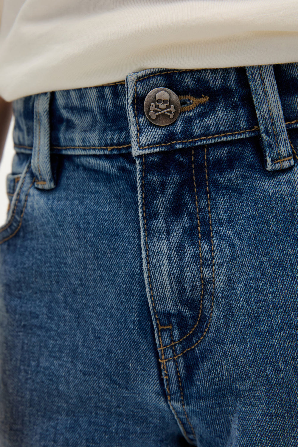 Pantalón vaquero confeccionado en algodón. Regular Fit. Bolsillos delanteros y traseros. Cierre mediante botón y cremallera. Trabillas en cintura. Detalle calavera en botón y etiqueta con logo en bolsillo trasero.