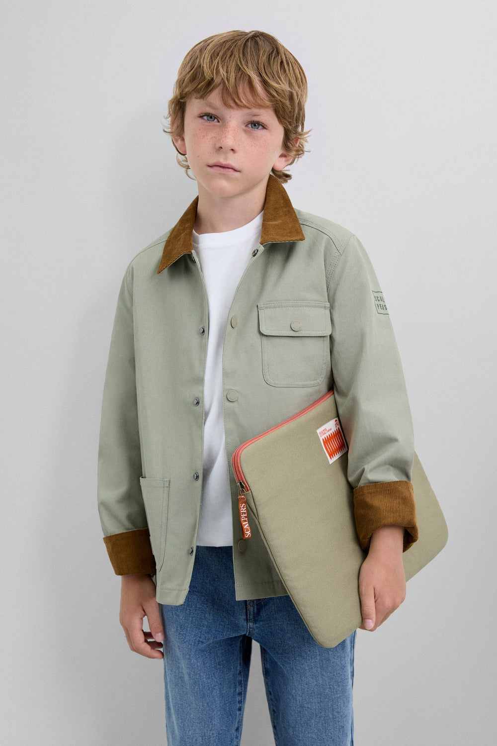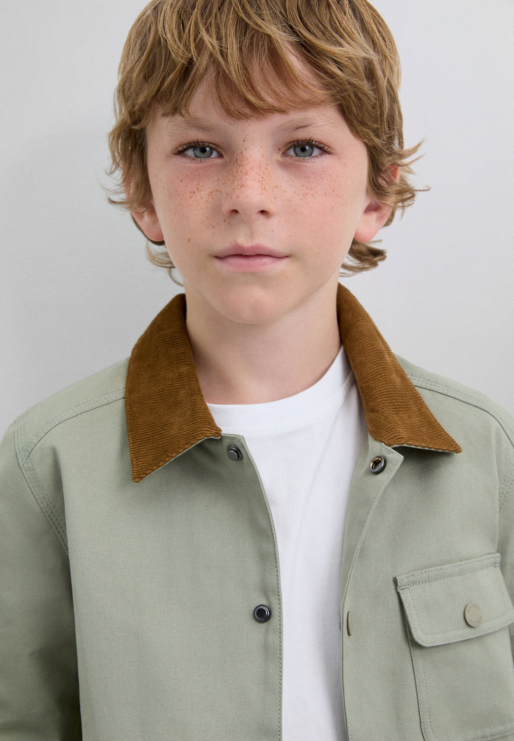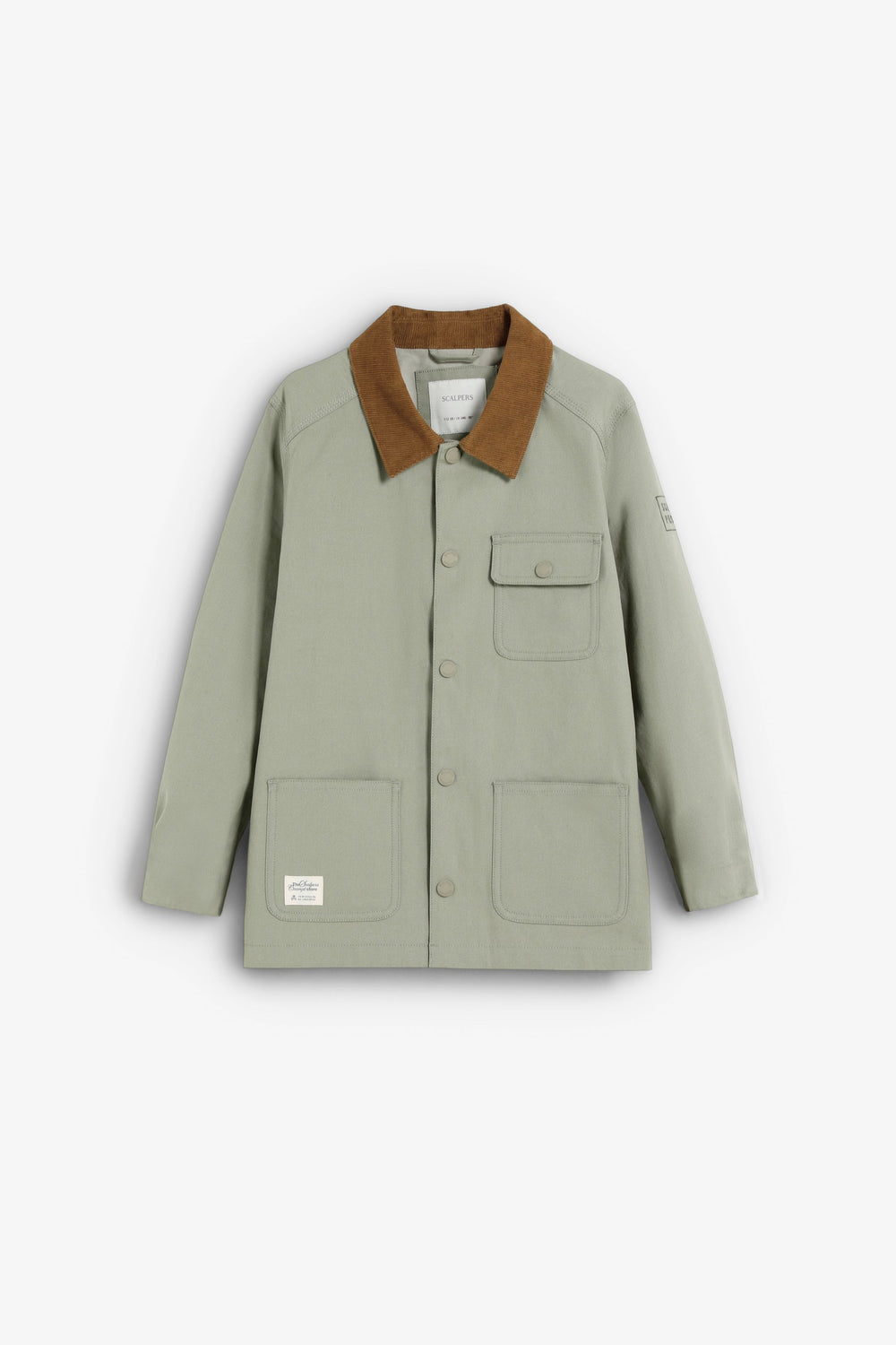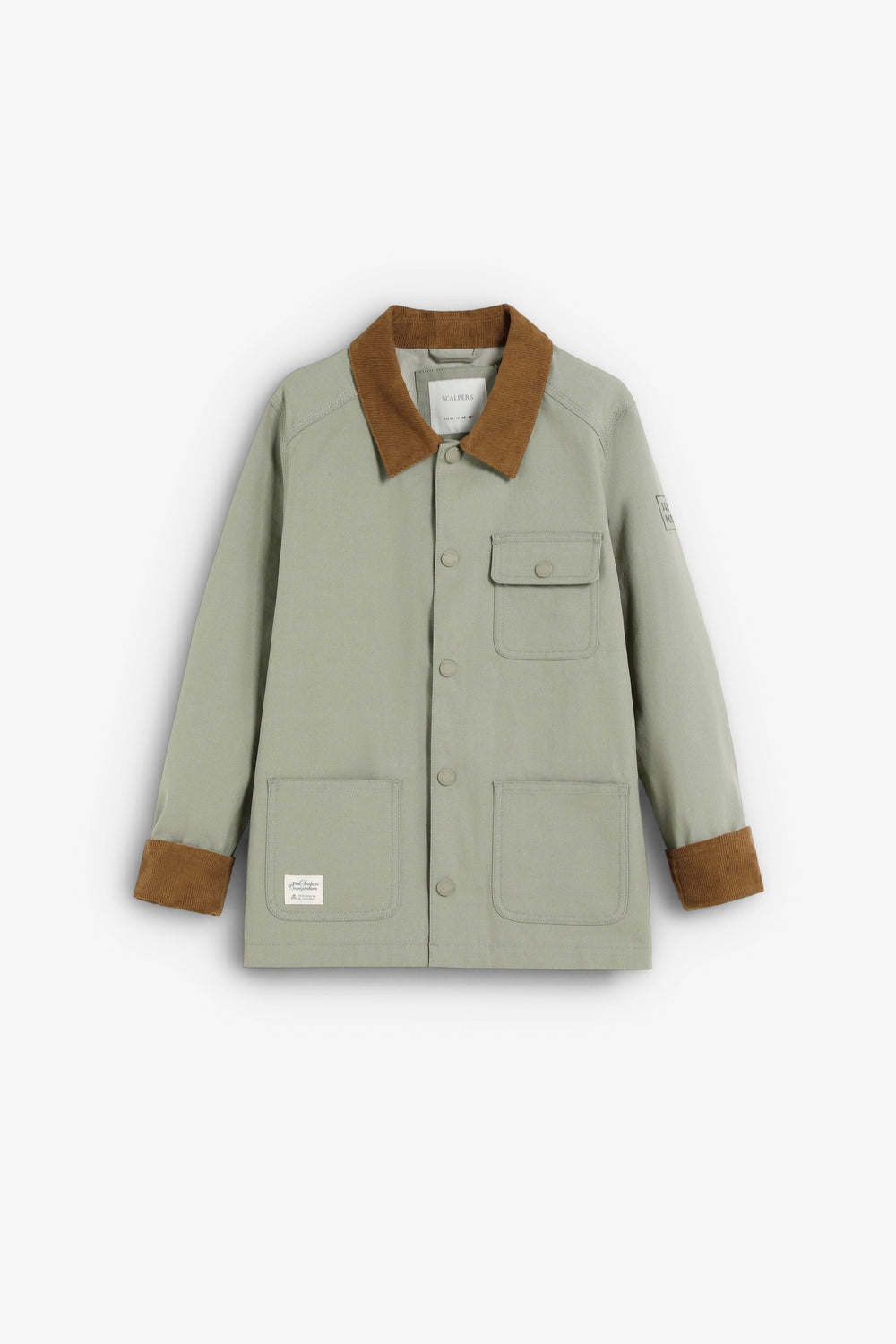 Chaqueta confeccionada en 100% algodón BCI. Cuello camisero a contraste. Manga larga. Cierre mediante botón y cremallera. Bolsillos frontales y en pecho con cierre mediante botón. Detalle de etiqueta con logo en bolsillo frontal.