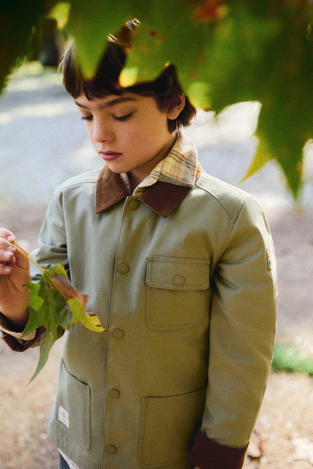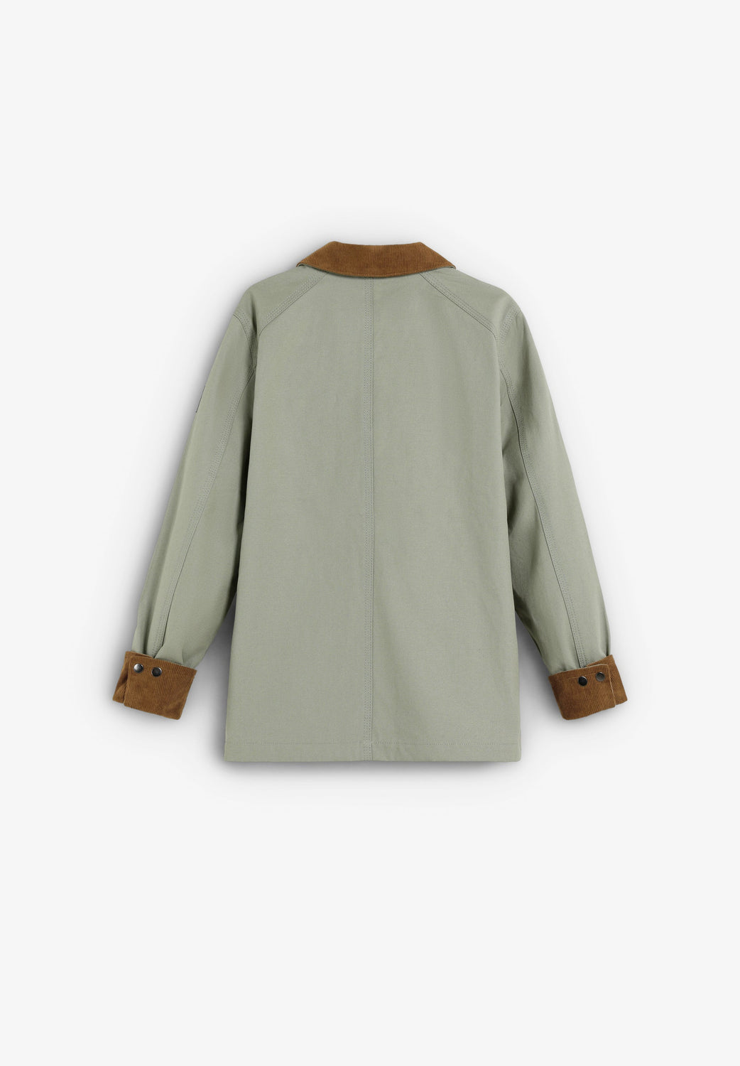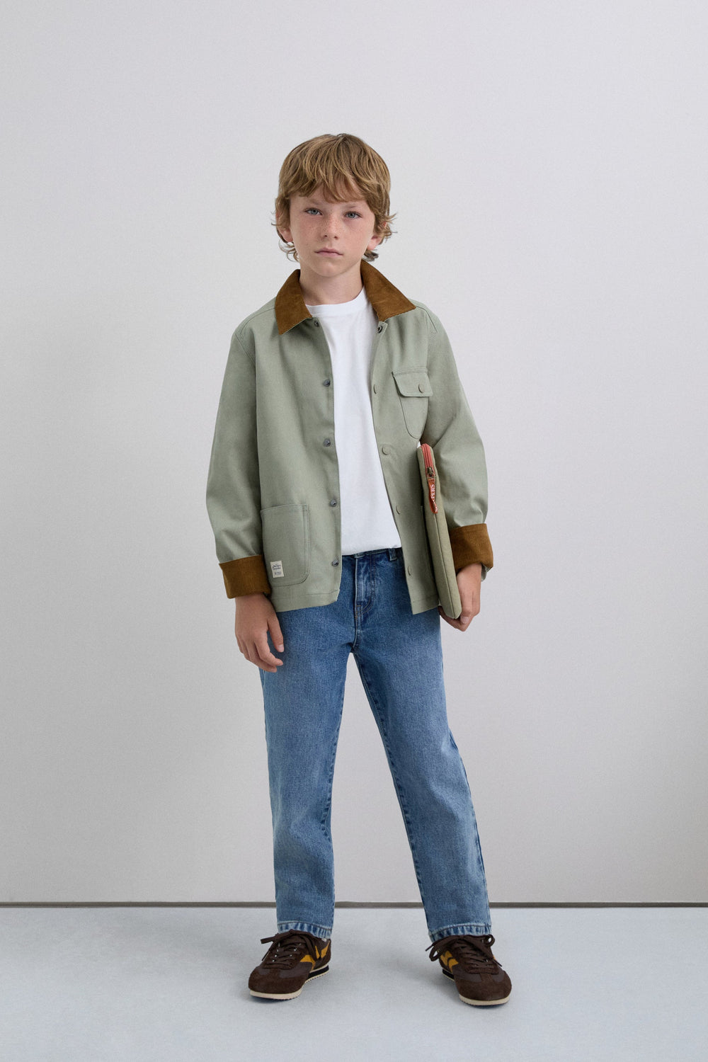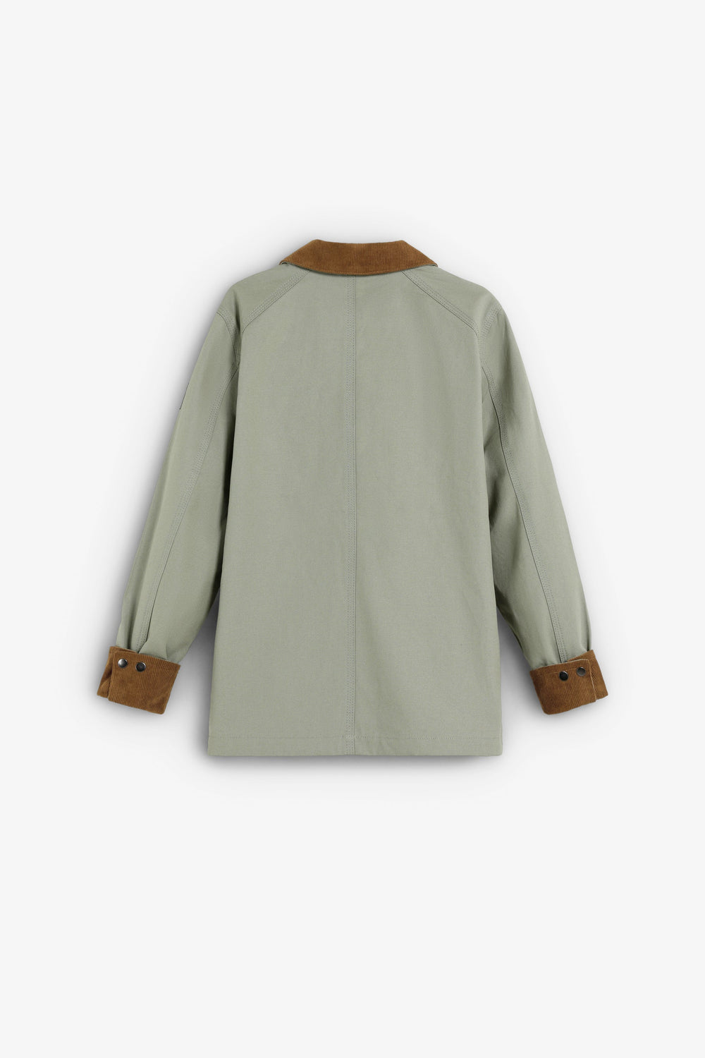 Chaqueta confeccionada en 100% algodón BCI. Cuello camisero a contraste. Manga larga. Cierre mediante botón y cremallera. Bolsillos frontales y en pecho con cierre mediante botón. Detalle de etiqueta con logo en bolsillo frontal.