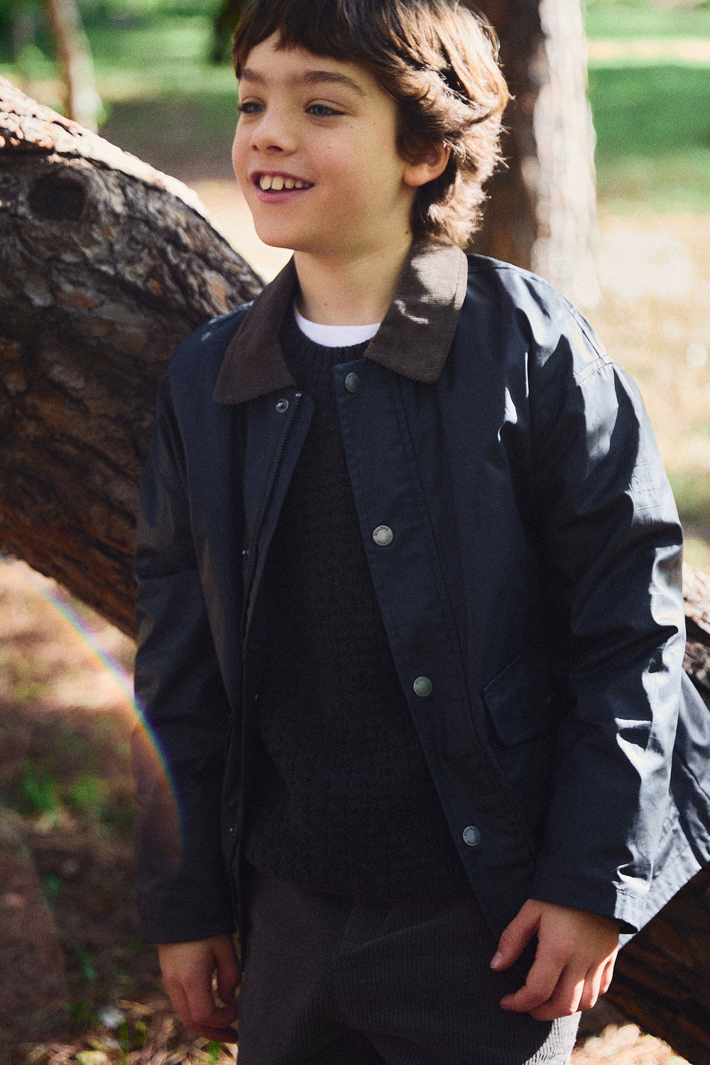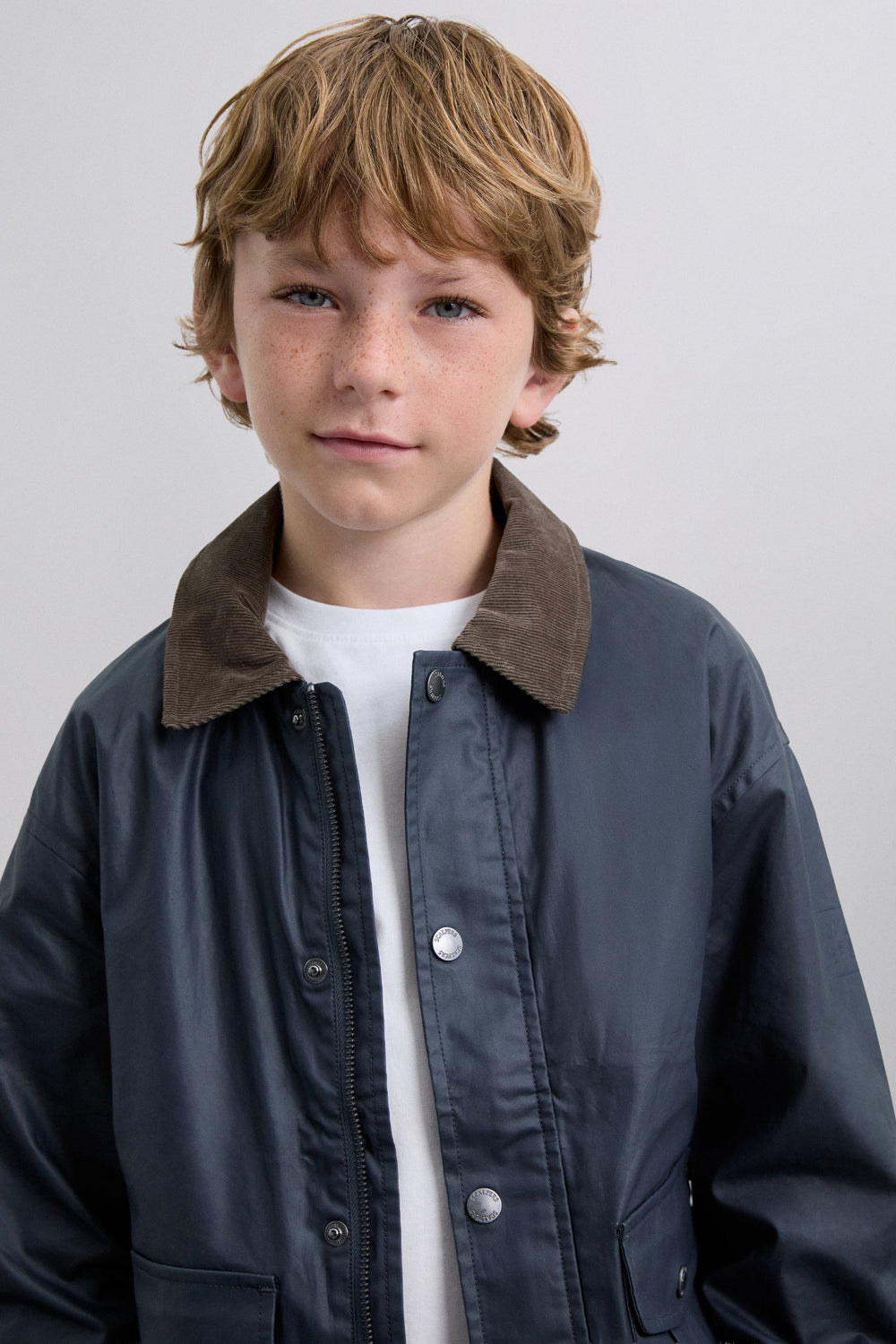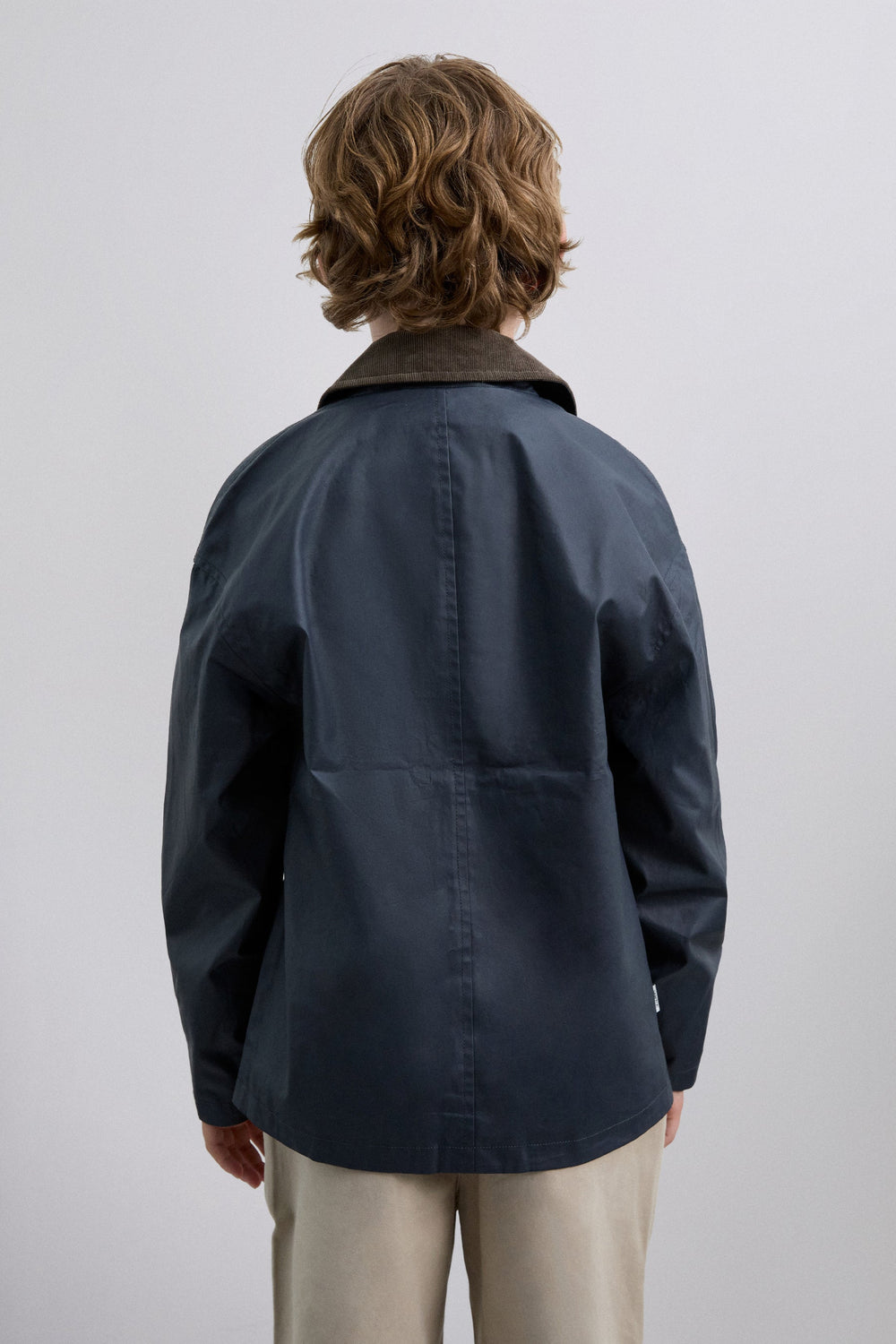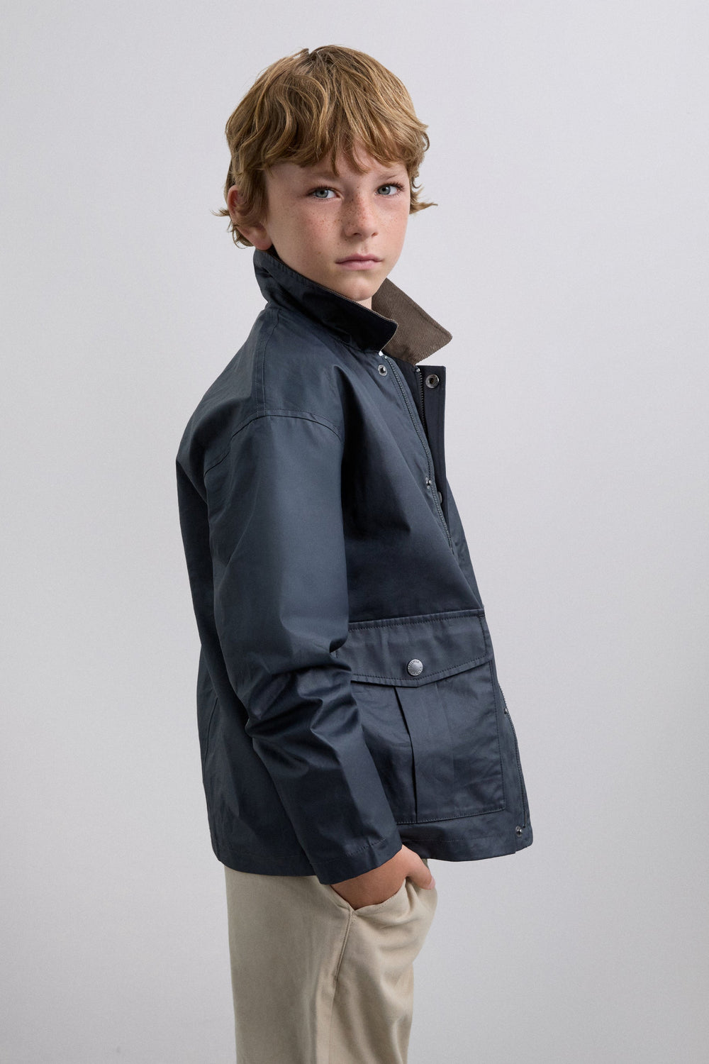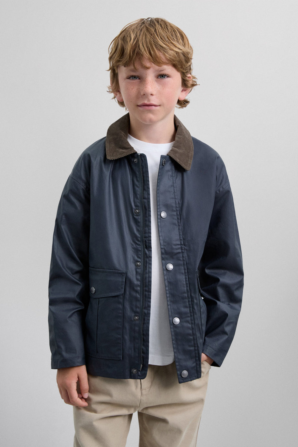 Chaqueta confeccionada en 100% algodón BCI. Cuello de pana a contraste. Regular Fit. Manga larga. Cierre con cremallera y botones. Bolsillos frontales de parche con tapeta con cierre mediante botón.