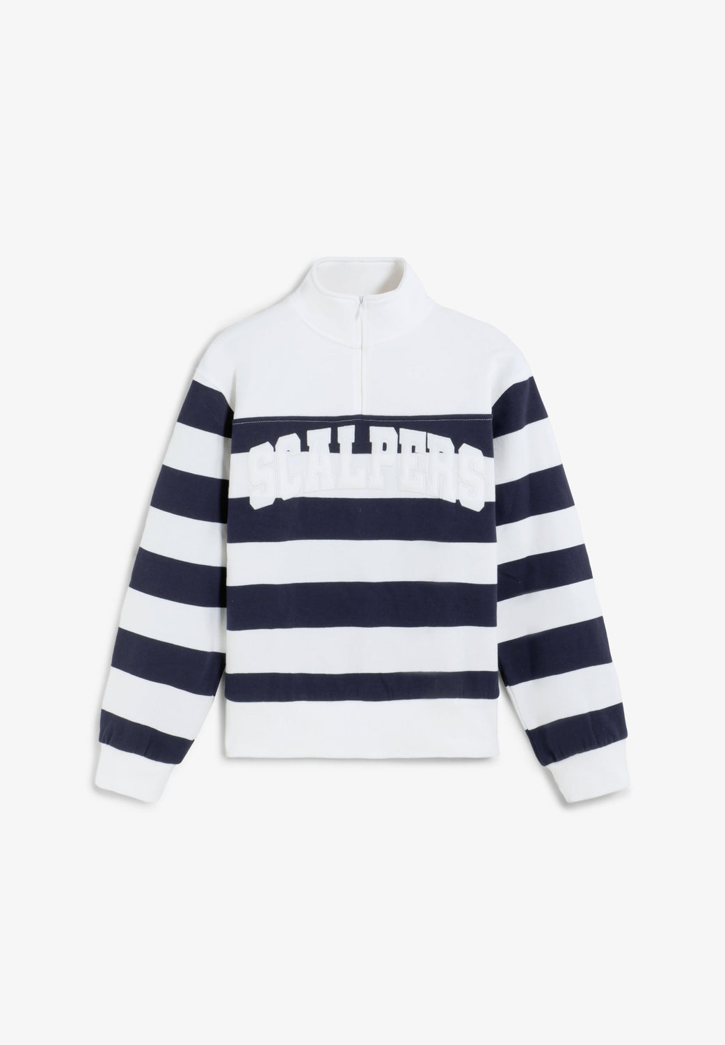Sudadera de rayas confeccionada en mezcla de algodón. Logo bordado en parte delantera. Cuello alto con abertura y cierre de cremallera de un cuarto. Mangas en rib.
