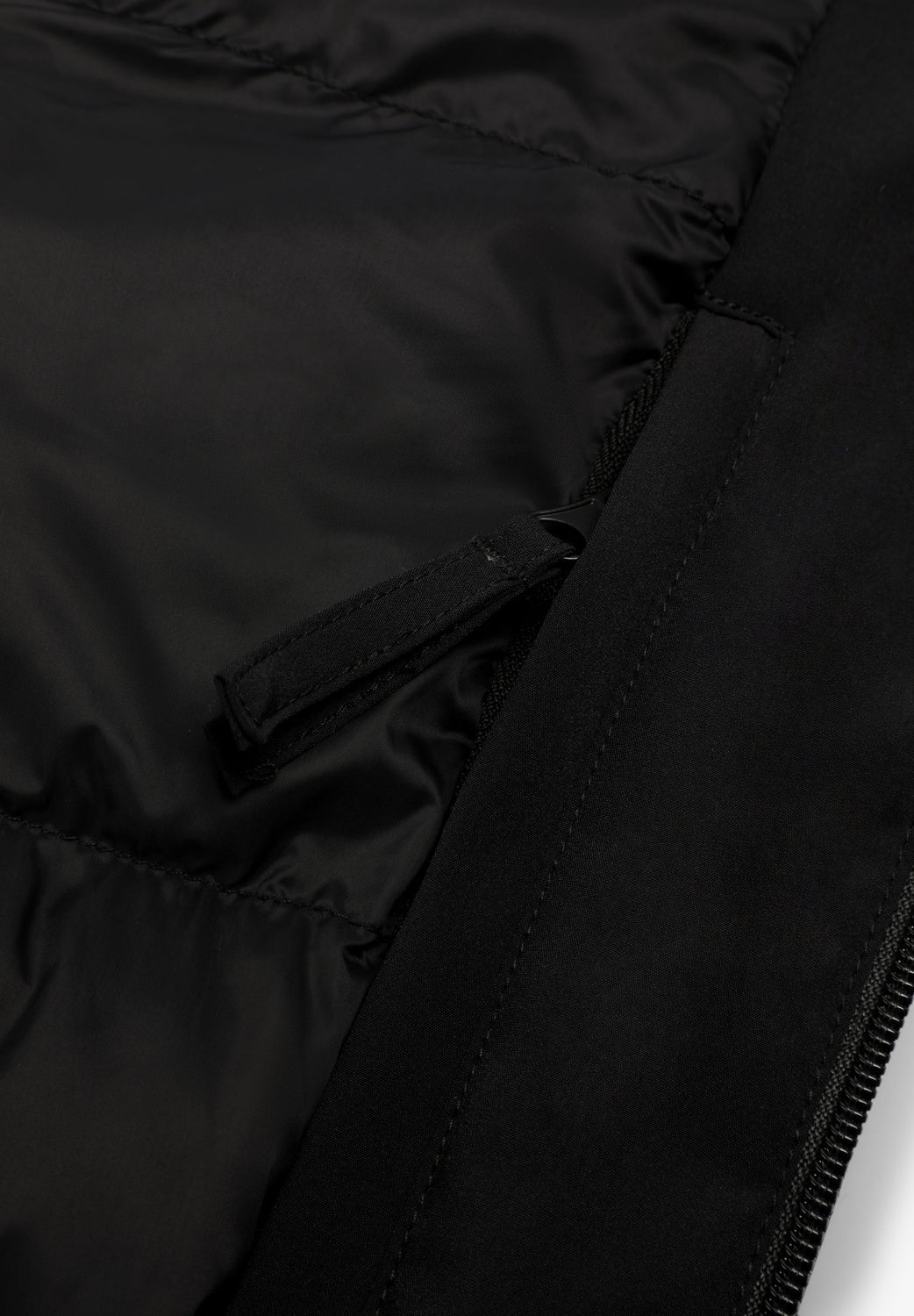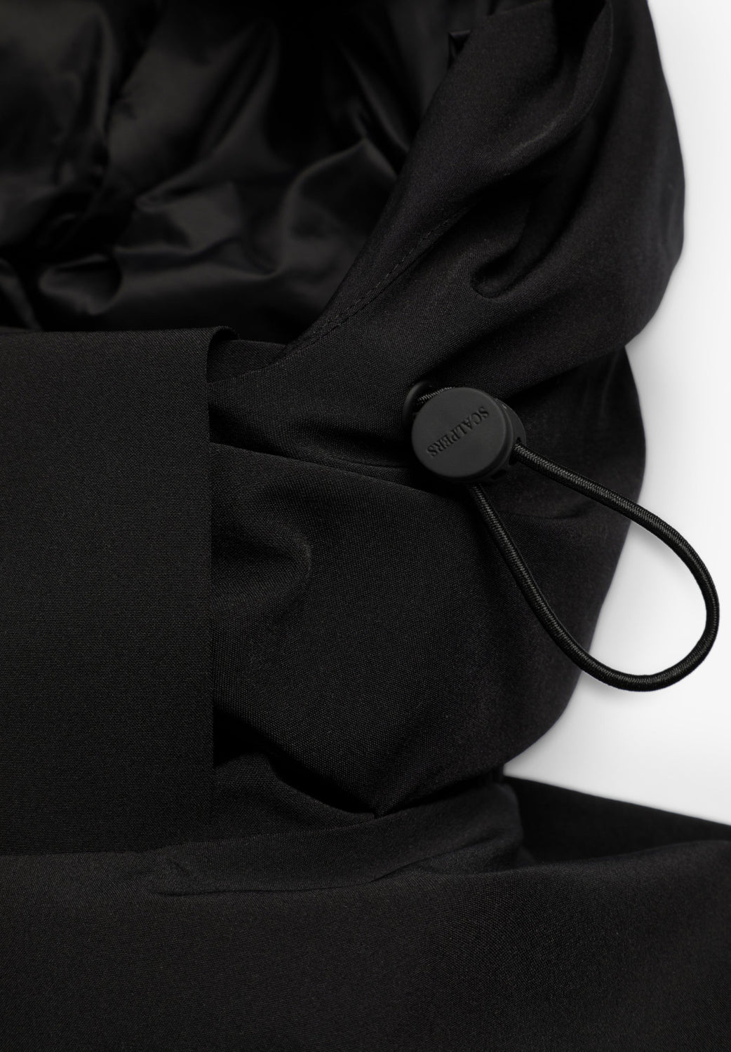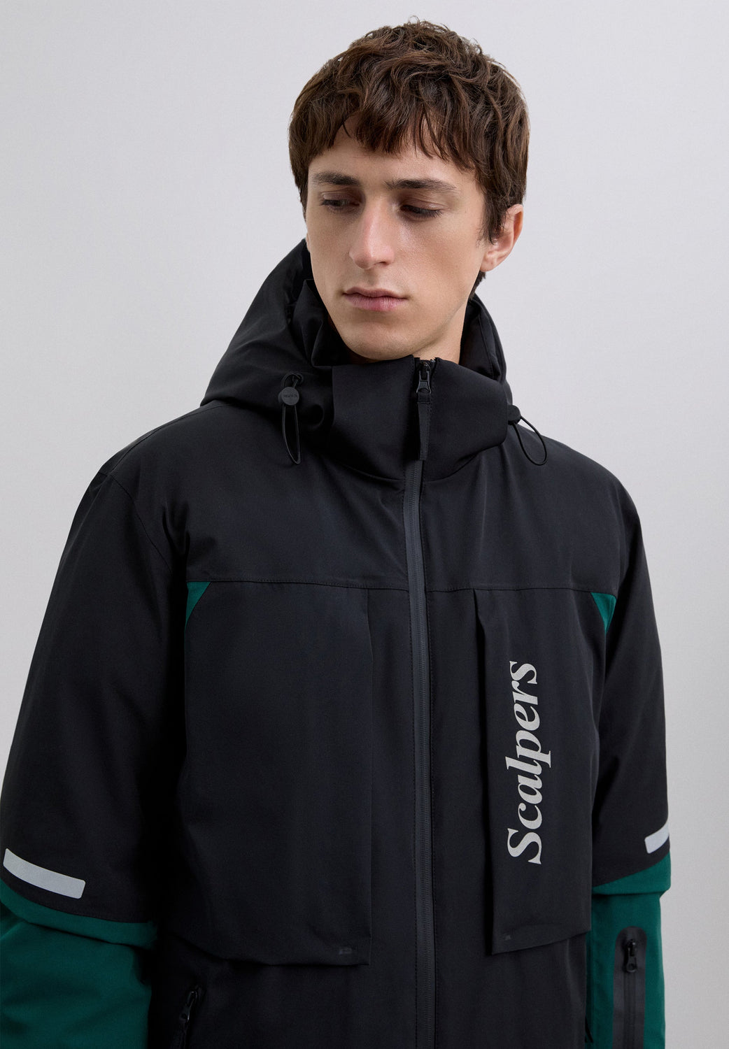 Chaqueta confeccionada en tejido técnico, con cierre frontal mediante cremallera termosellada. Presenta cuello alto con capucha ajustable. Incorpora bolsillos delanteros con cremallera y un bolsillo en la manga con cierre termosellado. Puños ajustables con cierre de velcro y puño interior elástico. Incluye detalles reflectantes y paneles a contraste. Diseño funcional con acabados técnicos.