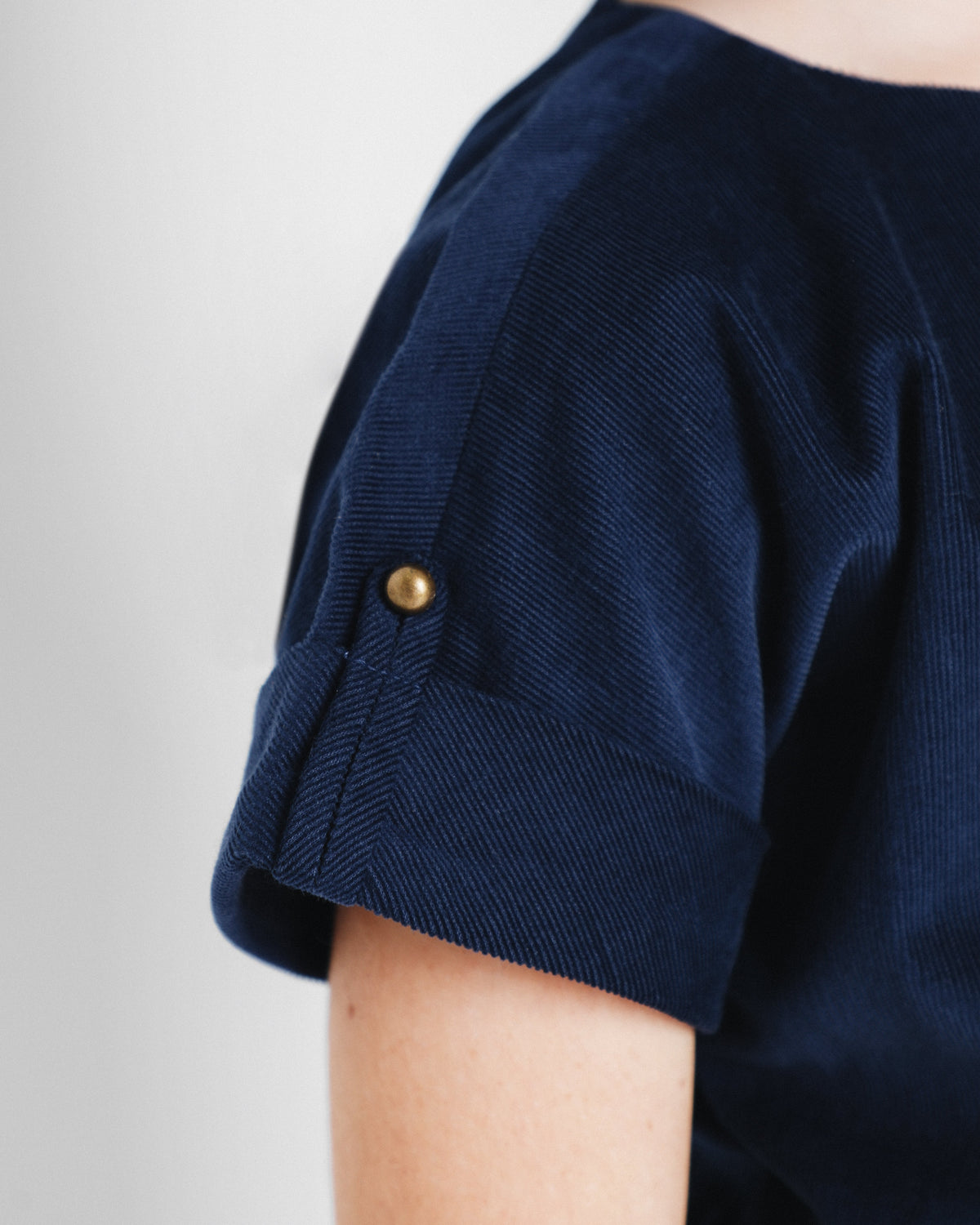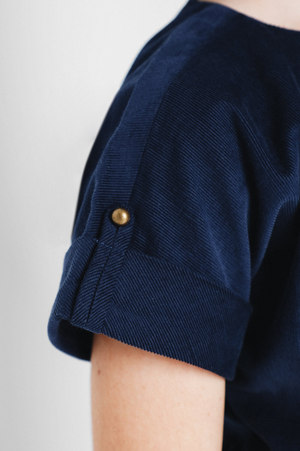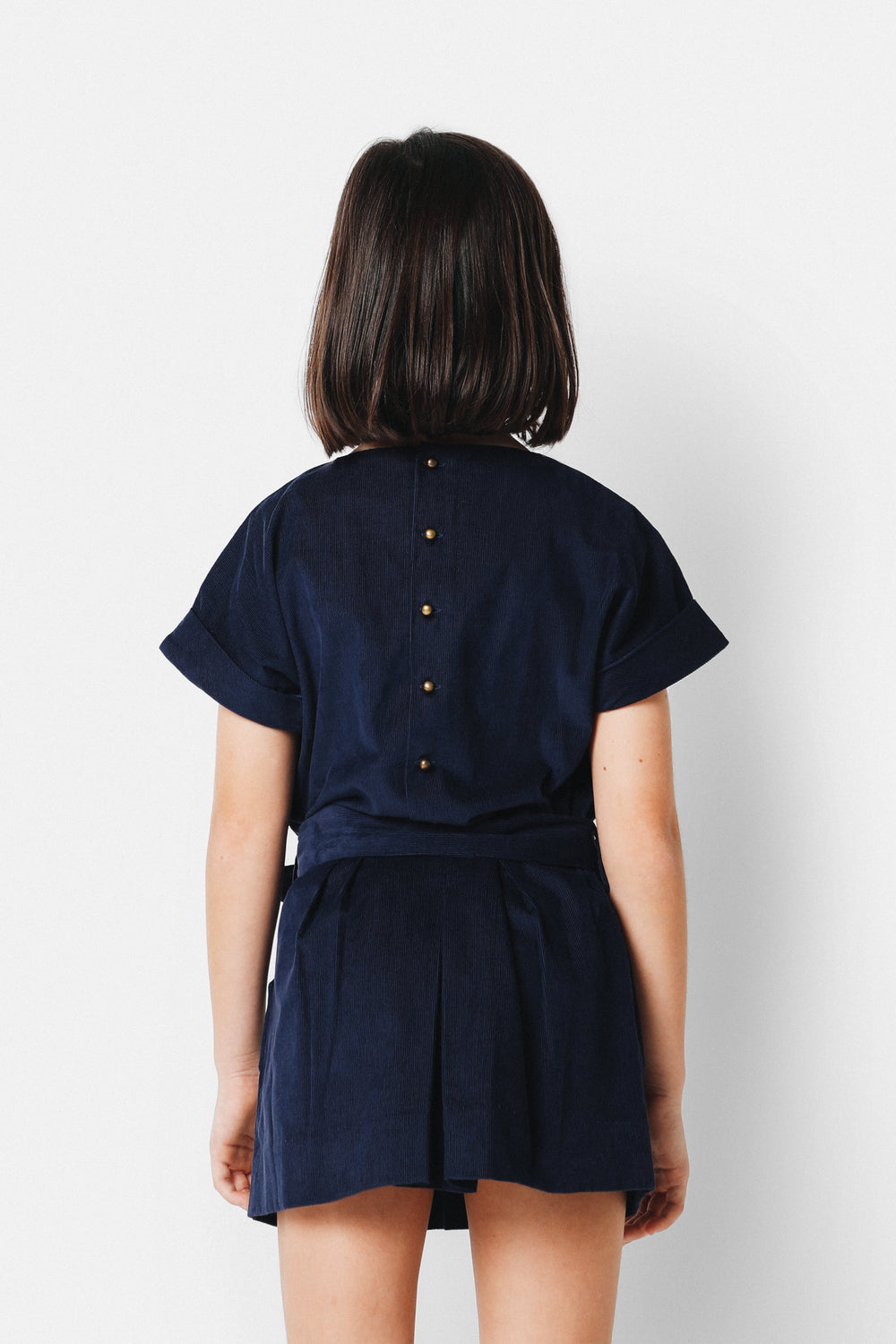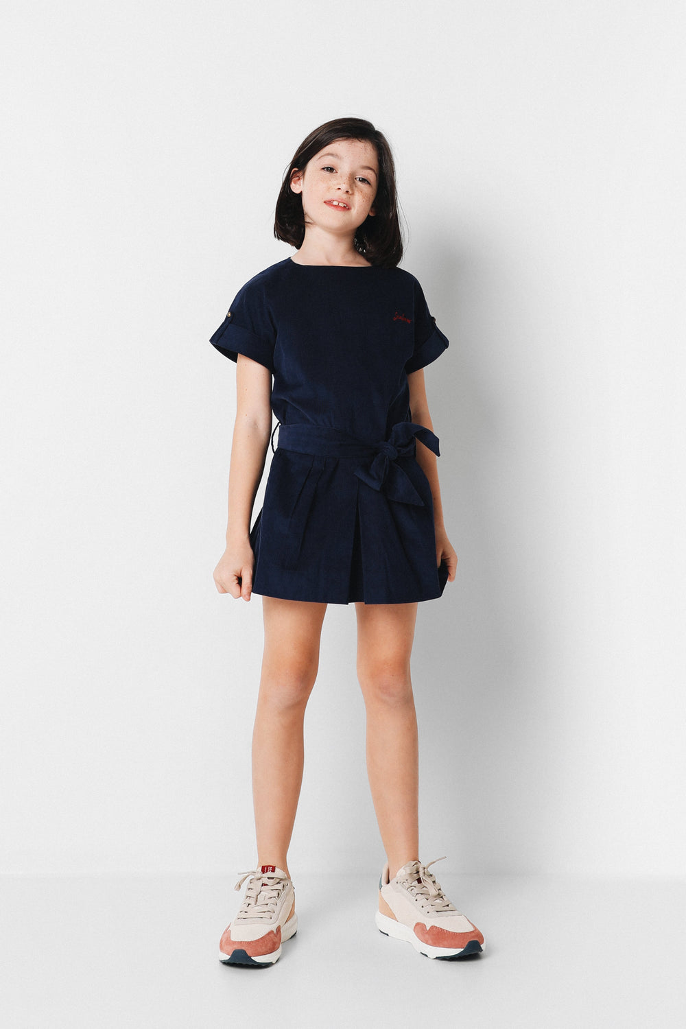 Vestido mini confeccionado en tejido de micropana. Corte en la cadera con lazada y cierre con botones traseros. Manga corta con vuelta y detalle de botón y falda tableada. Detalle de logo bordado a contraste en el pecho.