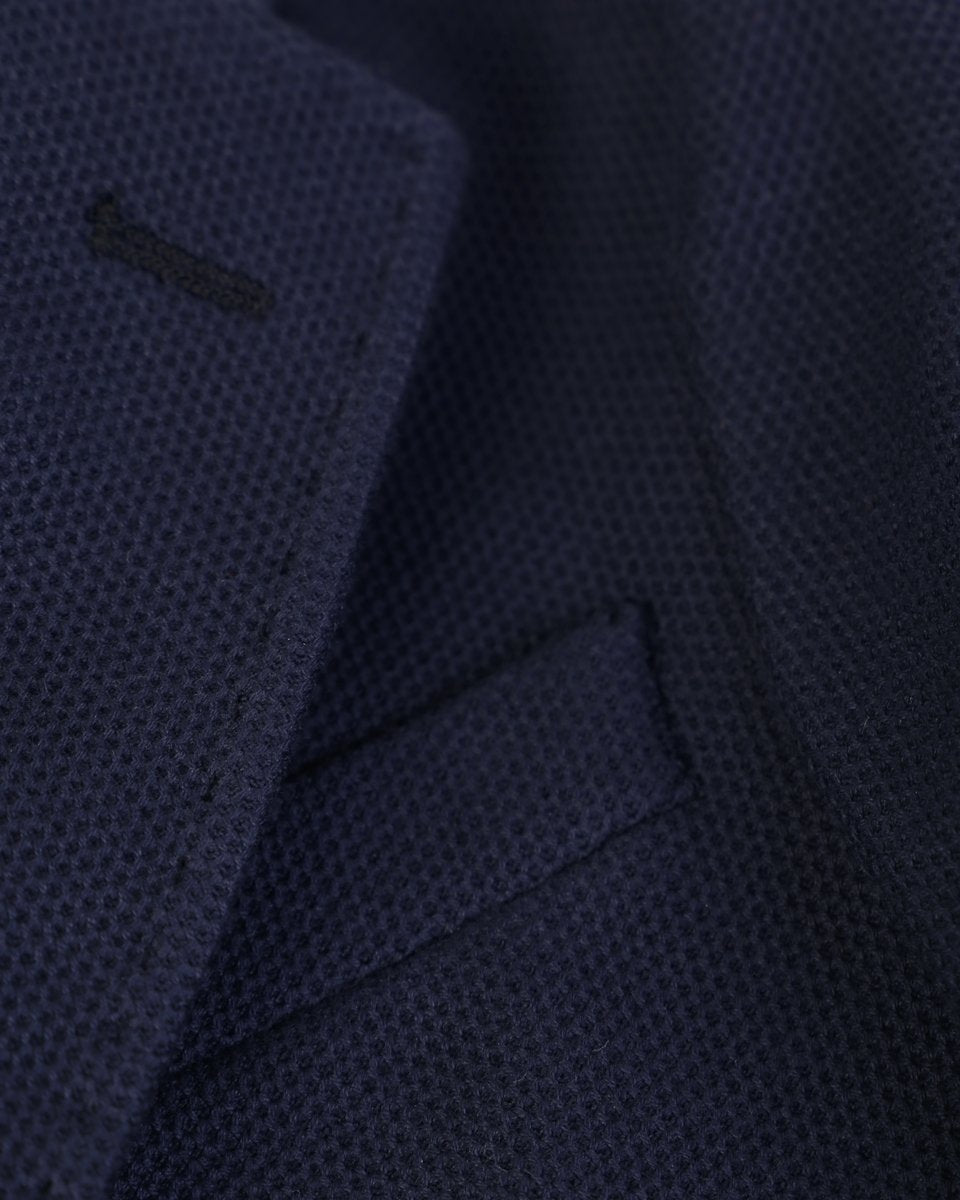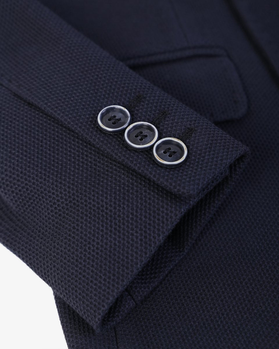 Americana confeccionada en tejido de piqué. Corte recto, cuello con solapas de muesca y cierre con dos botones. Tiene dos bolsillos con tapeta frontales y uno insertado en el pecho. Manga larga terminada en puño.