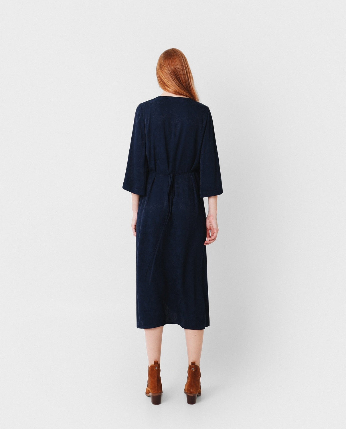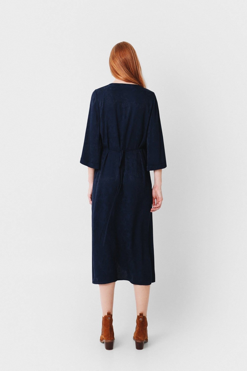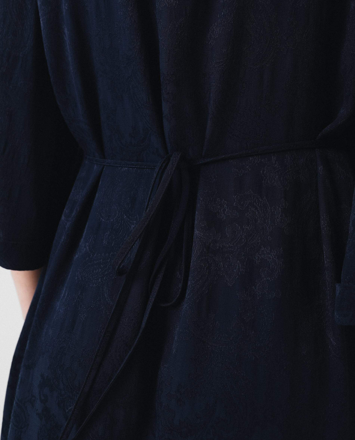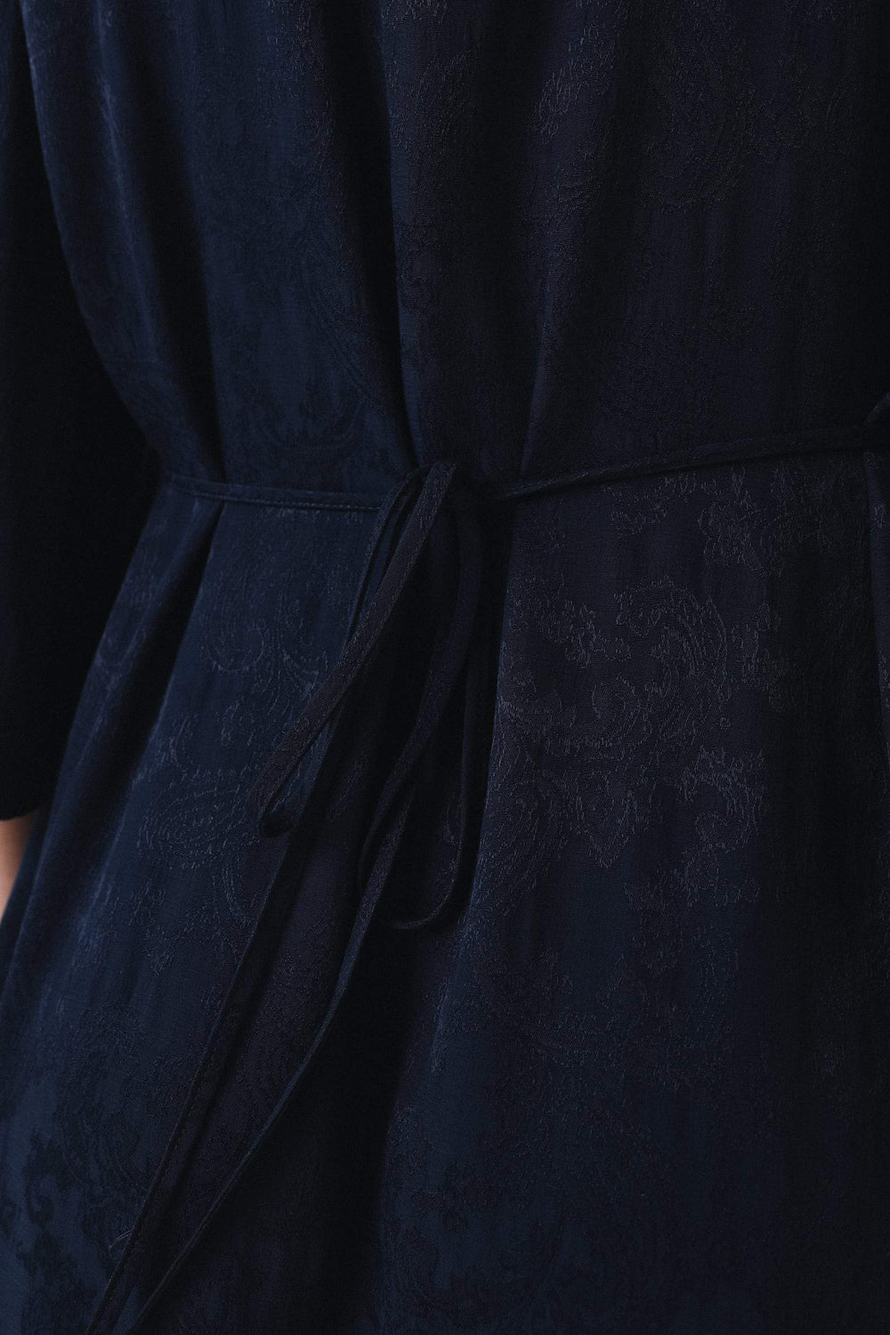 Vestido midi con estampado pasley en color azul marino confeccionado en tejido de jacquard. Corte con frunce en cintura, manga larga y detalle de cinturón del mismo tejido.