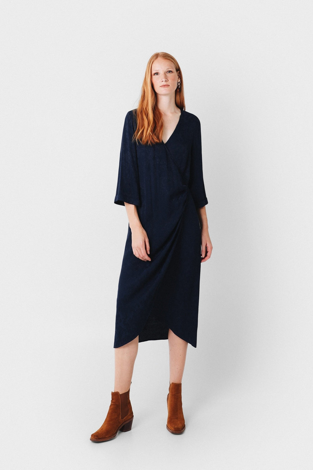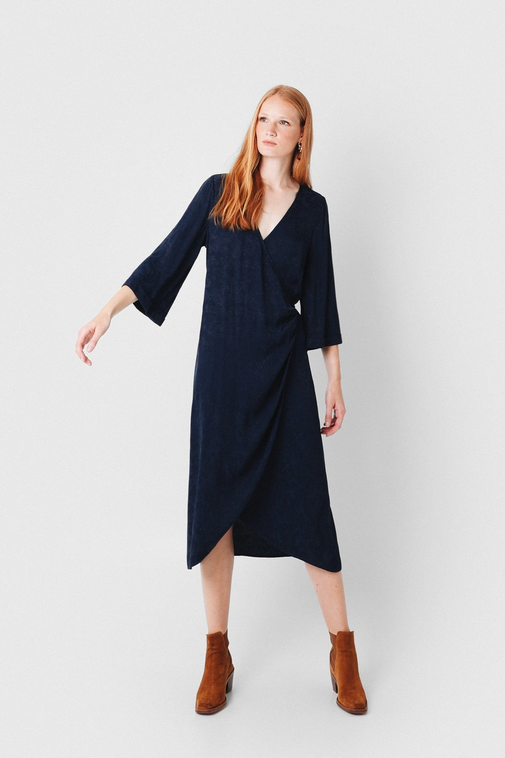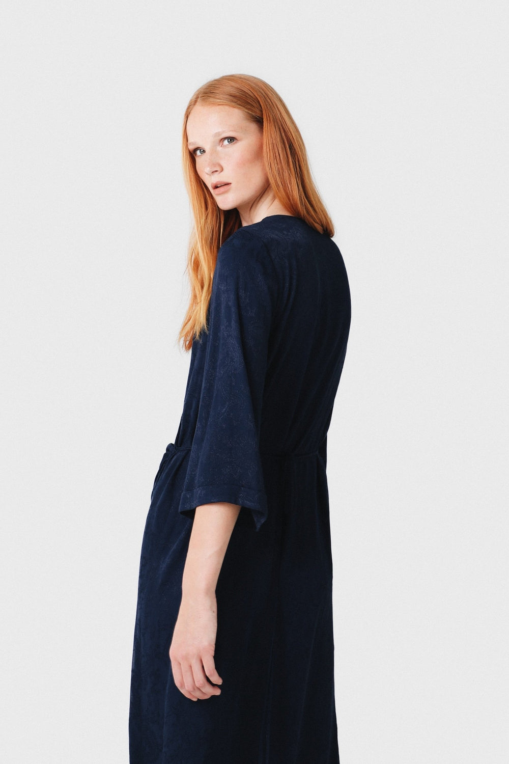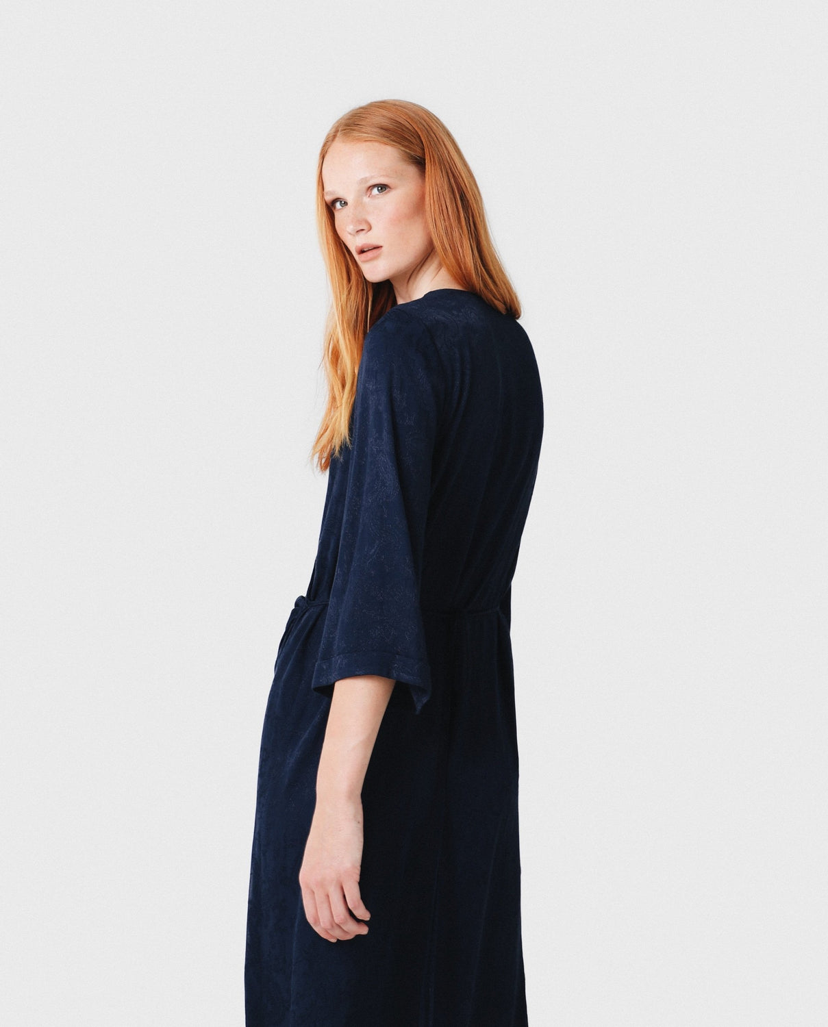 Vestido midi con estampado pasley en color azul marino confeccionado en tejido de jacquard. Corte con frunce en cintura, manga larga y detalle de cinturón del mismo tejido.