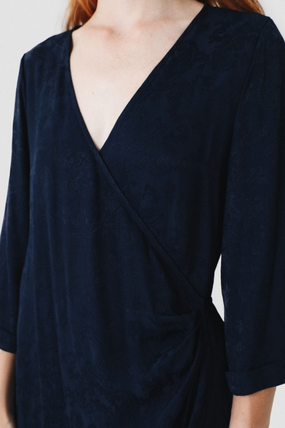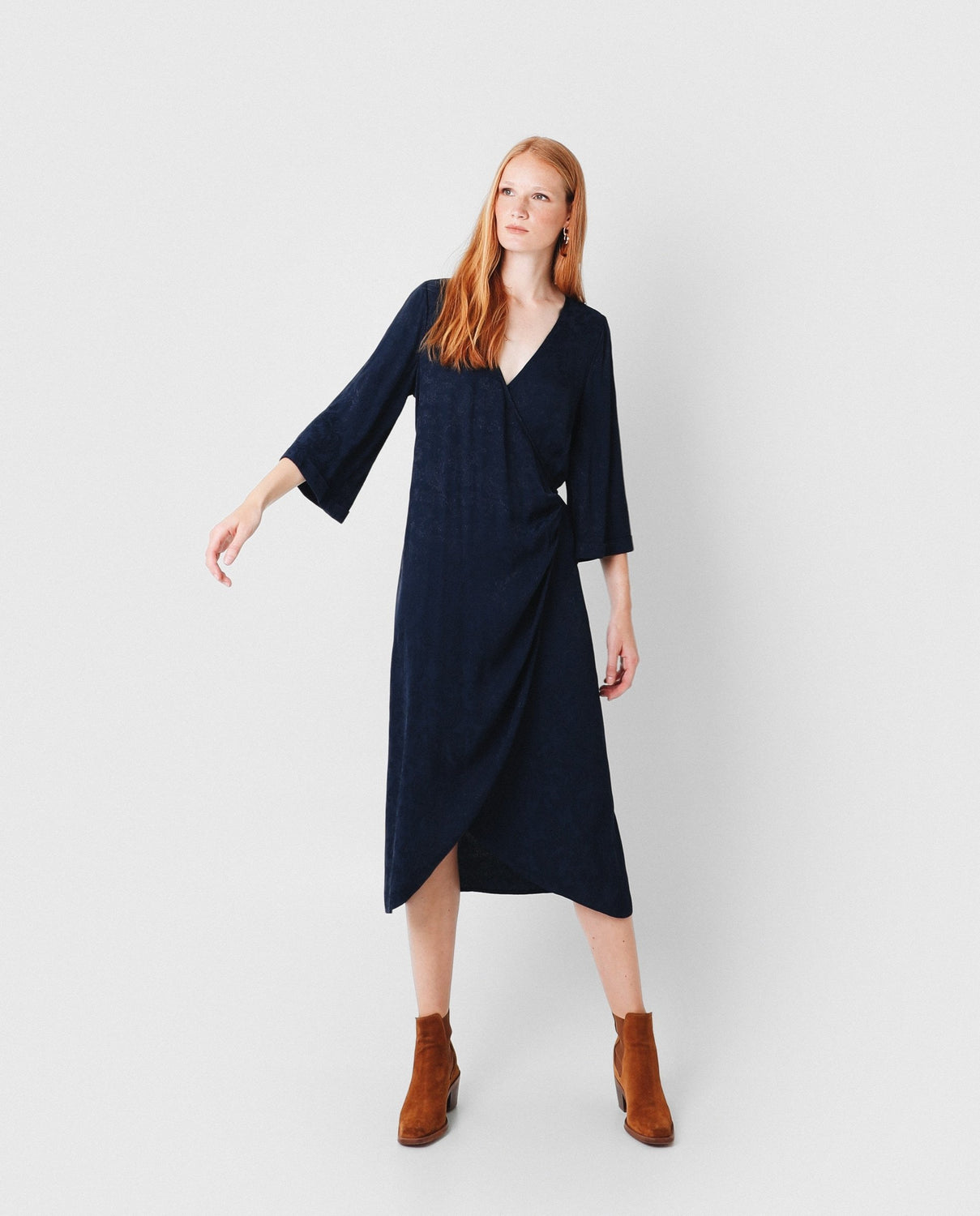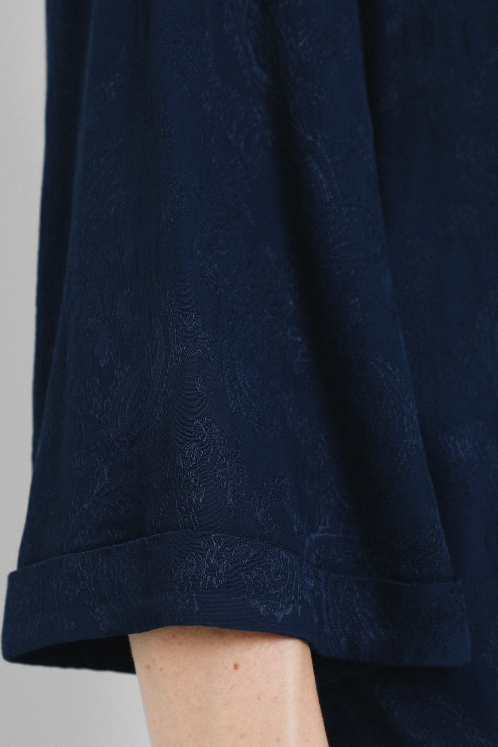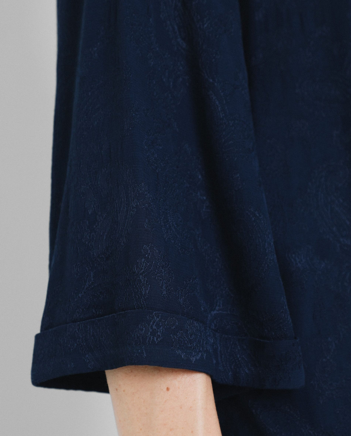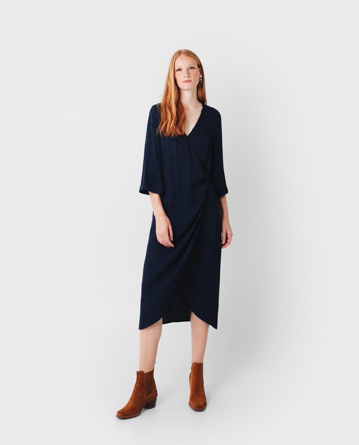 Vestido midi con estampado pasley en color azul marino confeccionado en tejido de jacquard. Corte con frunce en cintura, manga larga y detalle de cinturón del mismo tejido.