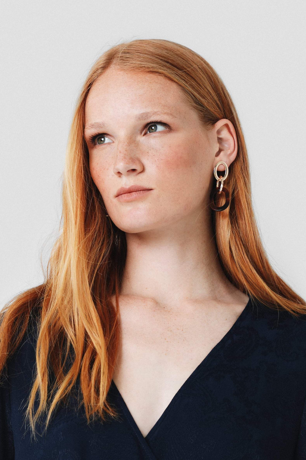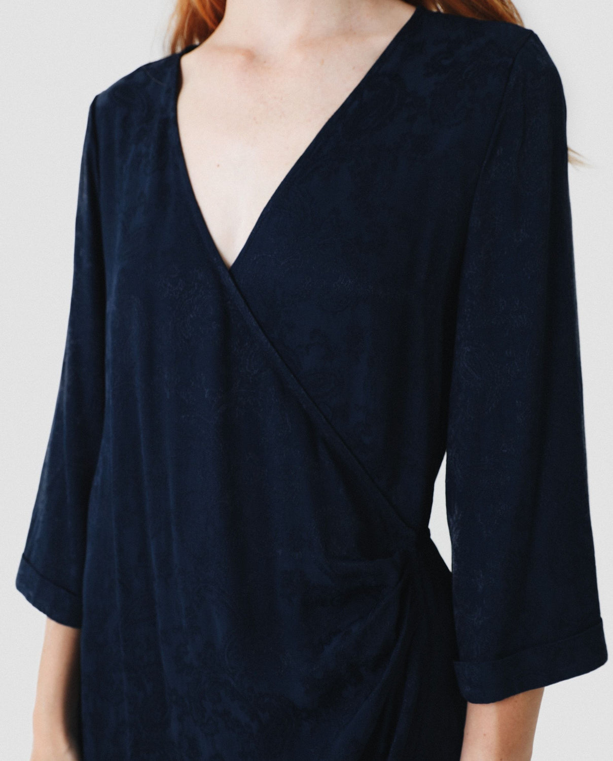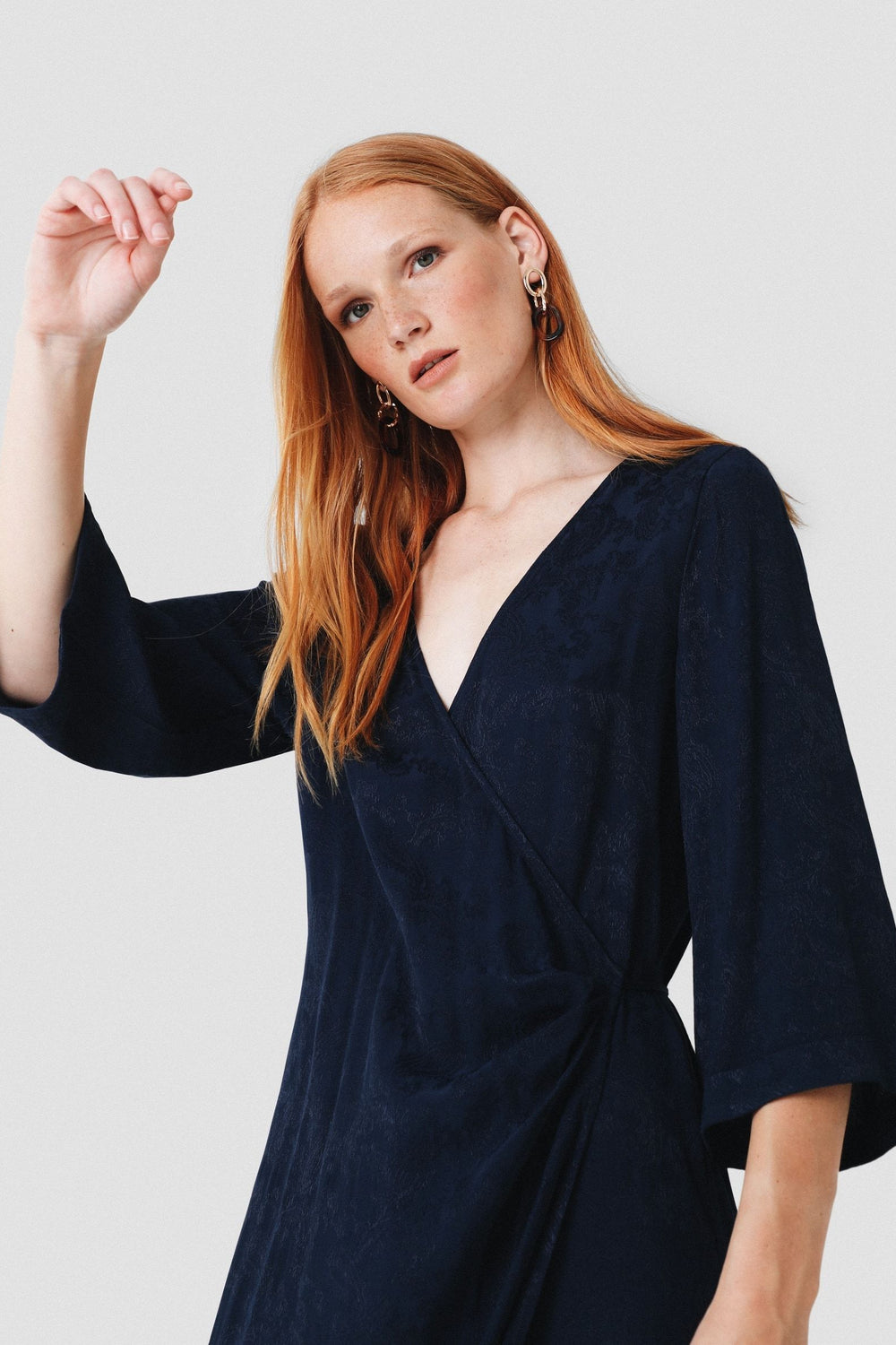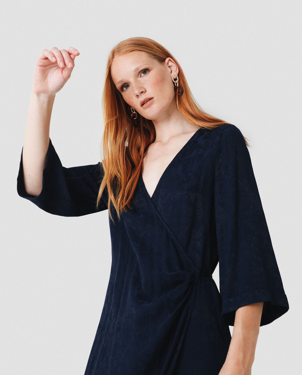 Vestido midi con estampado pasley en color azul marino confeccionado en tejido de jacquard. Corte con frunce en cintura, manga larga y detalle de cinturón del mismo tejido.