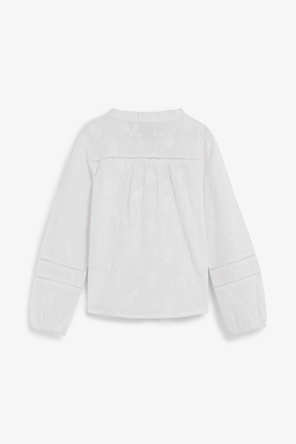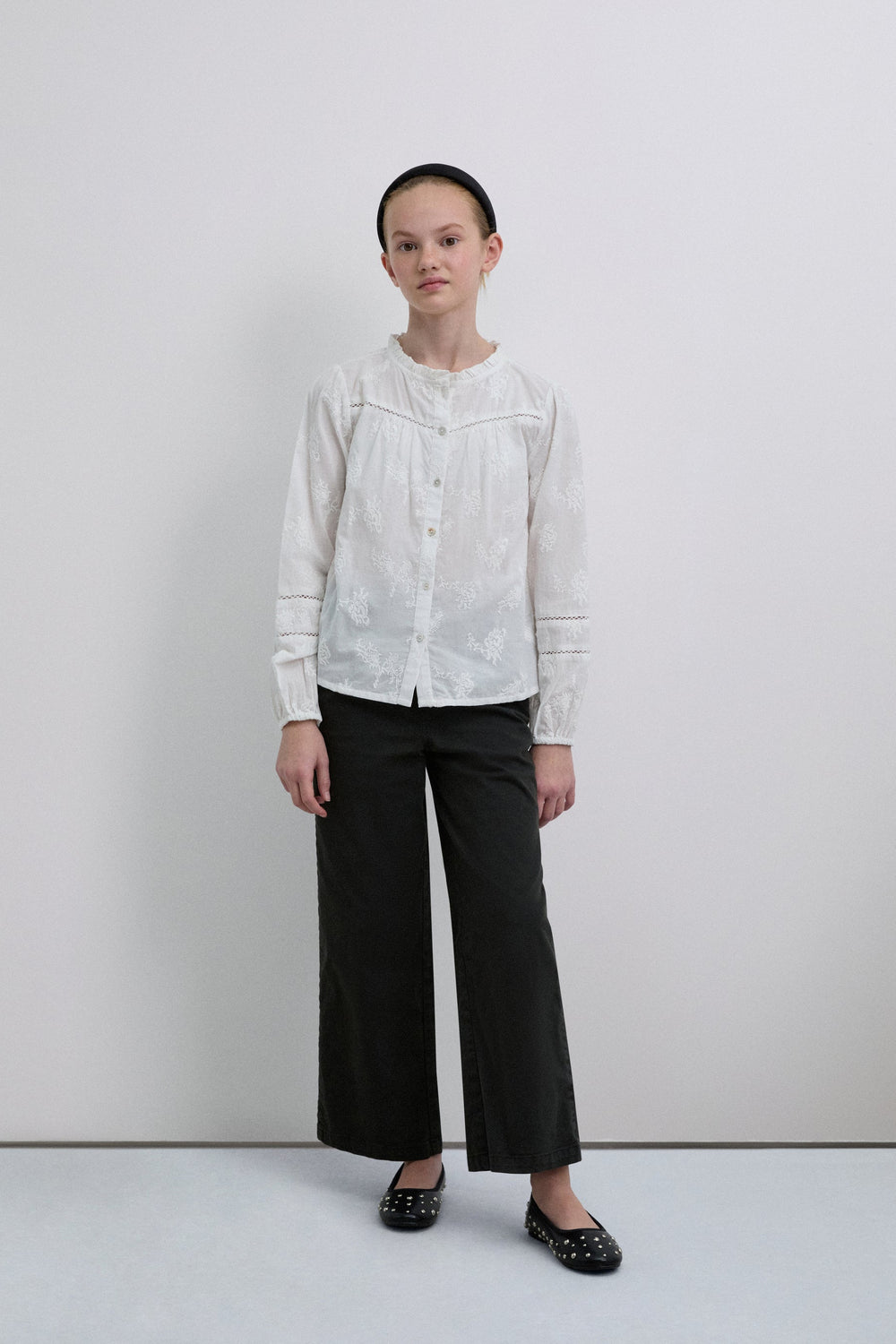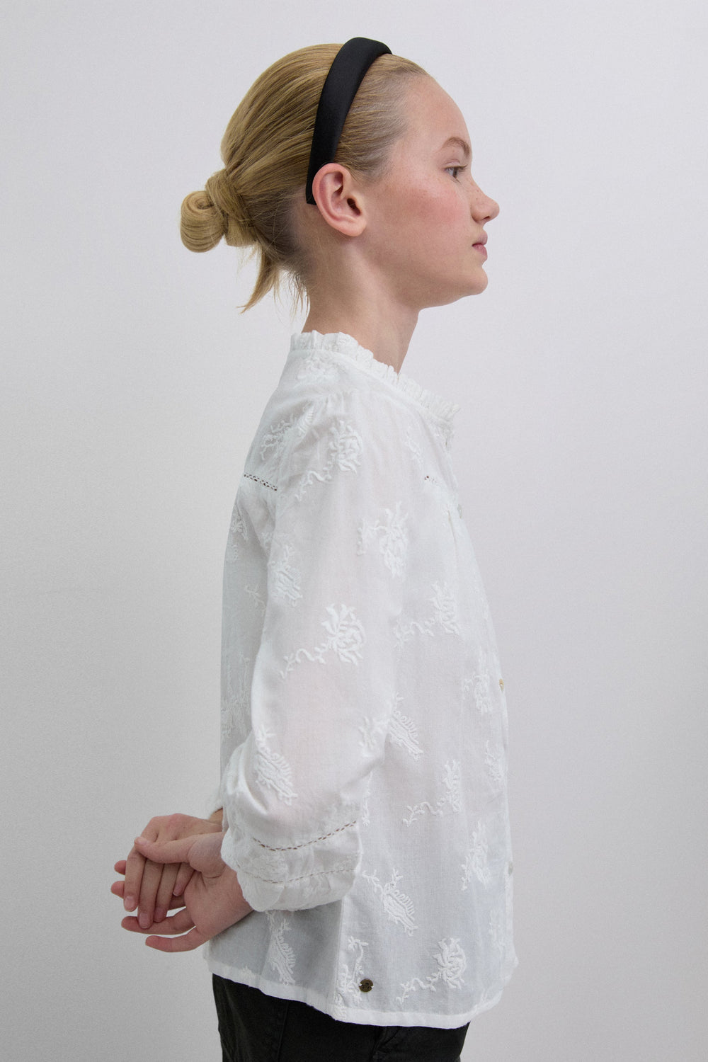 Camisa confeccionada en algodón 100% con cuello pico y manga larga acabada en goma. Cierre botonadura frontal. Detalles bordados flores.