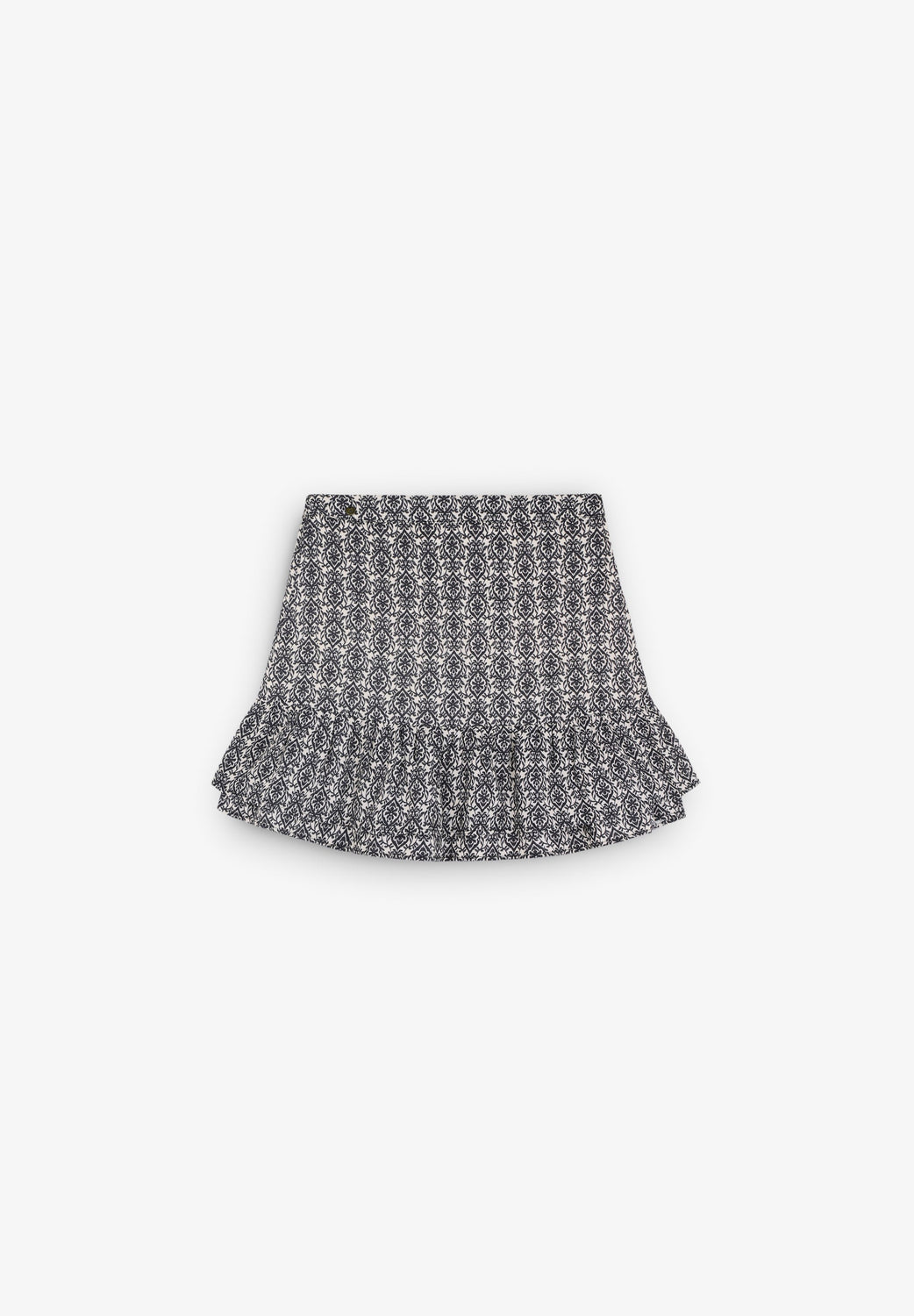 Falda mini con print confeccionada 100% viscosa. Cierre lateral y volantes en el bajo.
