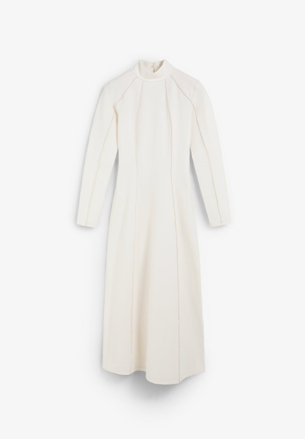 Vestido midi de punto confeccionado en algodón BCI. Mangas largas. Cuello perkins. Puntada overlock.