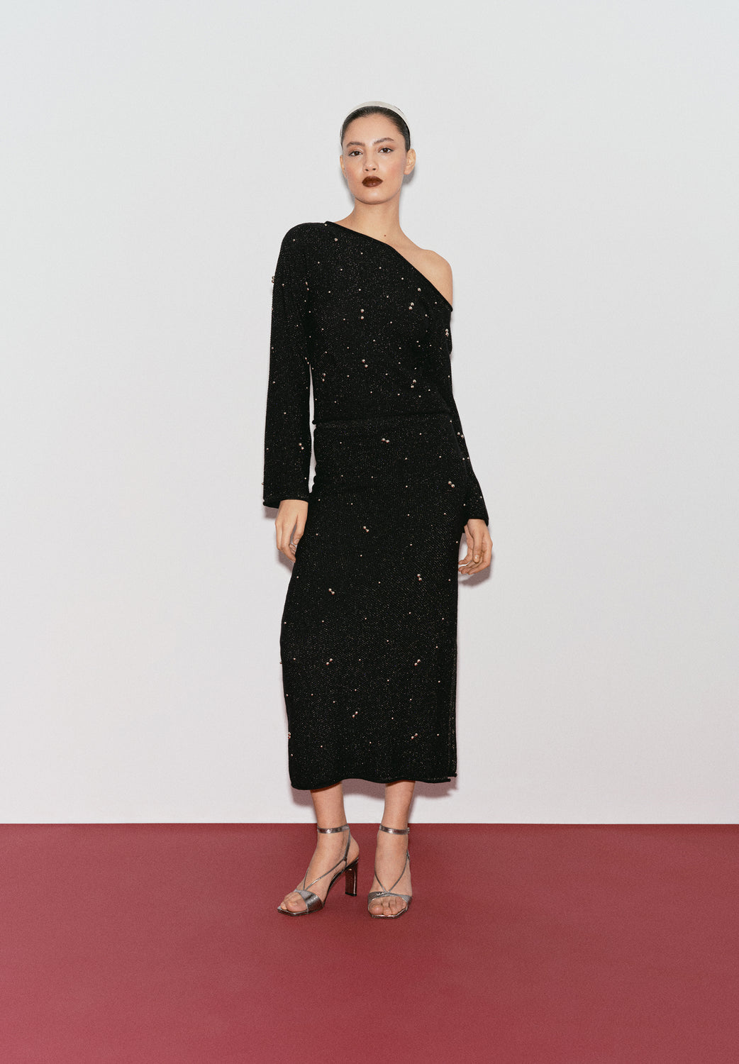 Falda confeccionada en punto metalizado ligeramente elástico con detalles de perlas. Corte slim fit. Midi.