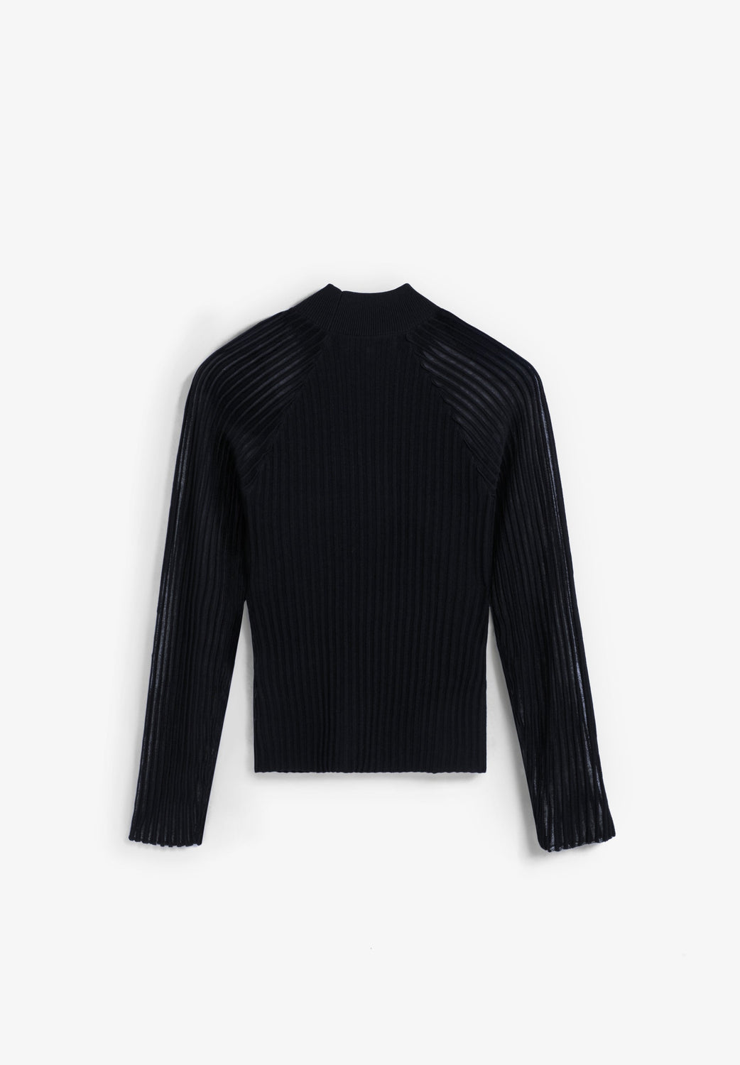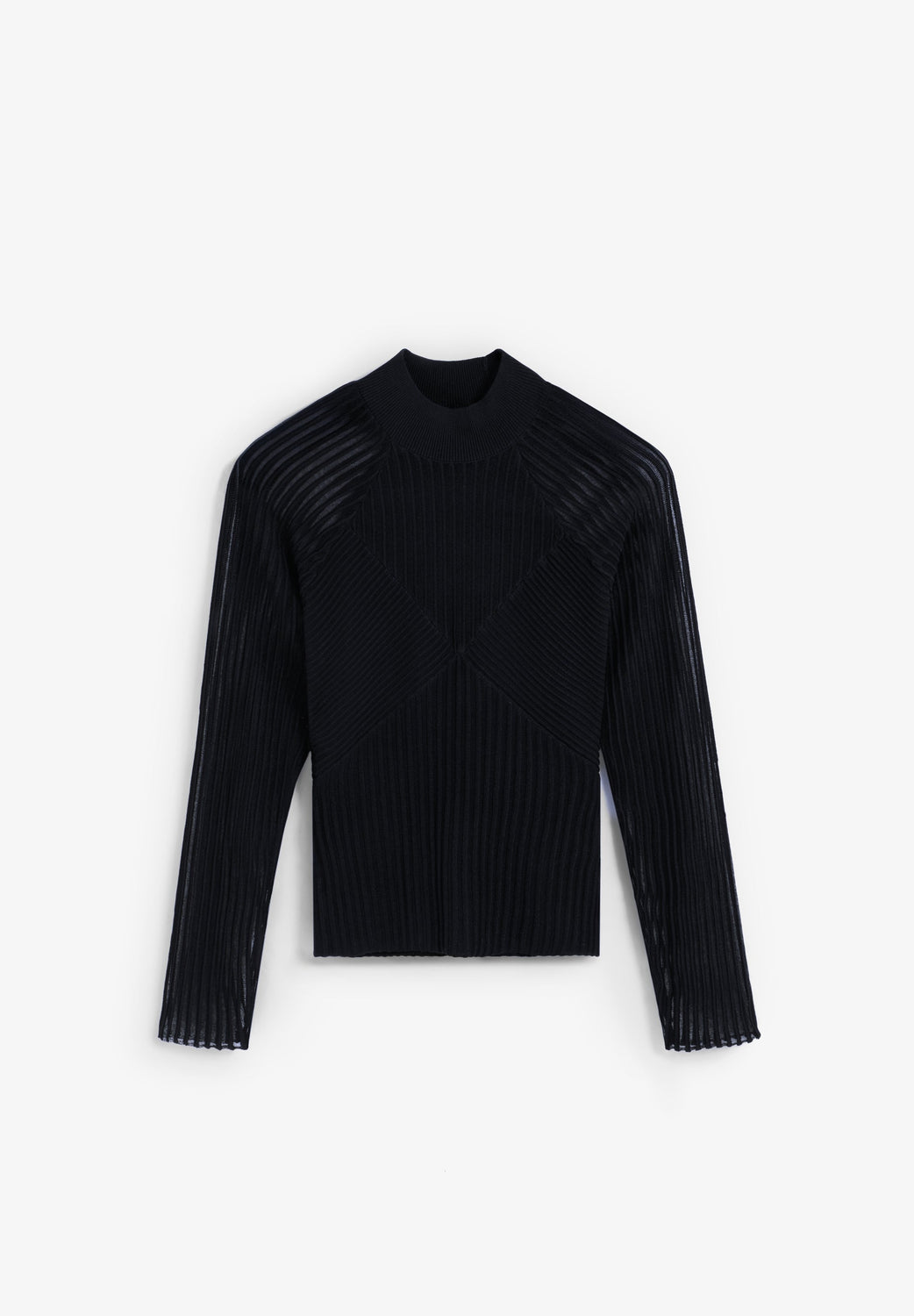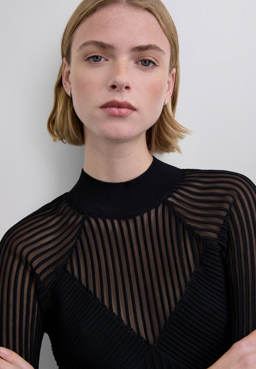 Top confeccionado en material ligeramente elástico. Detalles de transparencias y rayas. Corte slim fit. Cuello subido. Manga larga.