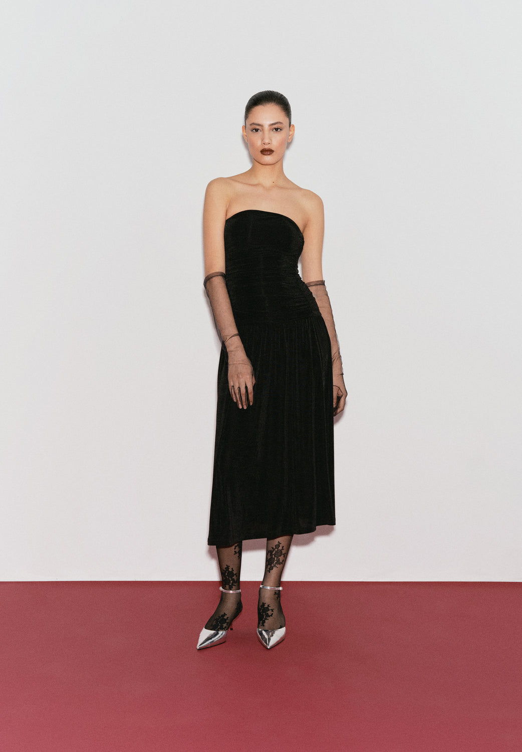 Vestido confeccionado en punto fino ligeramente elástico. Corte slim fit, strapless, cuerpo con detalle de frunces. Corte midi.