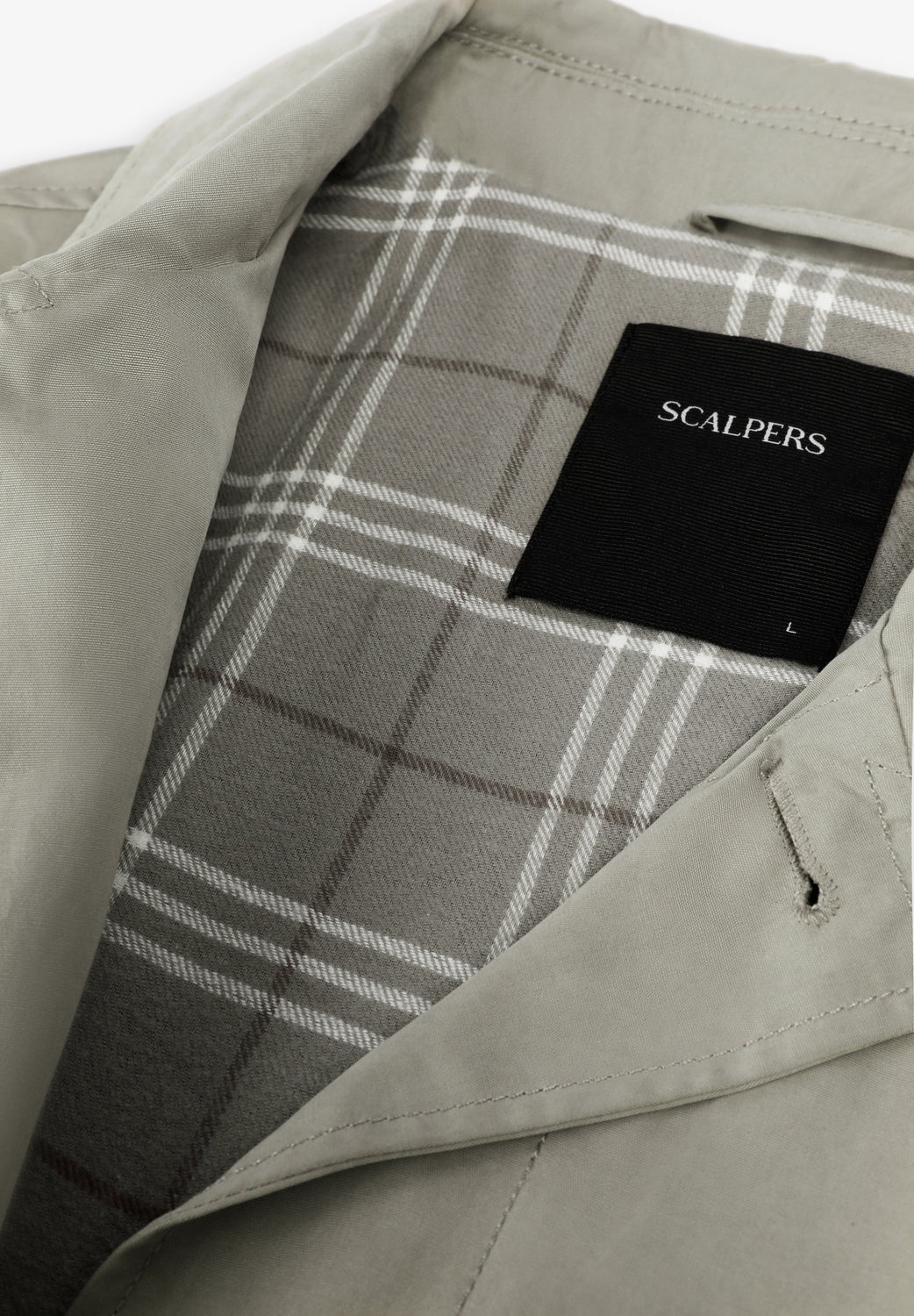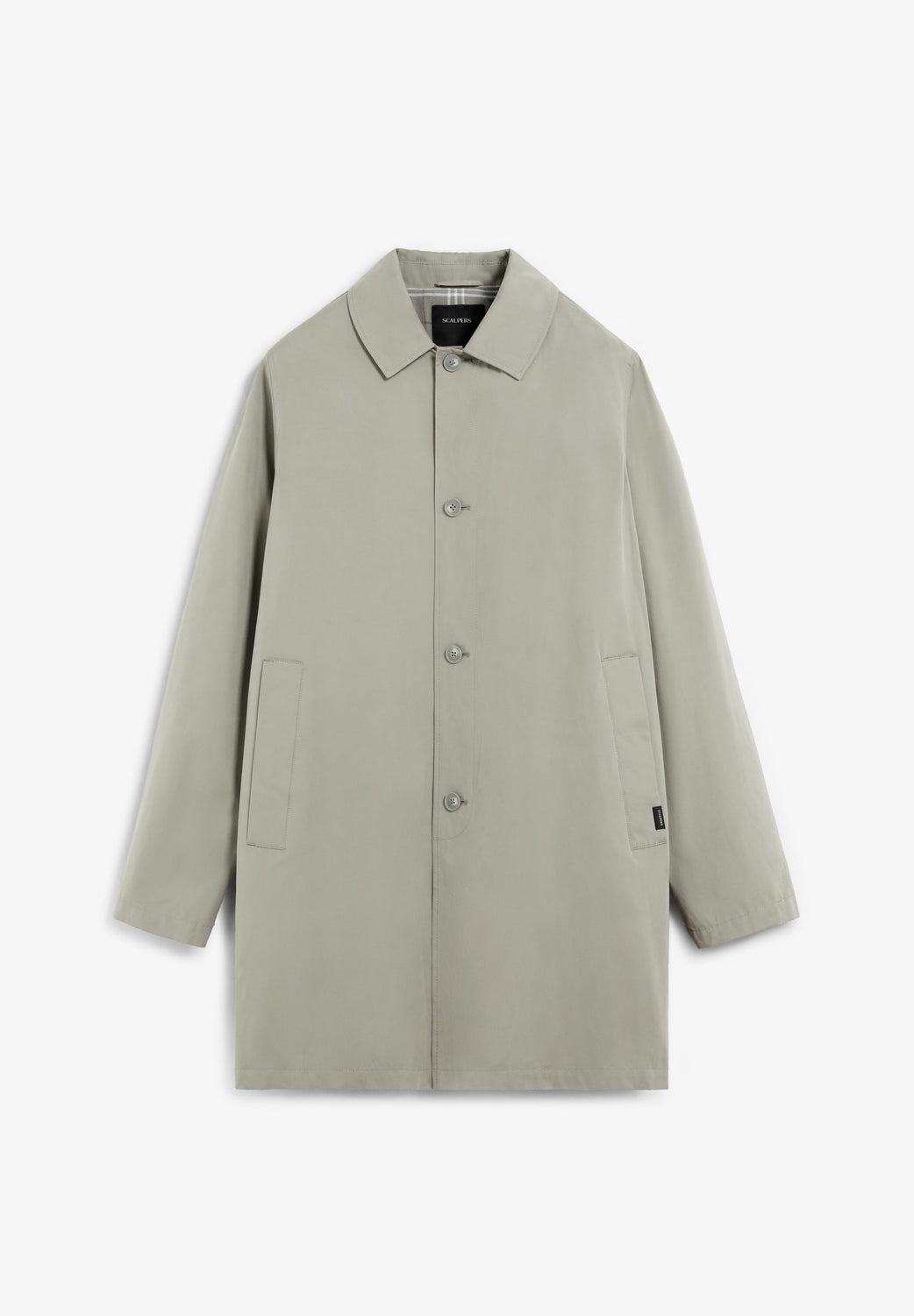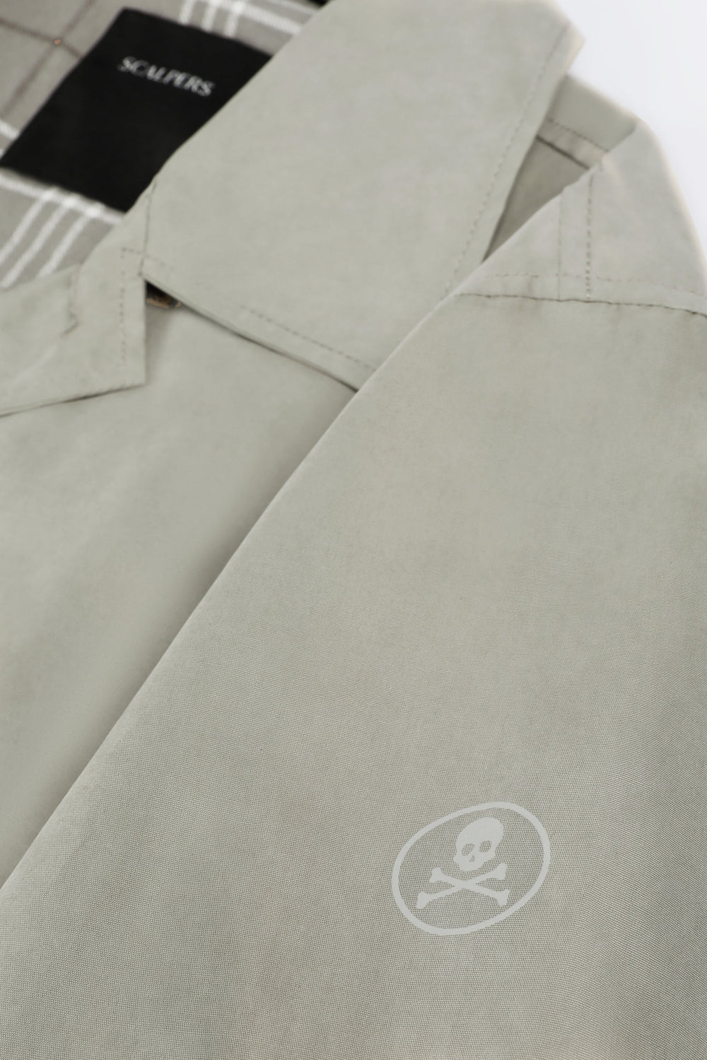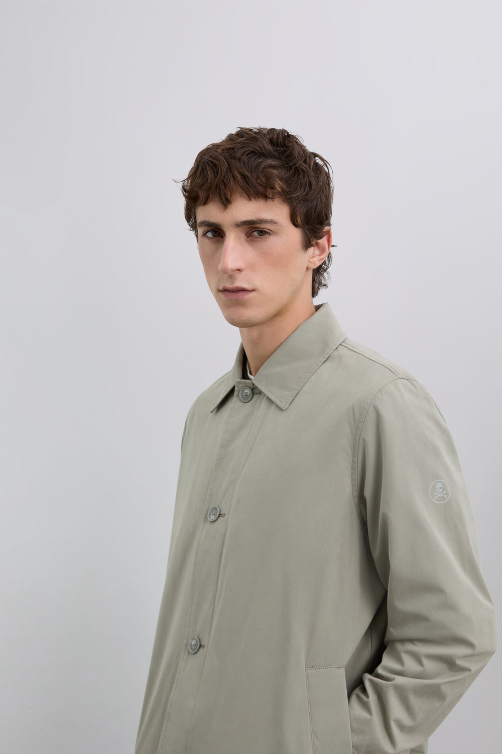 Gabardina con cierre de botones en la parte delantera. Cuello de camisa. Dos bolsillos laterales. Interior forrado con motivo cuadros. Detalle de etiqueta con logo en bolsillo. Print de calavera en manga a tono.