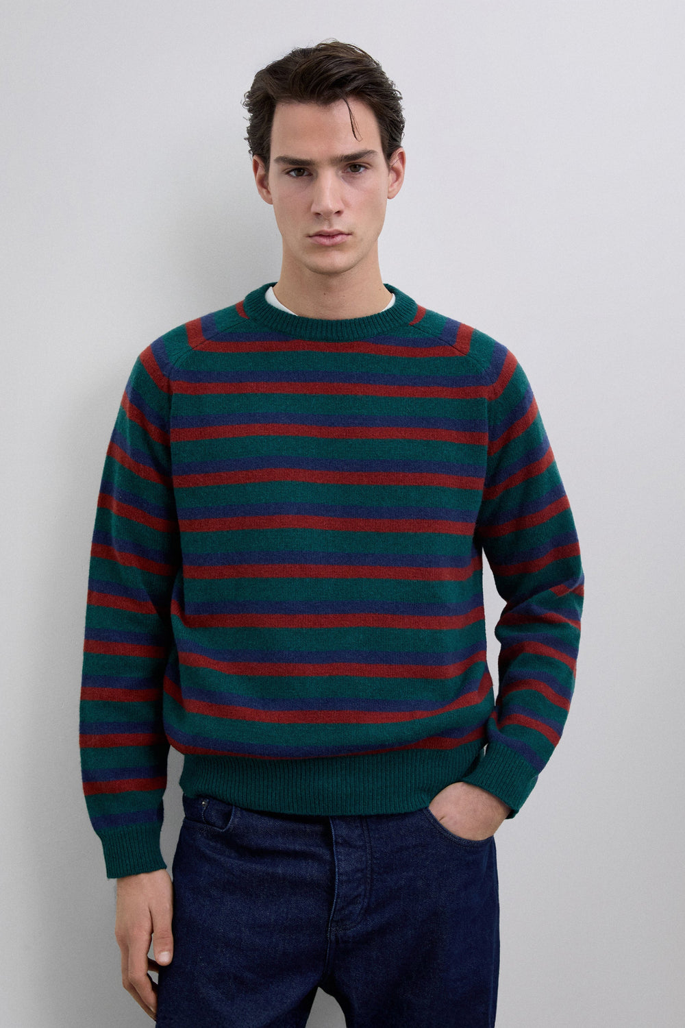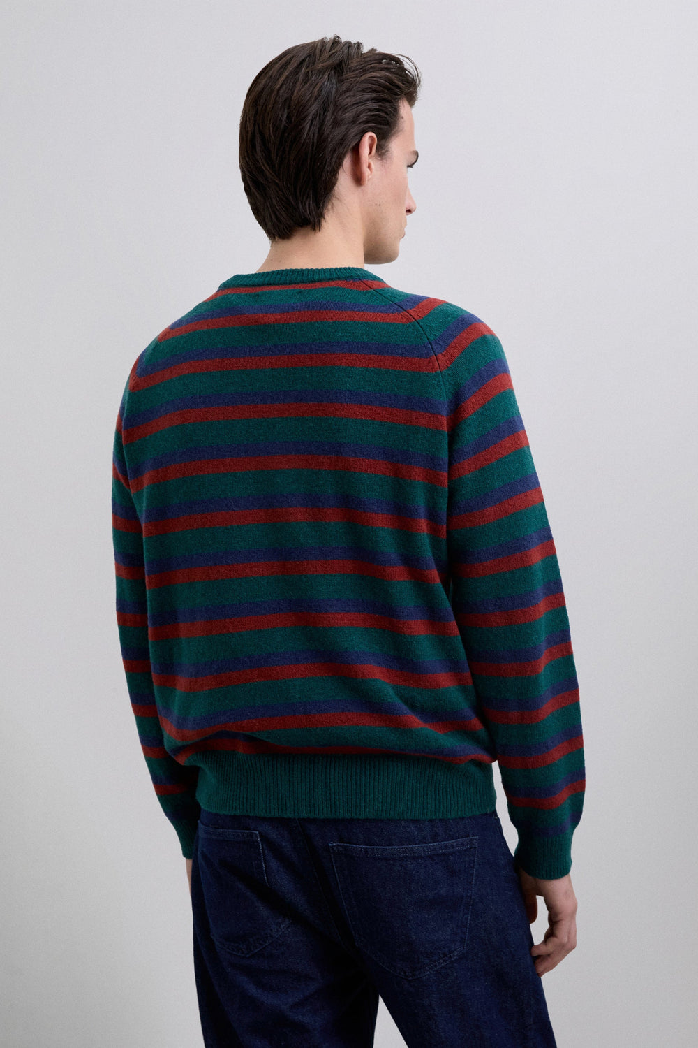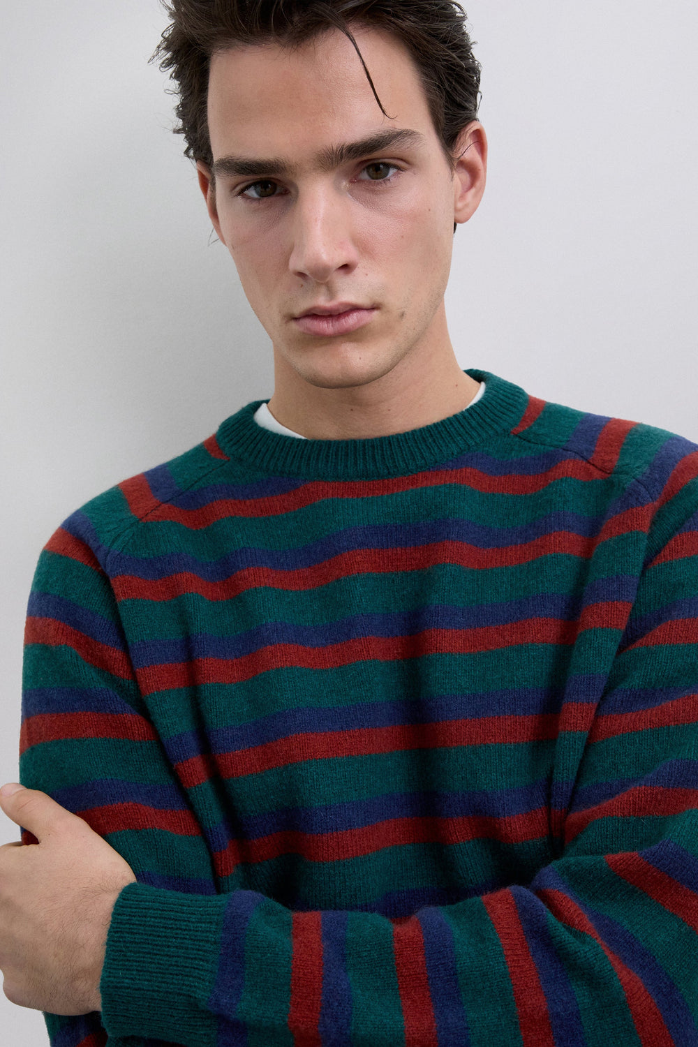 Jersey confeccionado en mezcla de lana reciclada. Cuello redondo. Estampado rayas. Manga larga. Acabados en rib.
