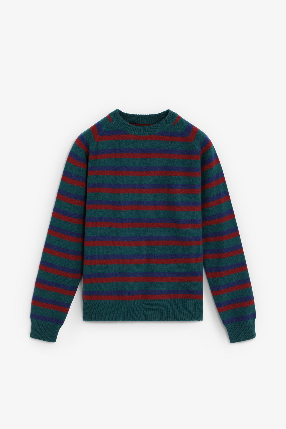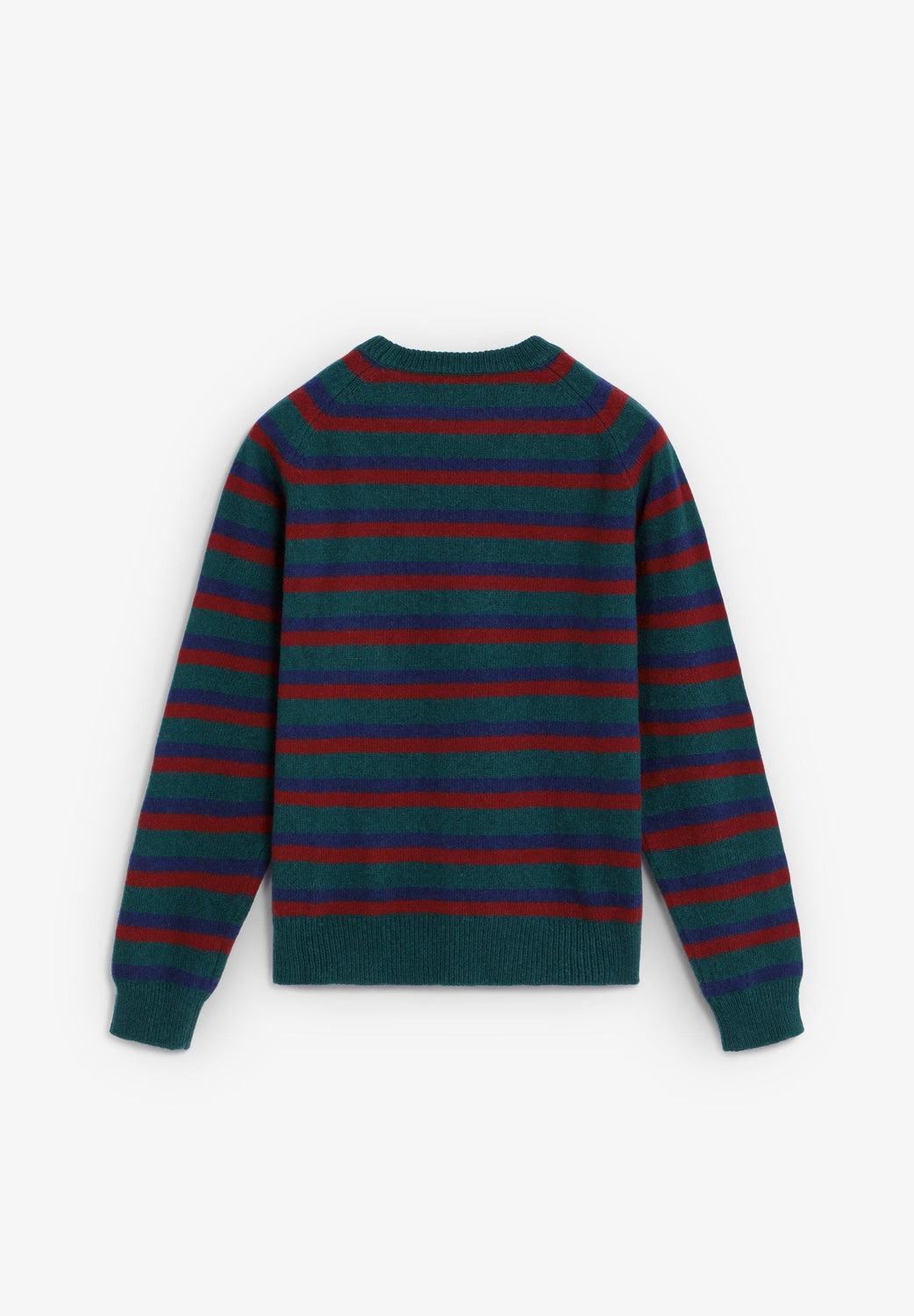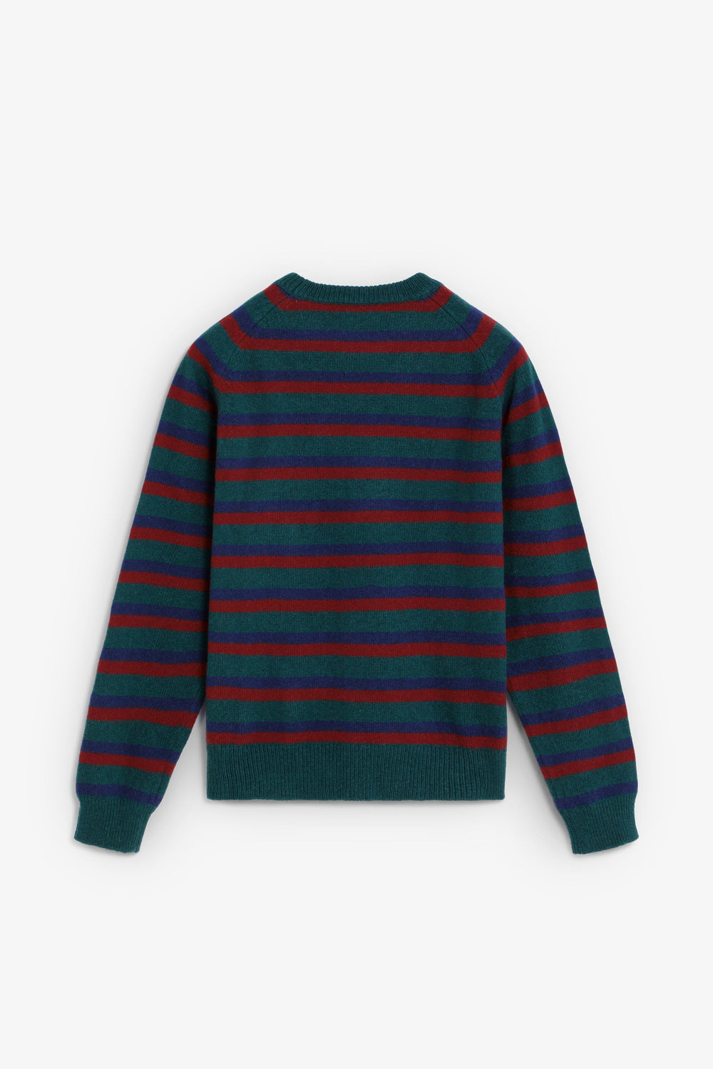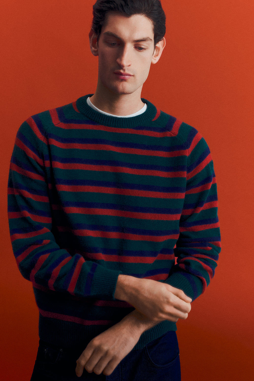 Jersey confeccionado en mezcla de lana reciclada. Cuello redondo. Estampado rayas. Manga larga. Acabados en rib.