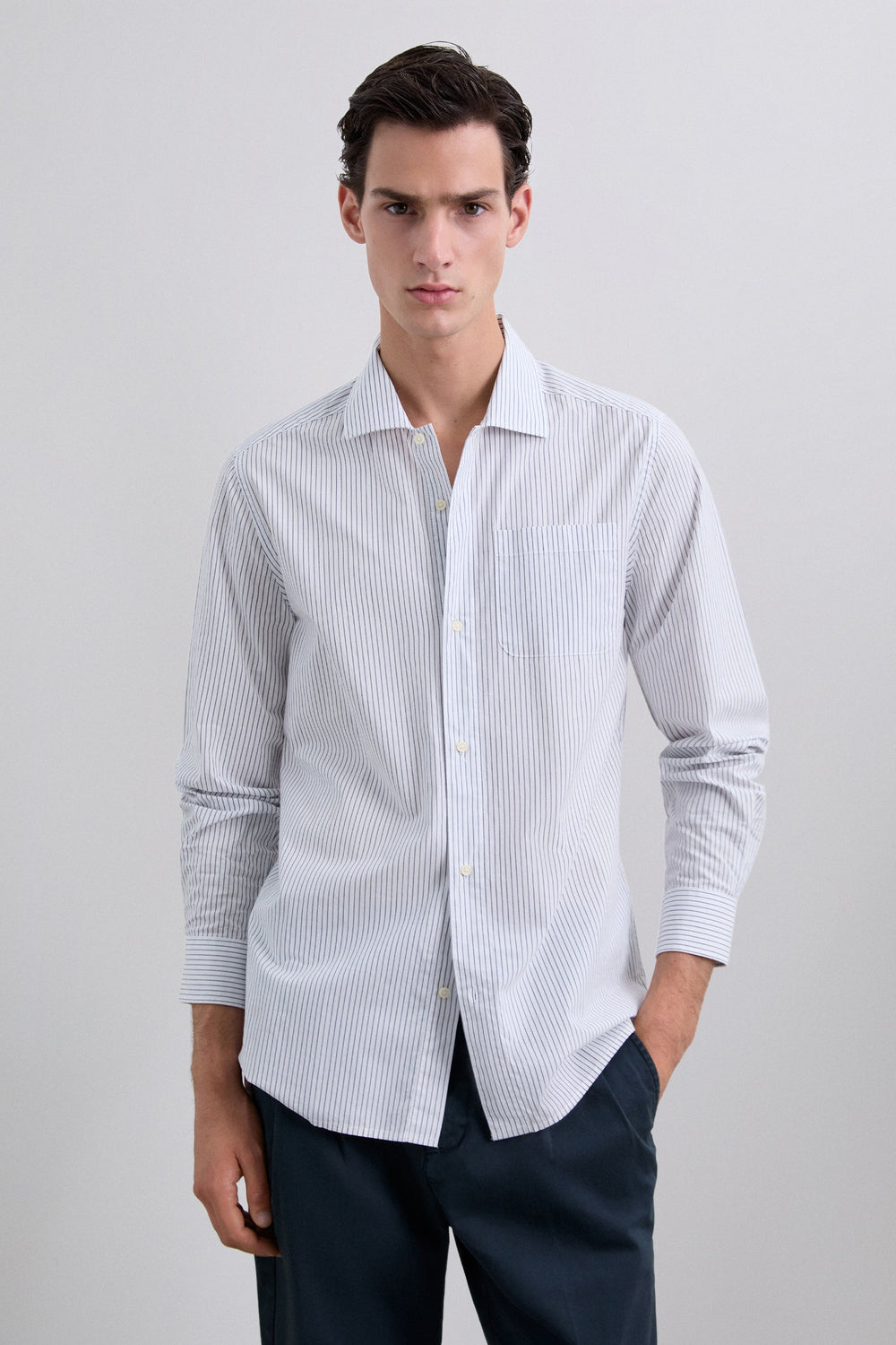Camisa confeccionada en 100% Algodón Orgánico. Manga larga con puño abotonado. Cuello camisero. Cierre mediante abotonadura frontal. Estampado de rayas. Bolsillo en pecho. Logo bordado en puños.