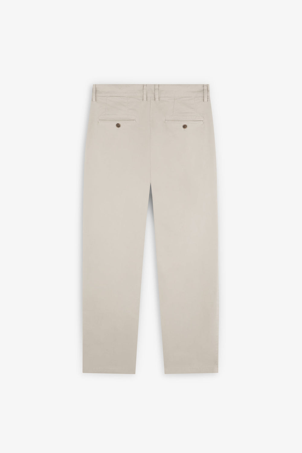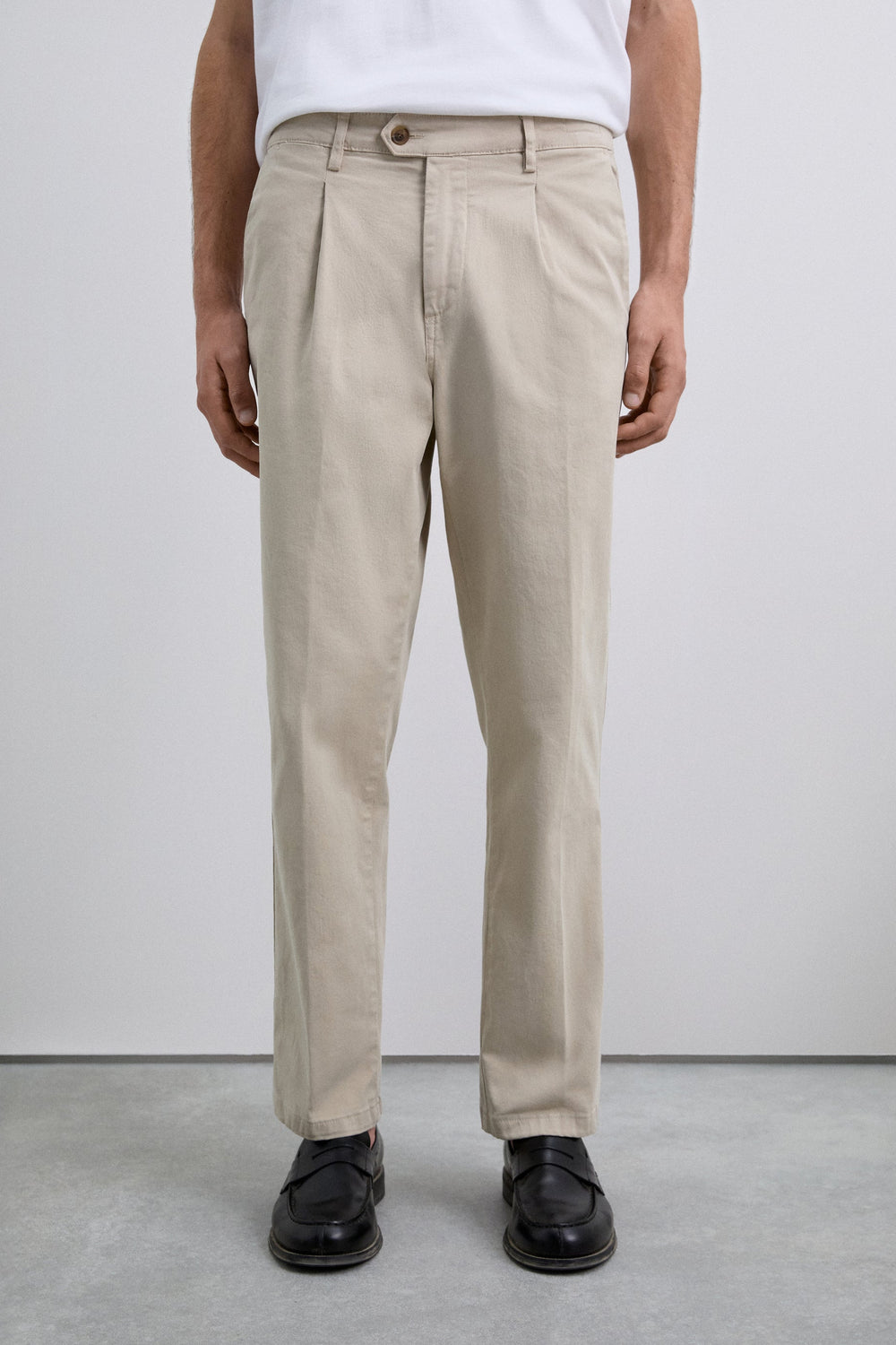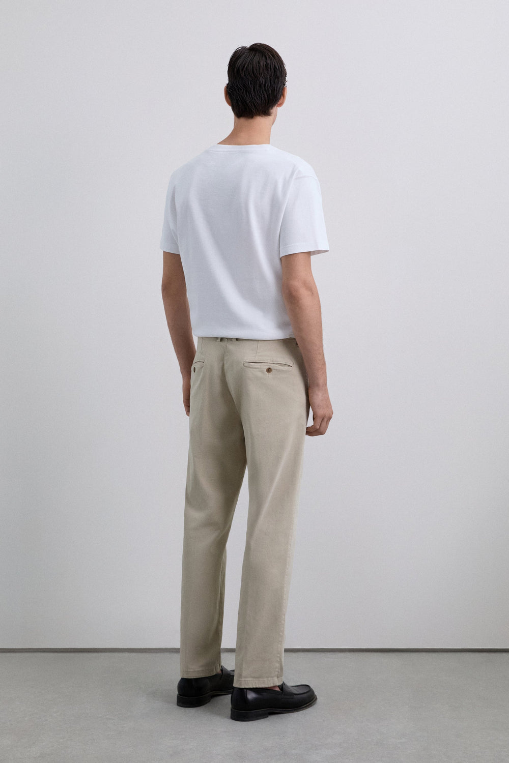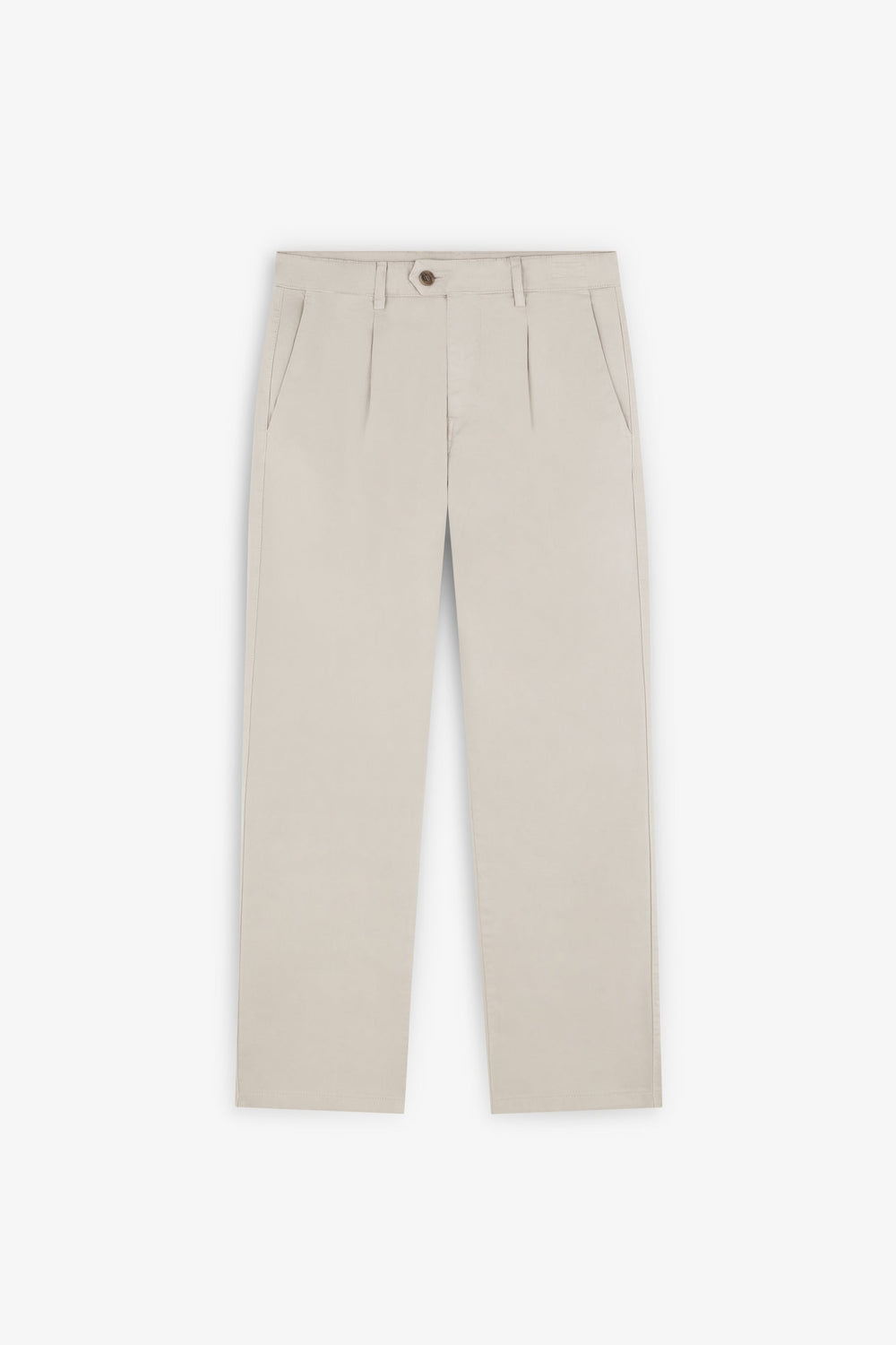 Pantalón chino confeccionado algodón BCI. Corte holgado con pliegues. Cierre mediante cremallera oculta con tapeta y botón en la cintura. Bolsillos laterales y traseros. Trabillas en la cintura.