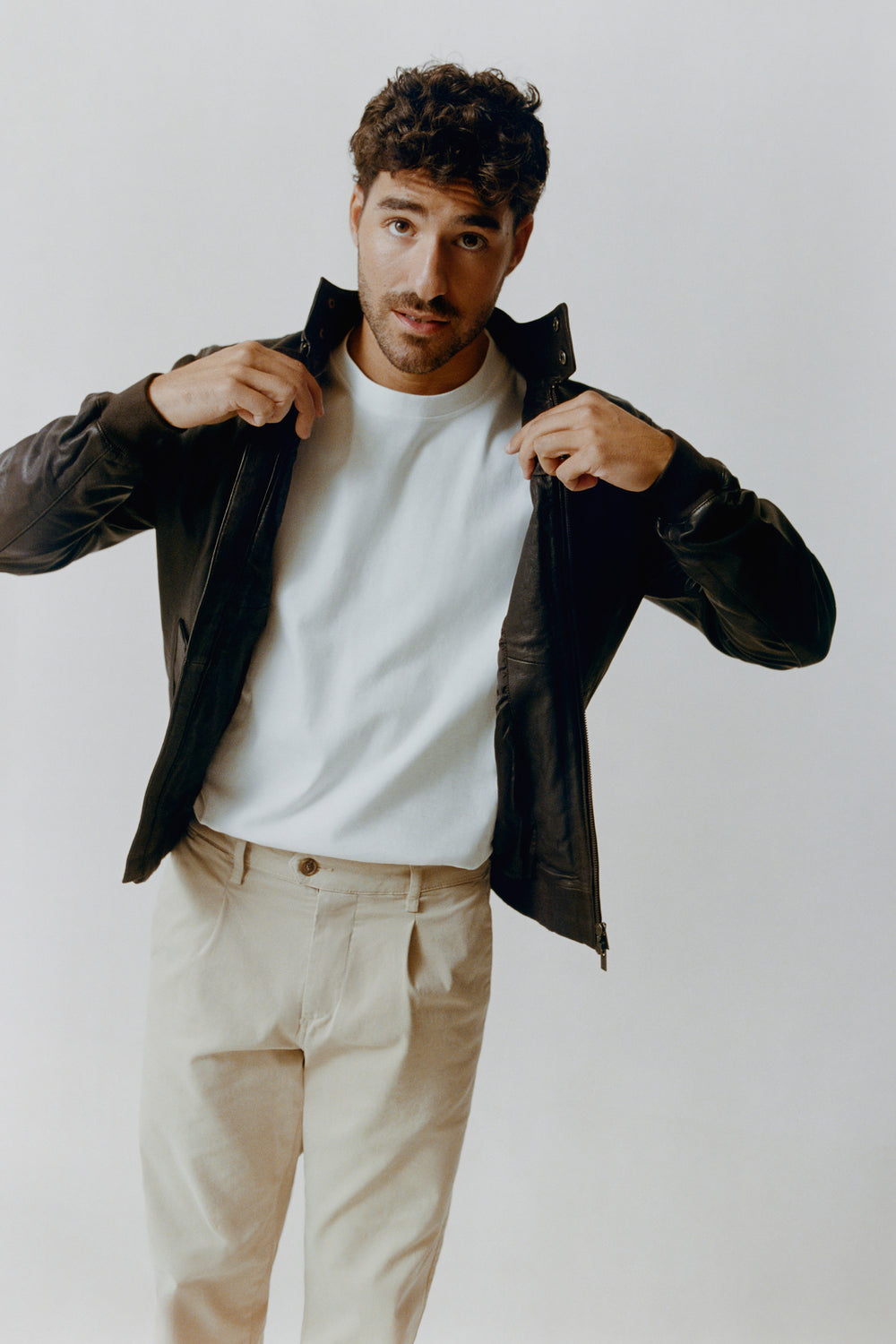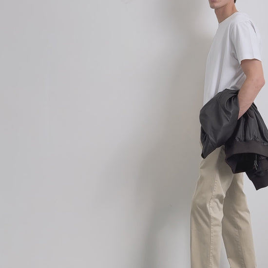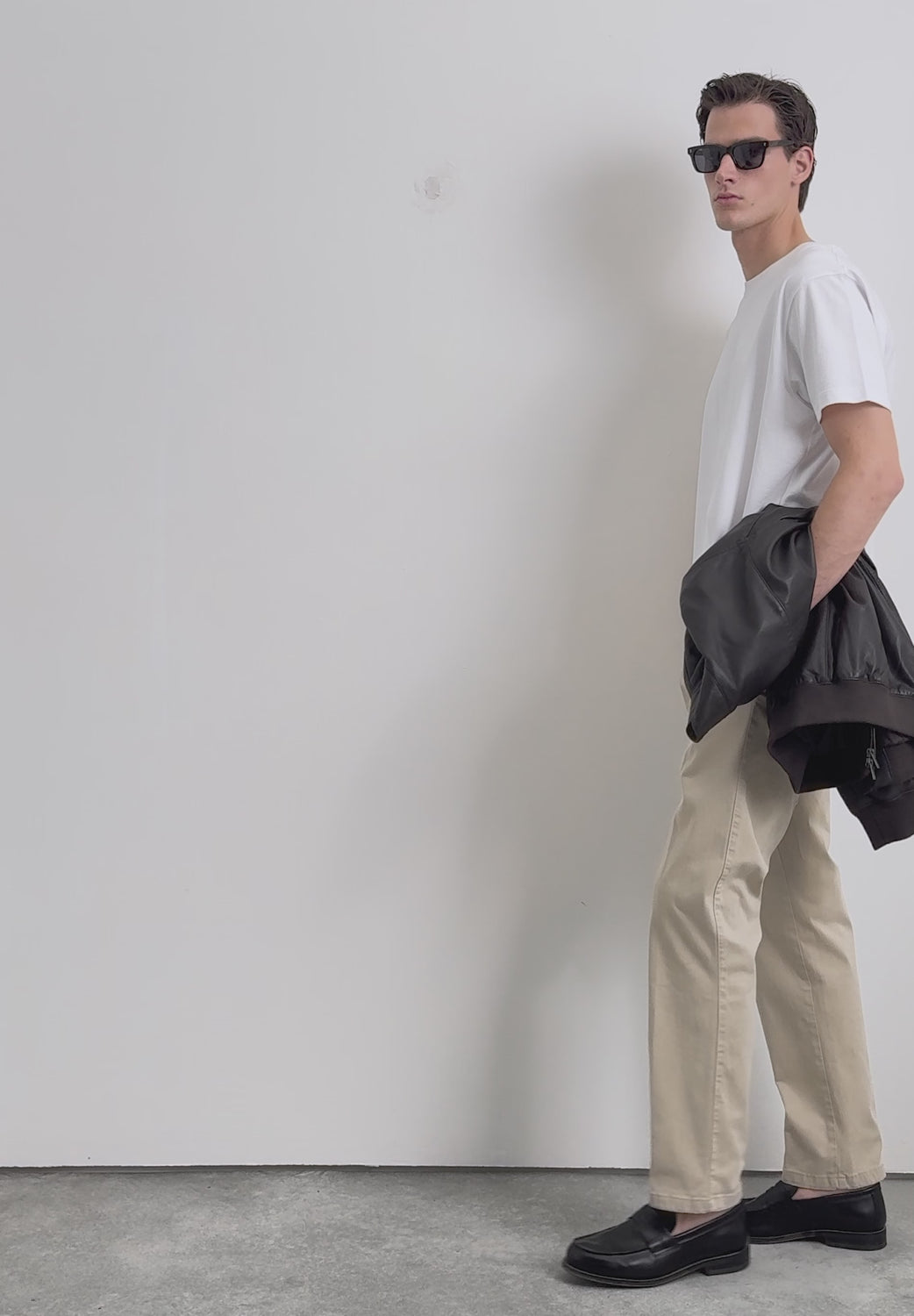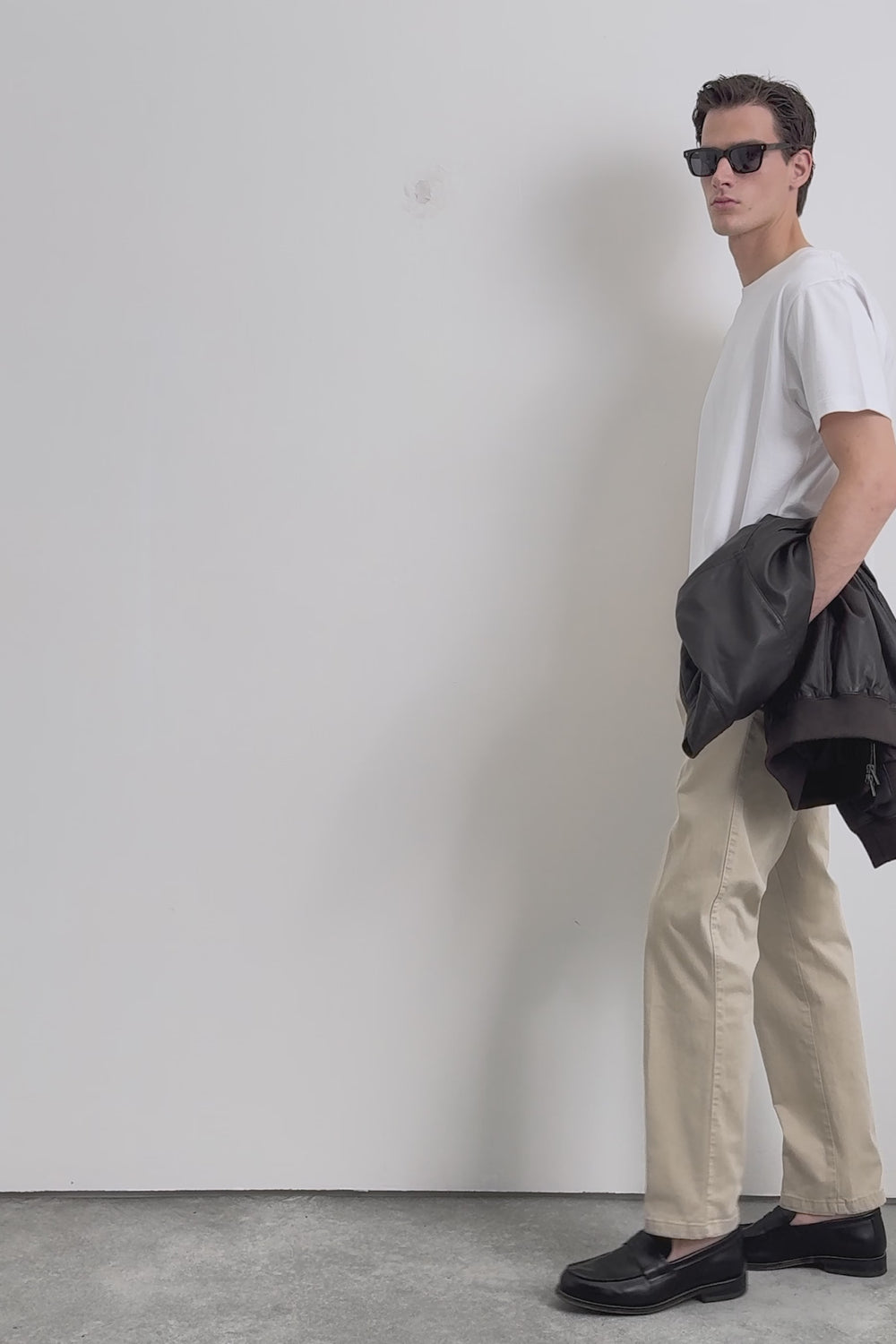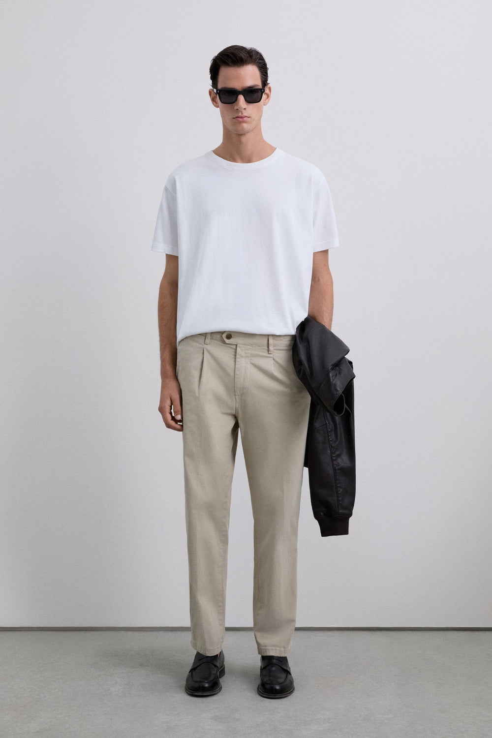 Pantalón chino confeccionado algodón BCI. Corte holgado con pliegues. Cierre mediante cremallera oculta con tapeta y botón en la cintura. Bolsillos laterales y traseros. Trabillas en la cintura.