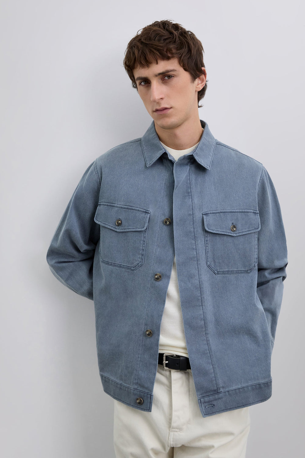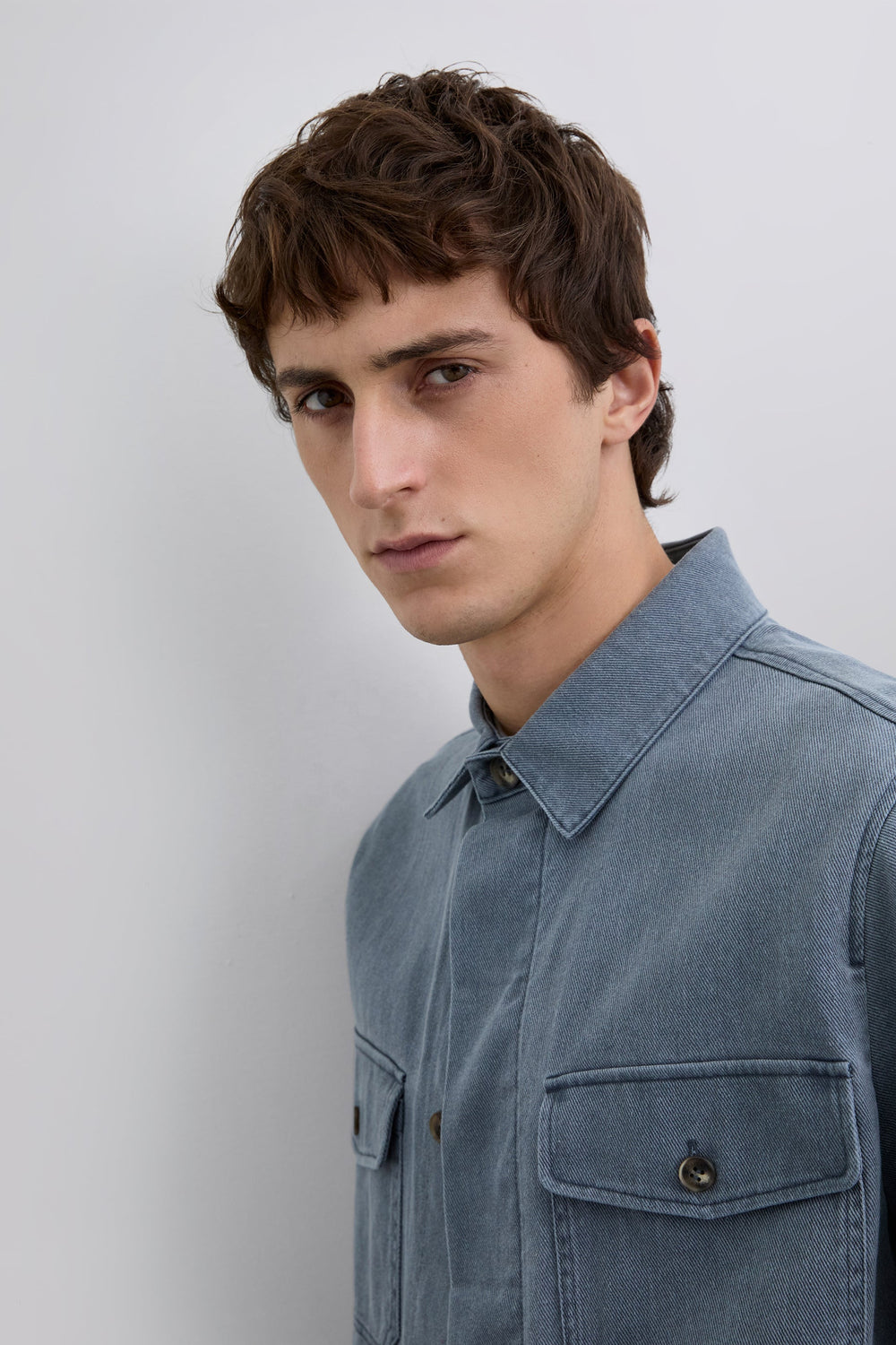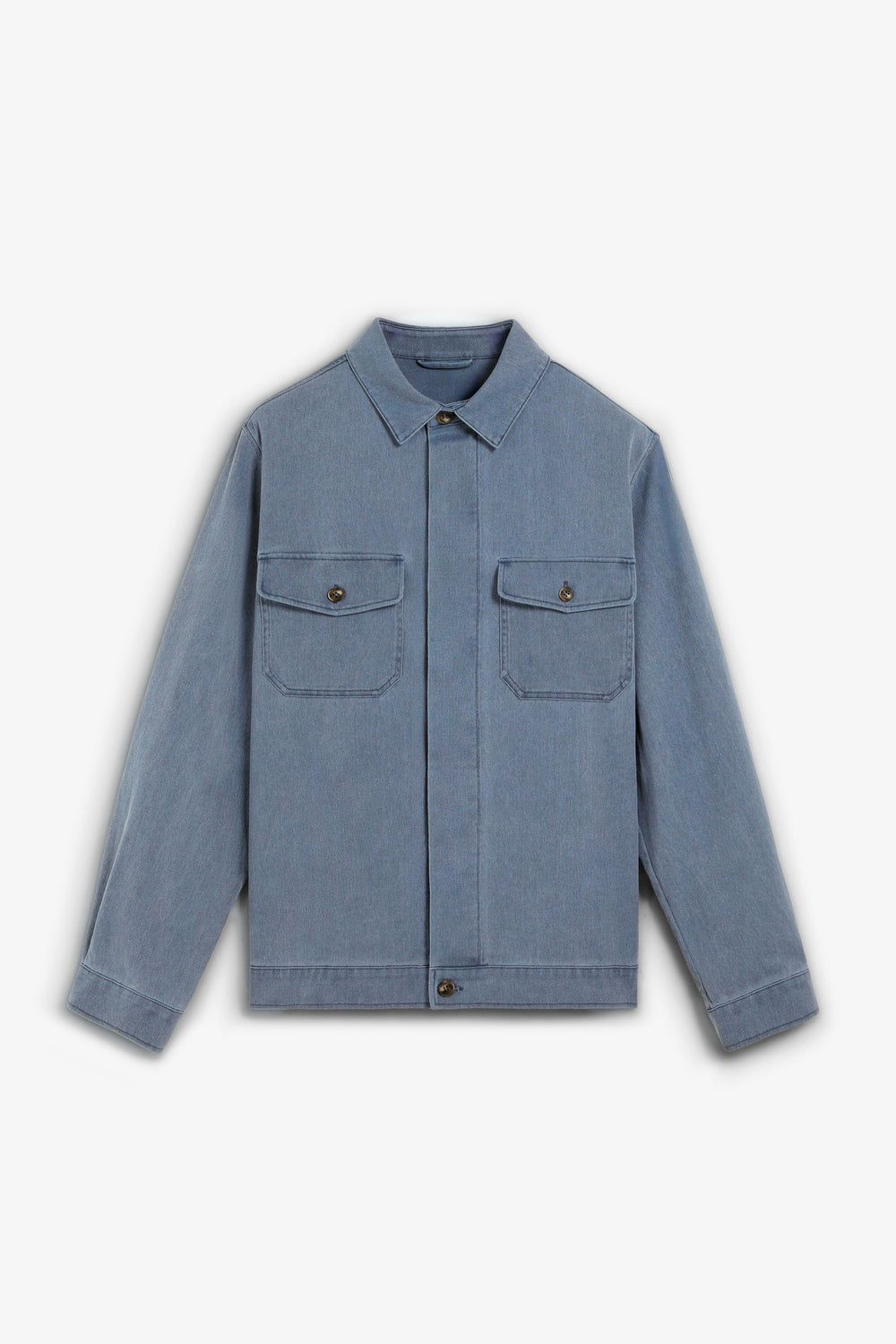 Cazadora confeccionada en 100% algodón reciclado. Efecto lavado. Dos bolsillos de solapa en el pecho con cierre de botón. Cierre delantero mediante abotonadura oculta.