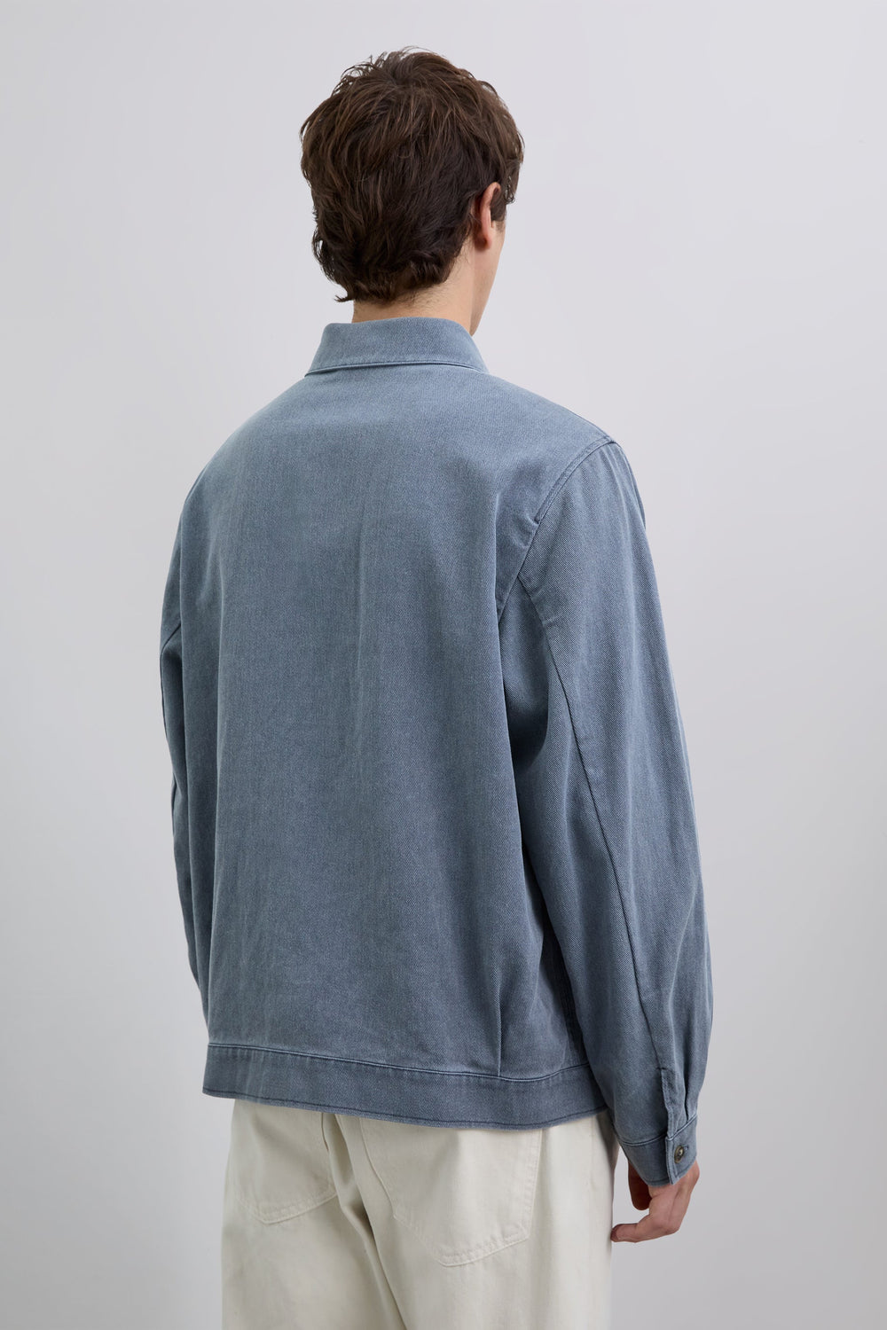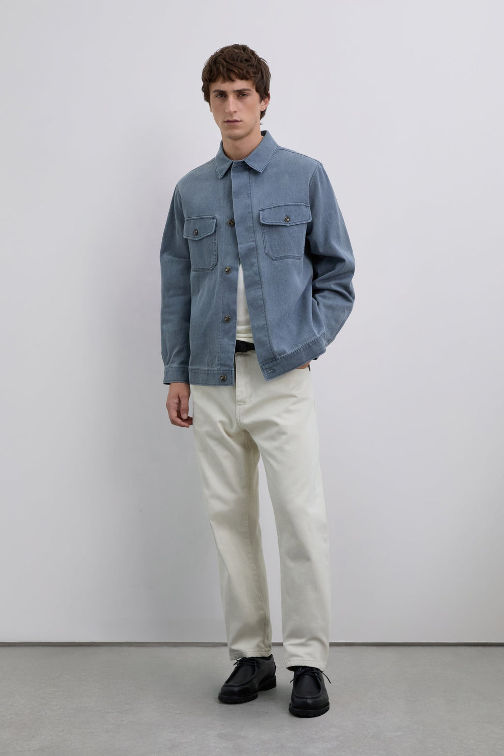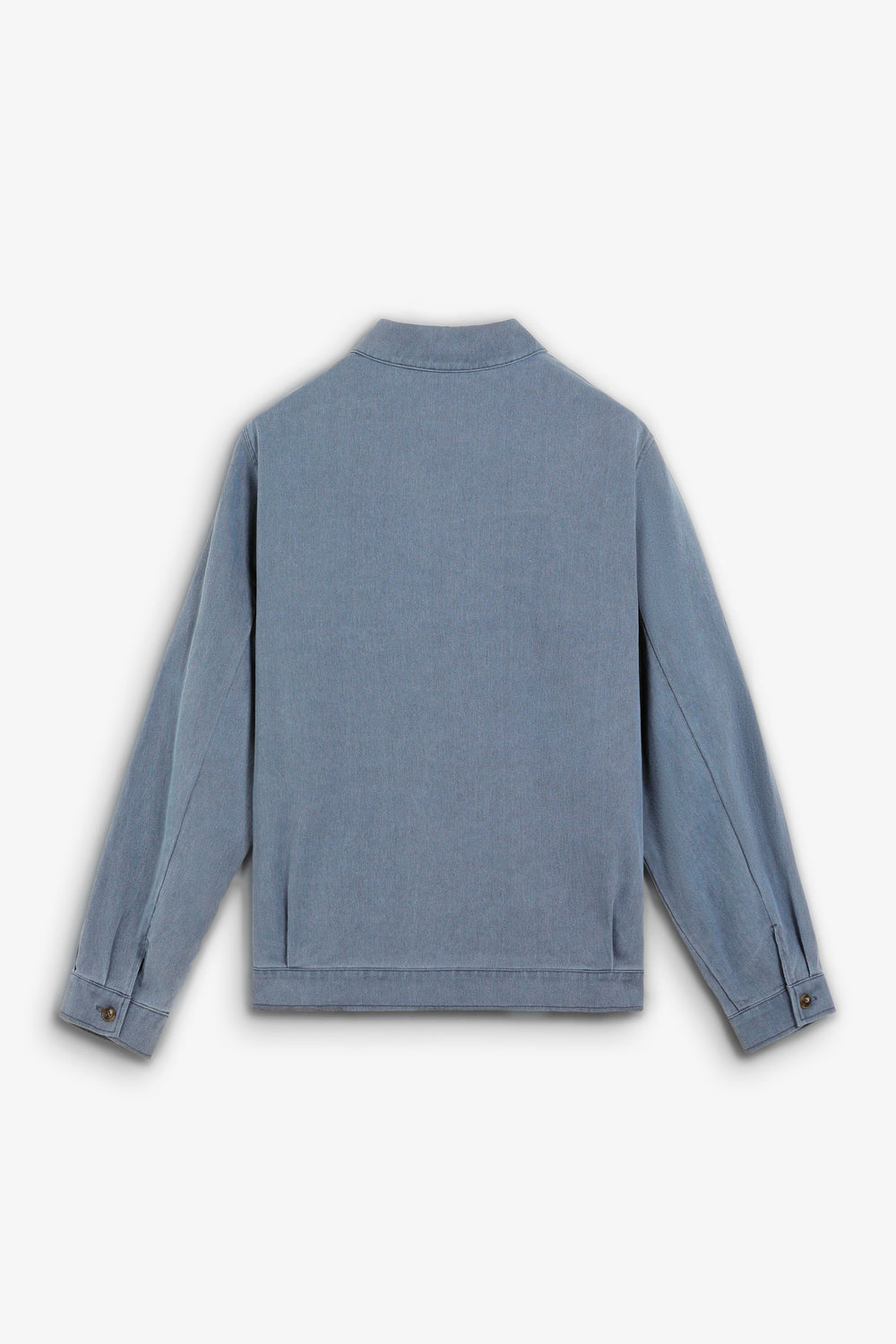 Cazadora confeccionada en 100% algodón reciclado. Efecto lavado. Dos bolsillos de solapa en el pecho con cierre de botón. Cierre delantero mediante abotonadura oculta.